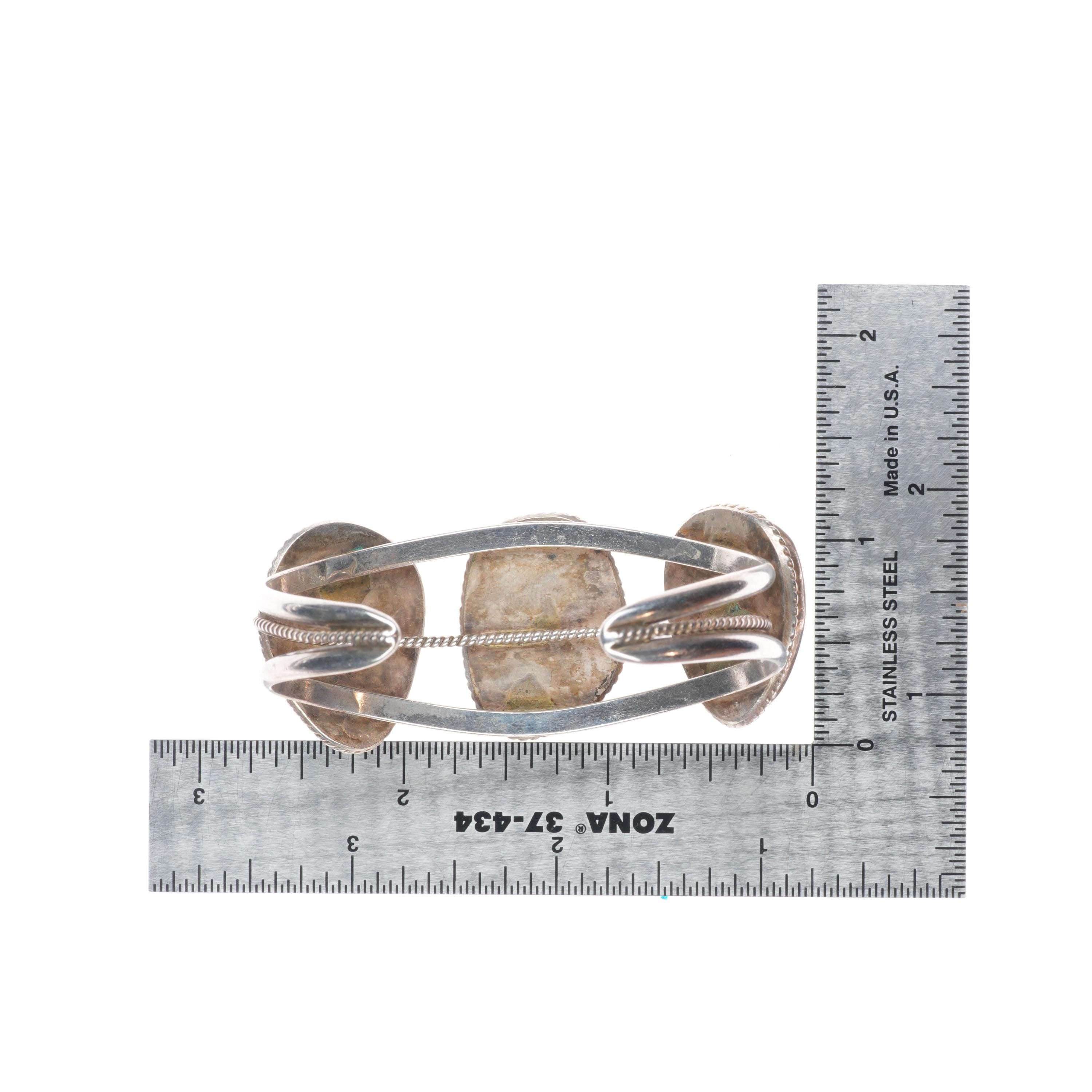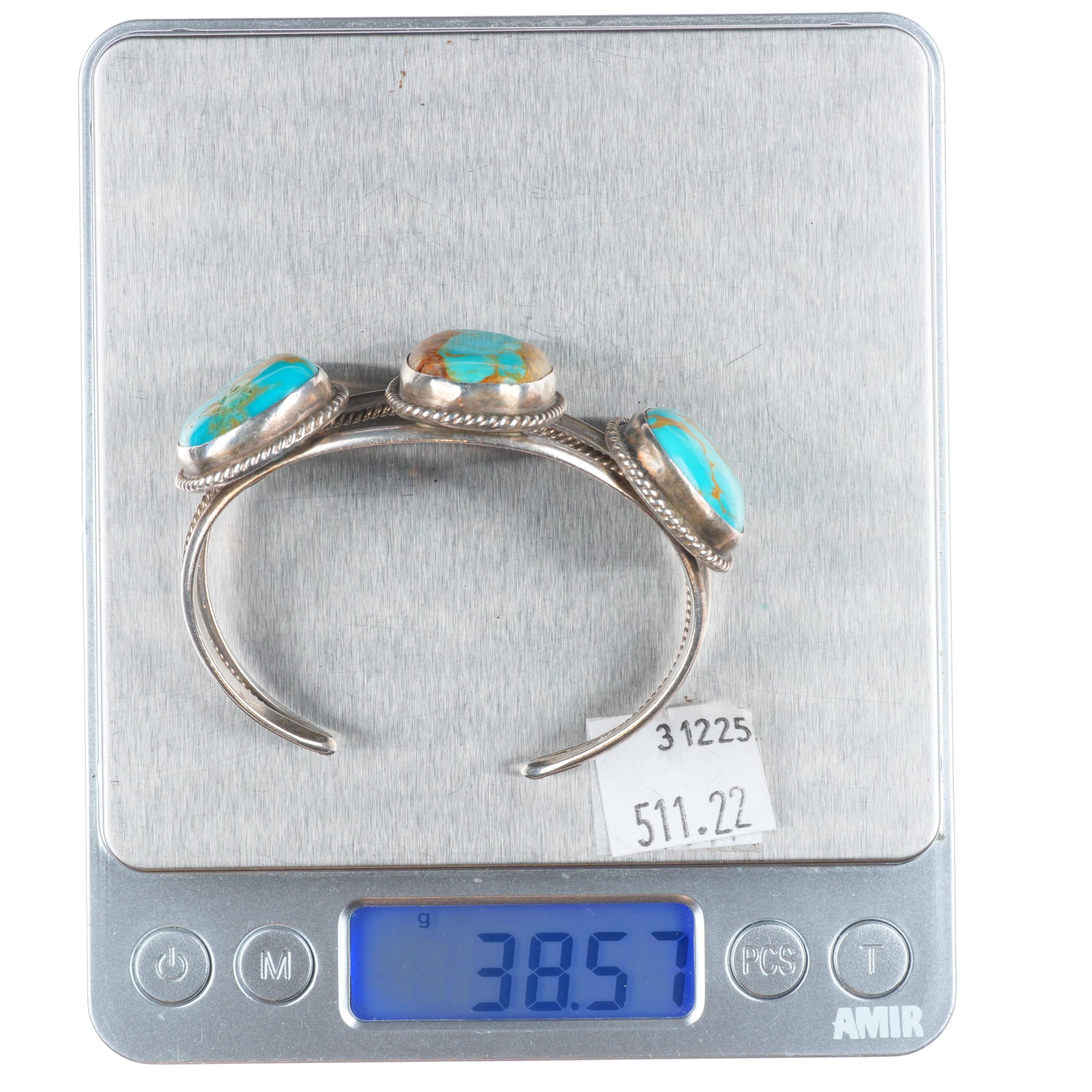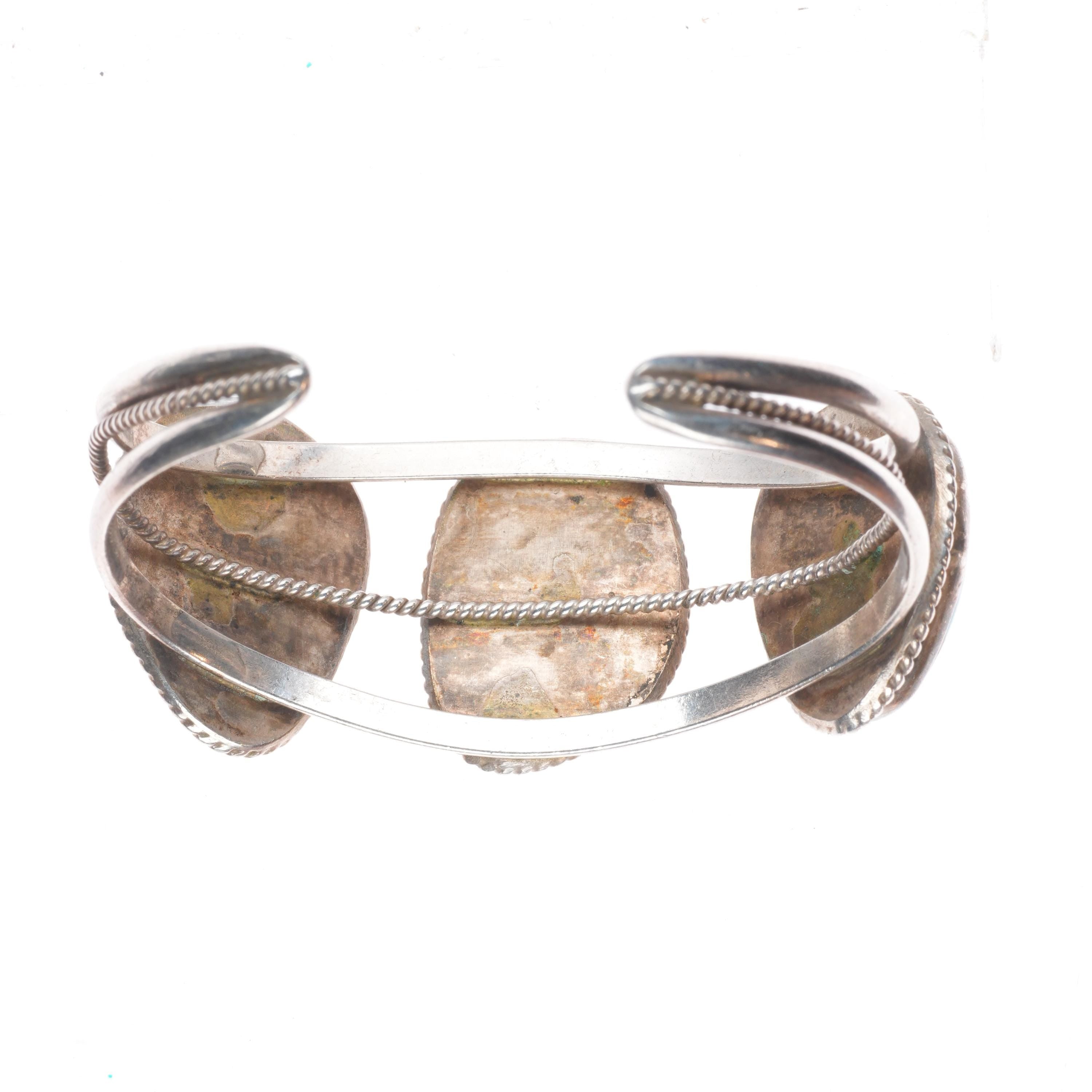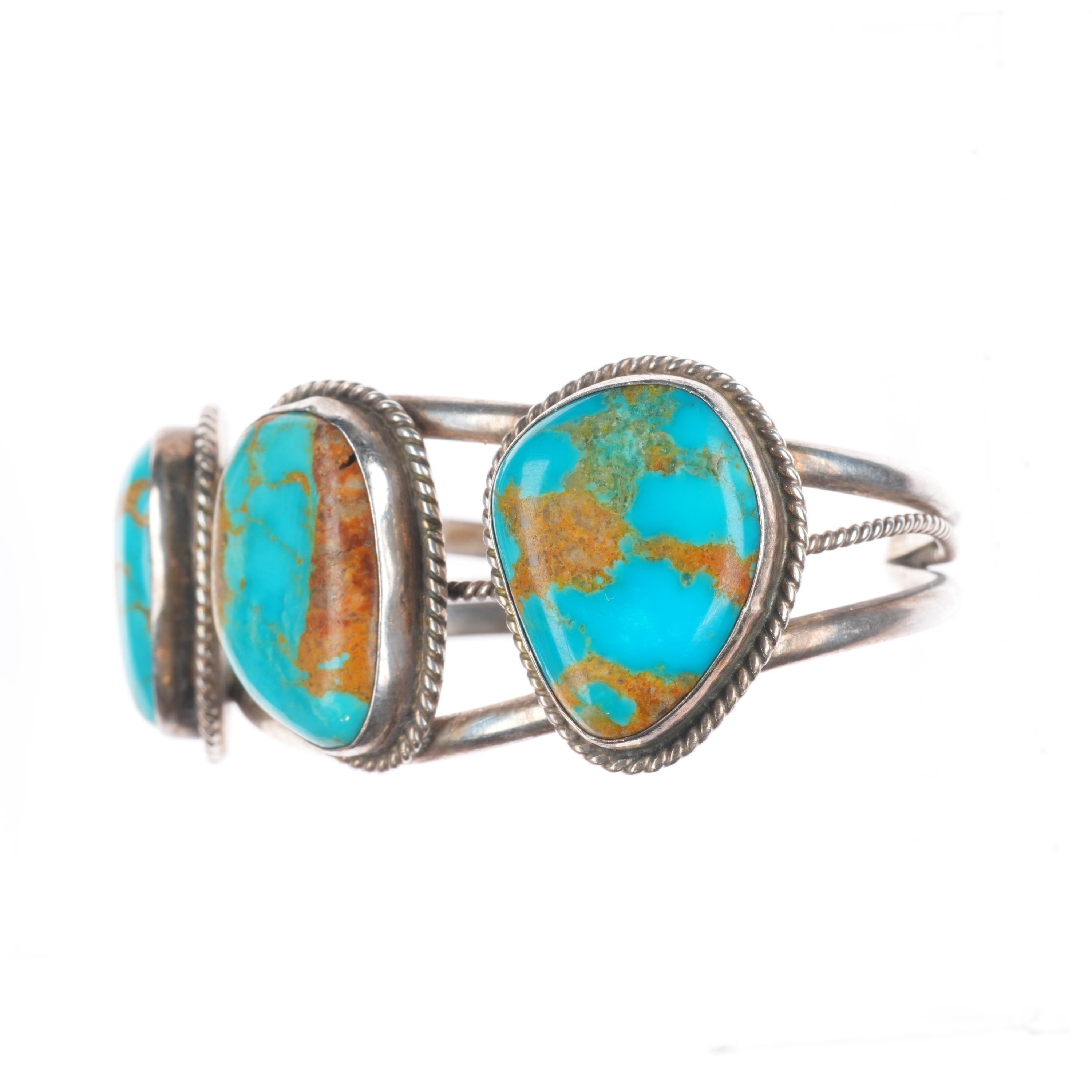 6.1" Vintage Navajo sterling silver 3 large stone turquoise cuff bracelet. Tested and guaranteed solid sterling silver with weight and measurements in pictures. Circa third quarter of the 20th century with some expected age appropriate wear.