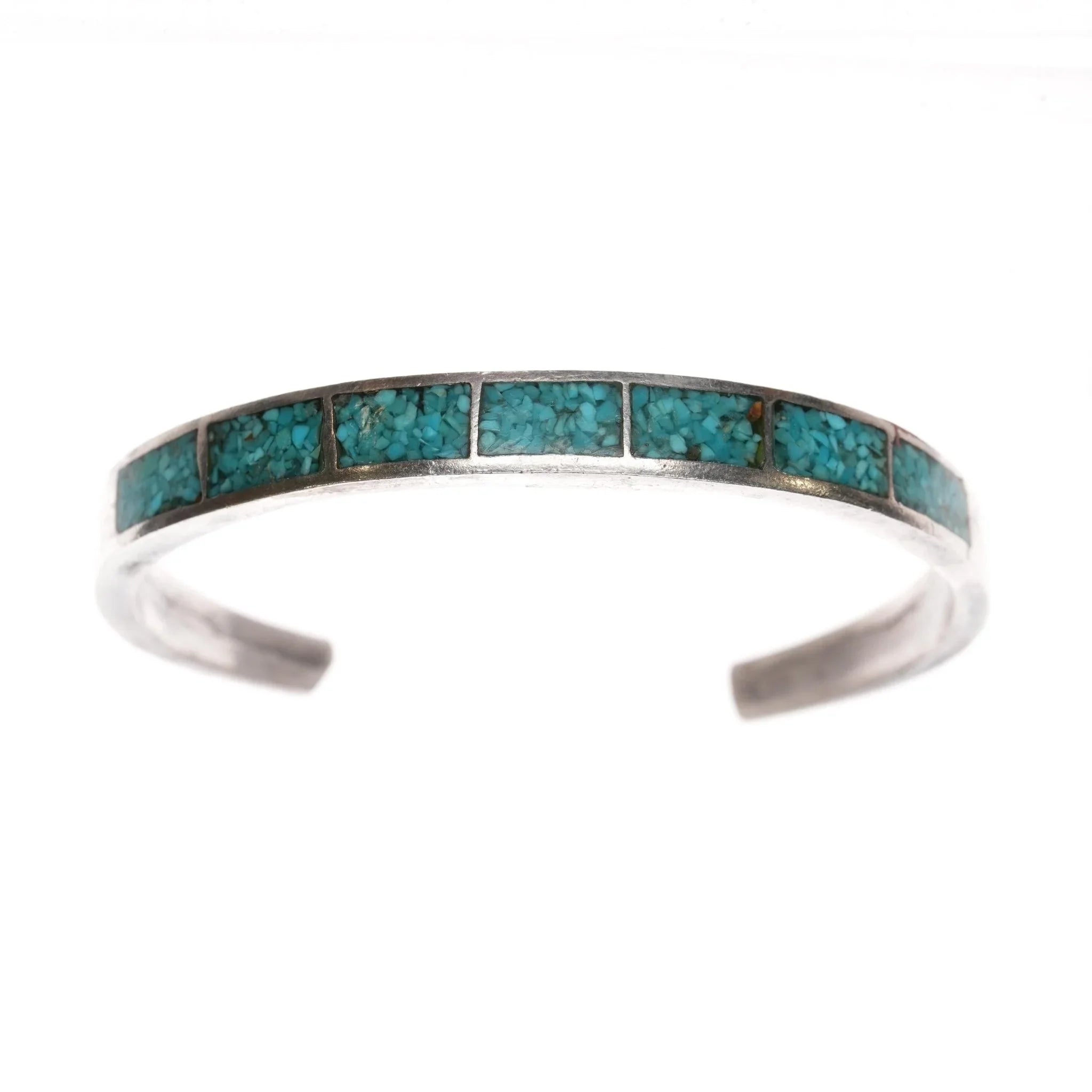 6" 1970‘s Sturdy Navajo sterling chip inlay slim cuff bracelet. Unmarked solid sterling, weight and measurements in pics.