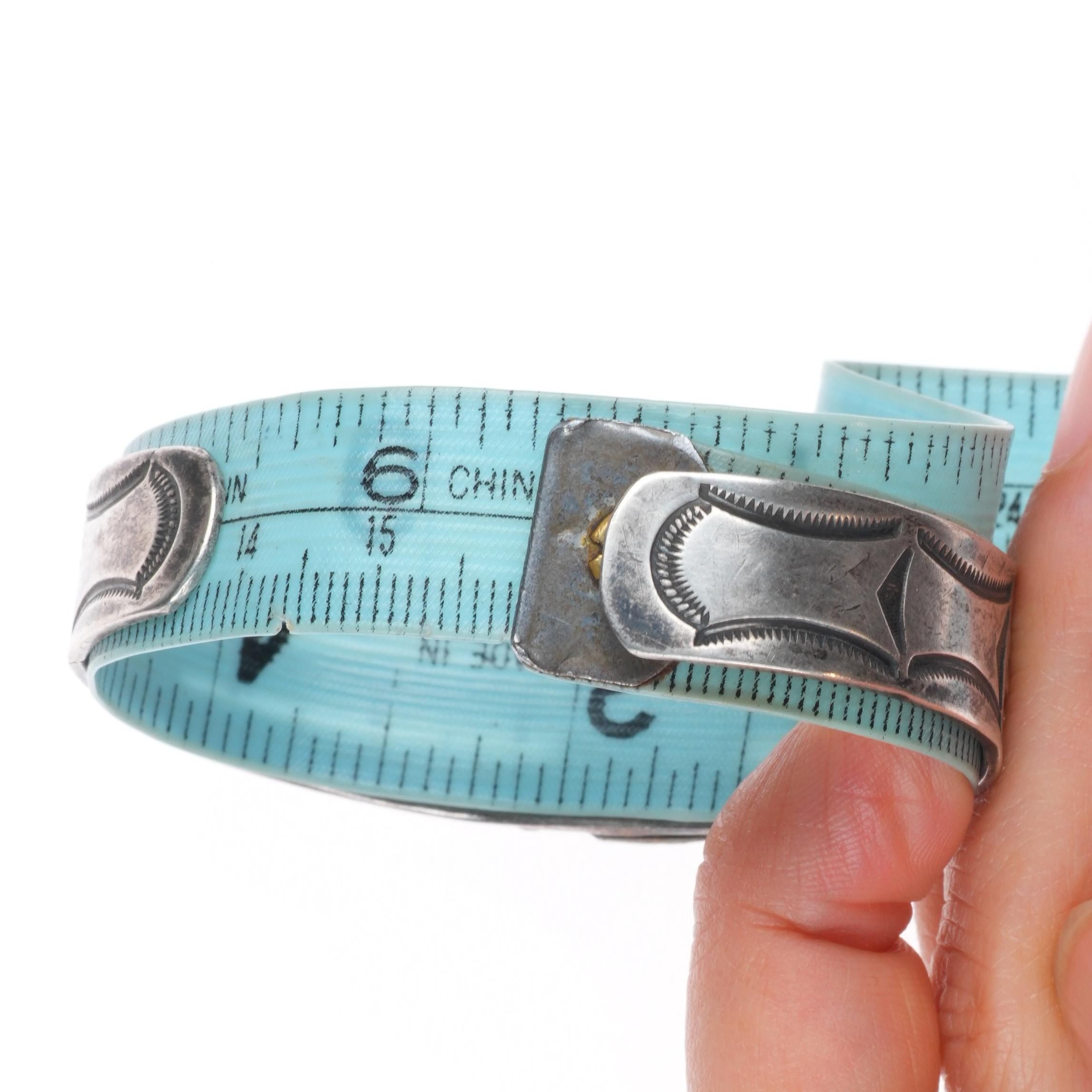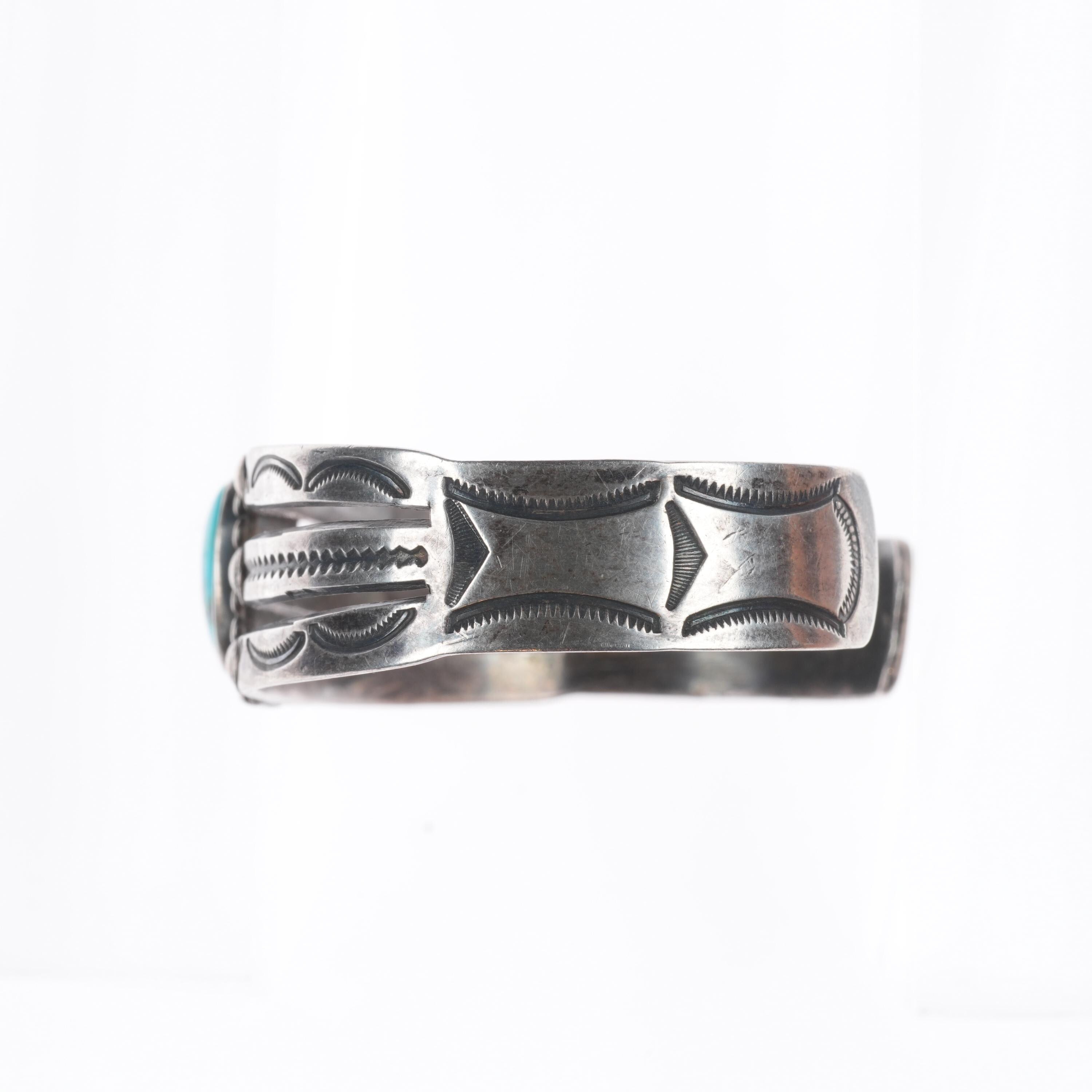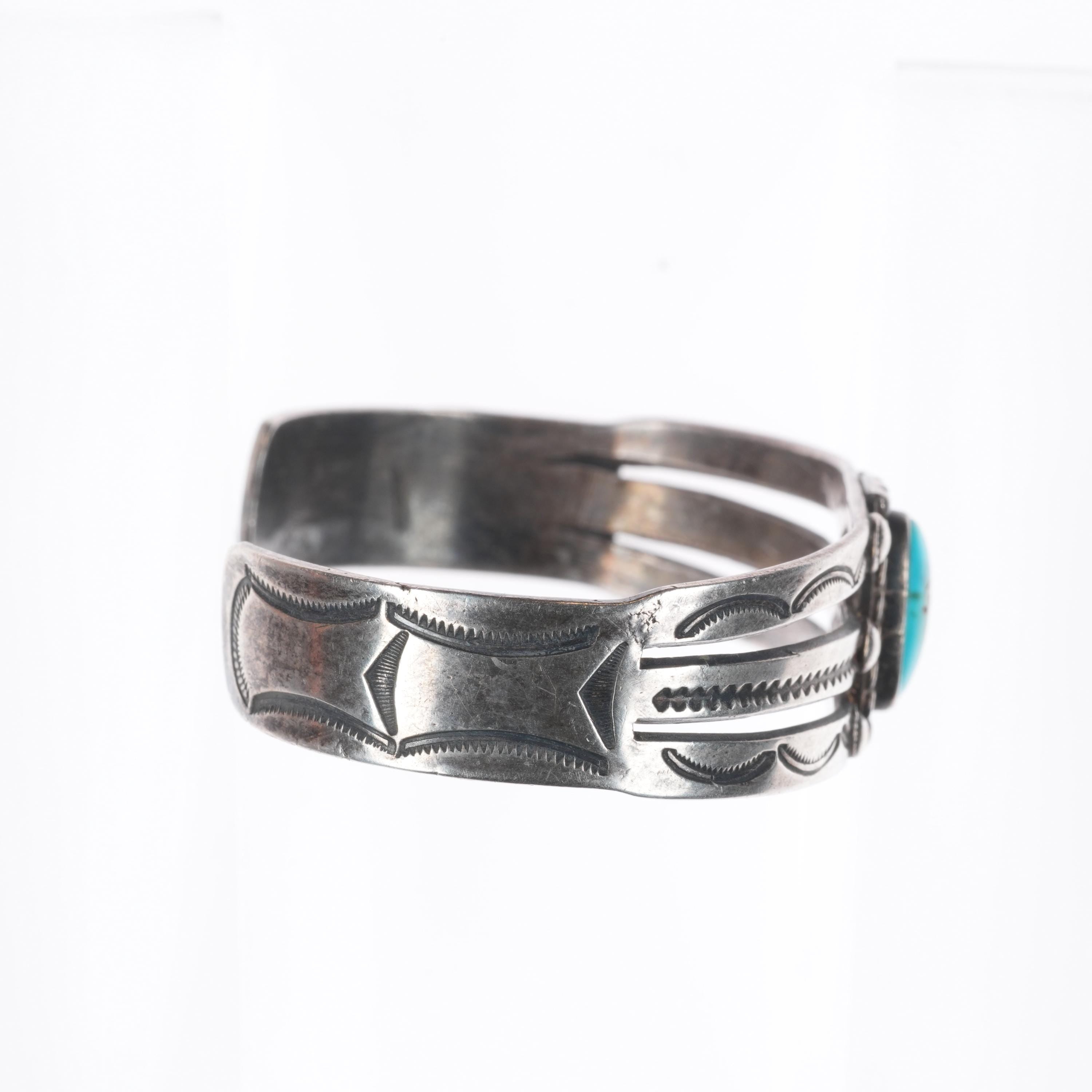 6.2" c1940 Navajo sterling silver hand stamped cuff bracelet with nice turquoise. Tested and guaranteed solid sterling silver with weight and measurements in pictures. Circa second quarter of the 20th century with age appropriate wear..