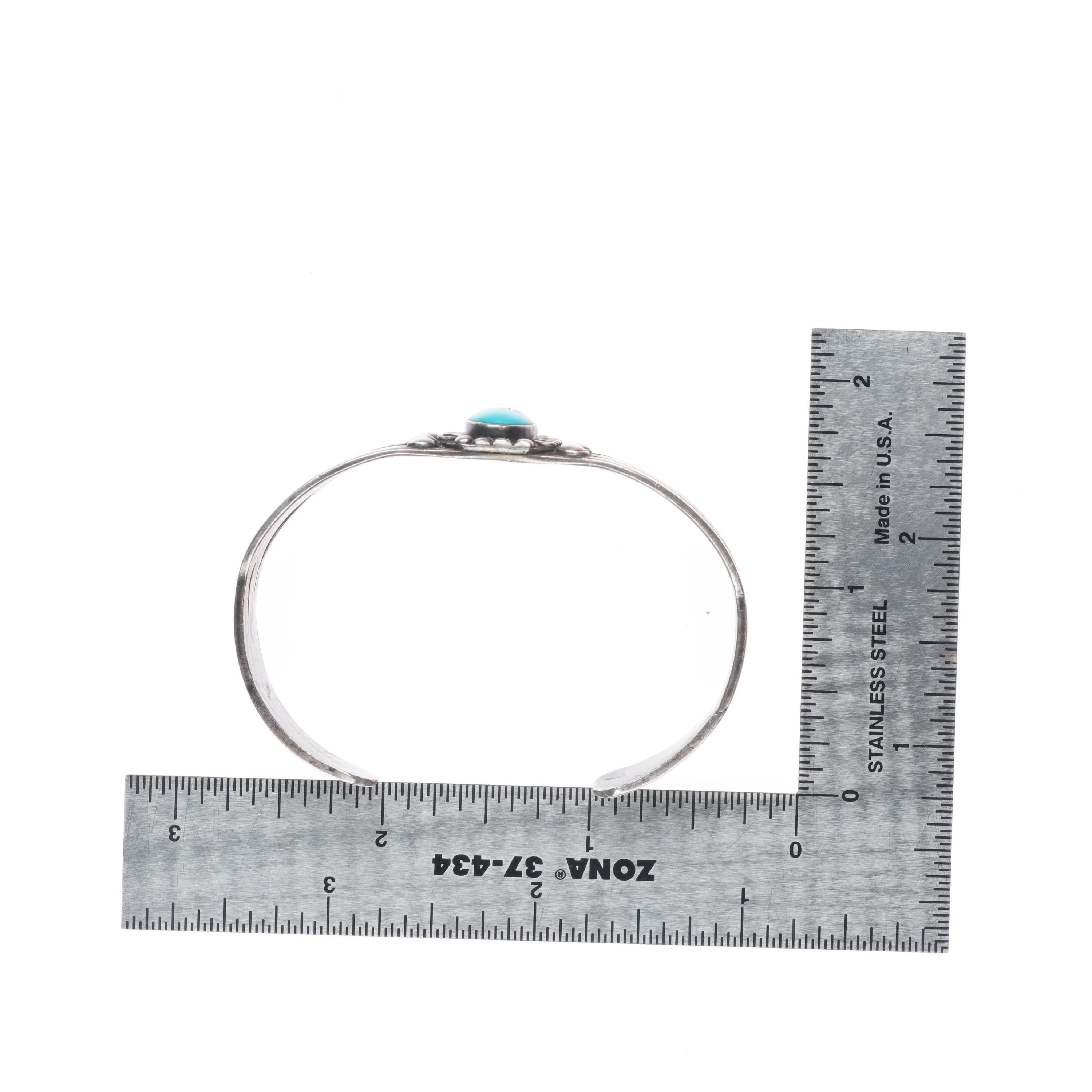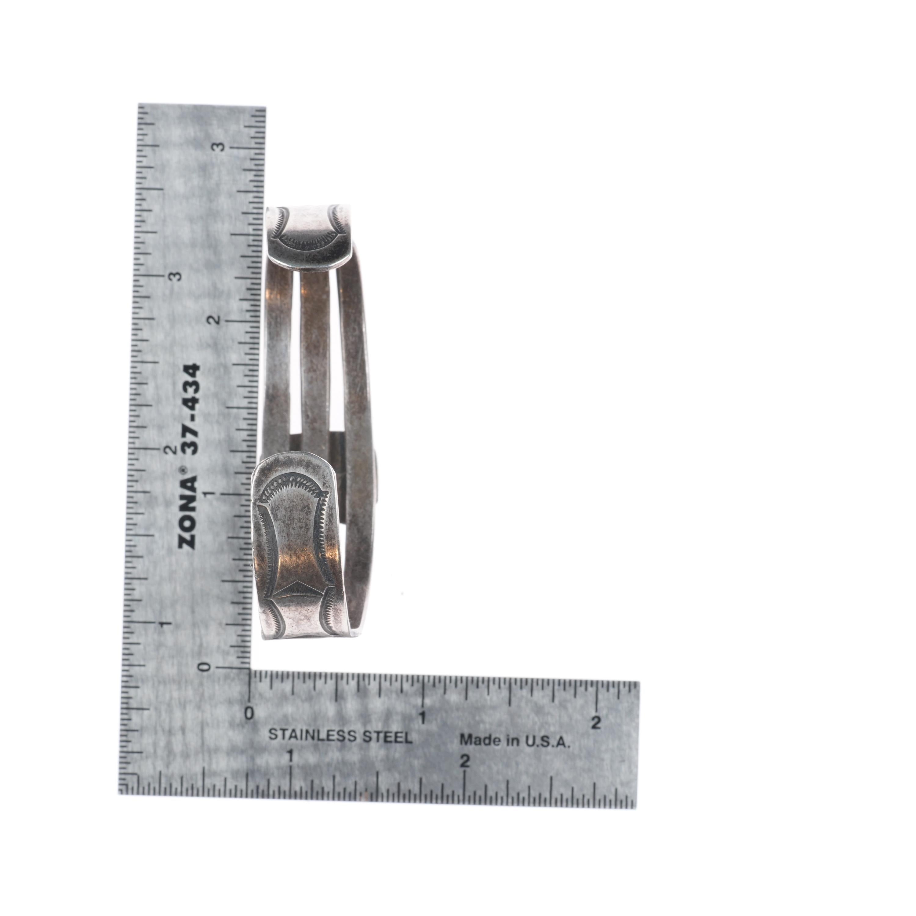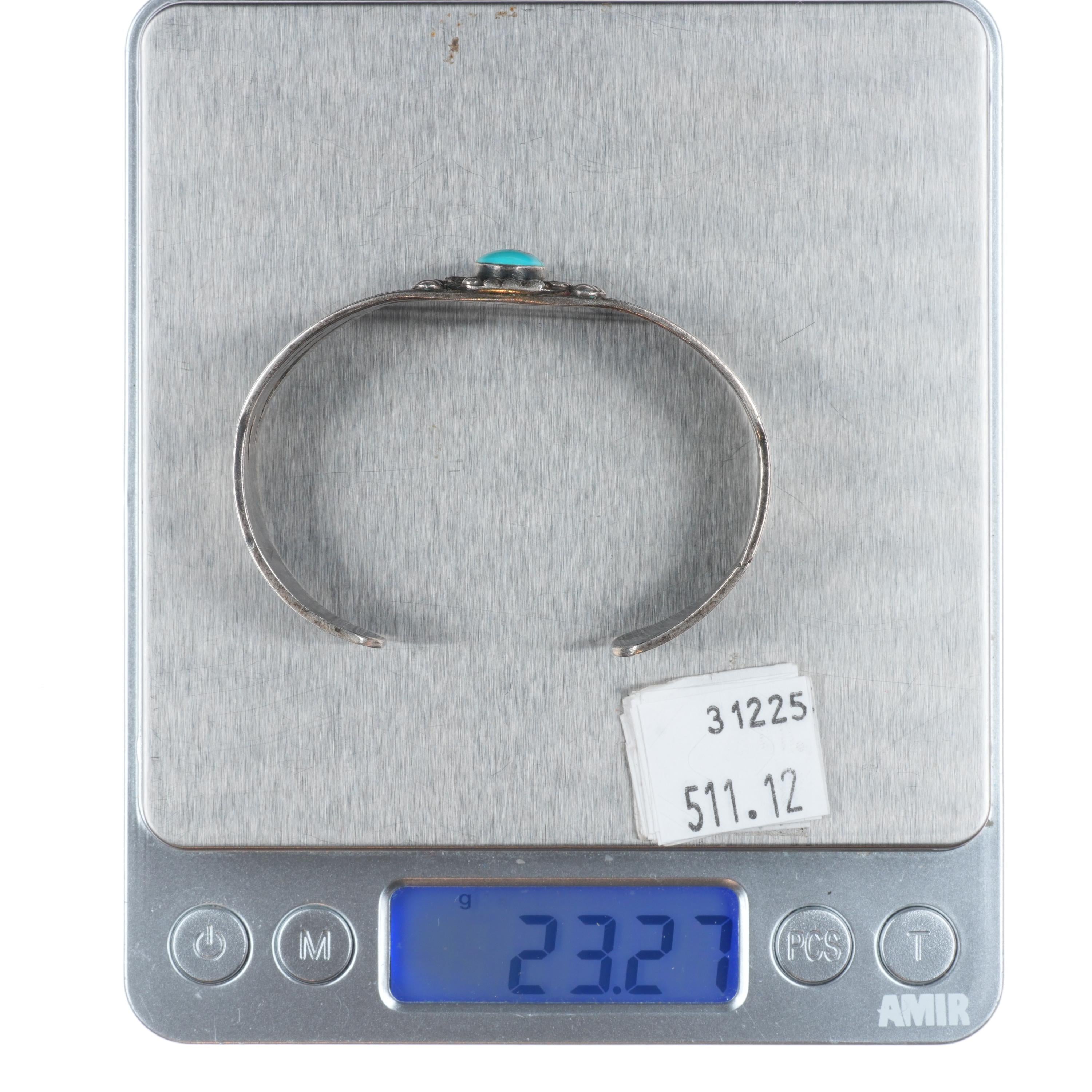 6.2" c1940 Navajo sterling silver hand stamped cuff bracelet with nice turquoise. Tested and guaranteed solid sterling silver with weight and measurements in pictures. Circa second quarter of the 20th century with age appropriate wear..