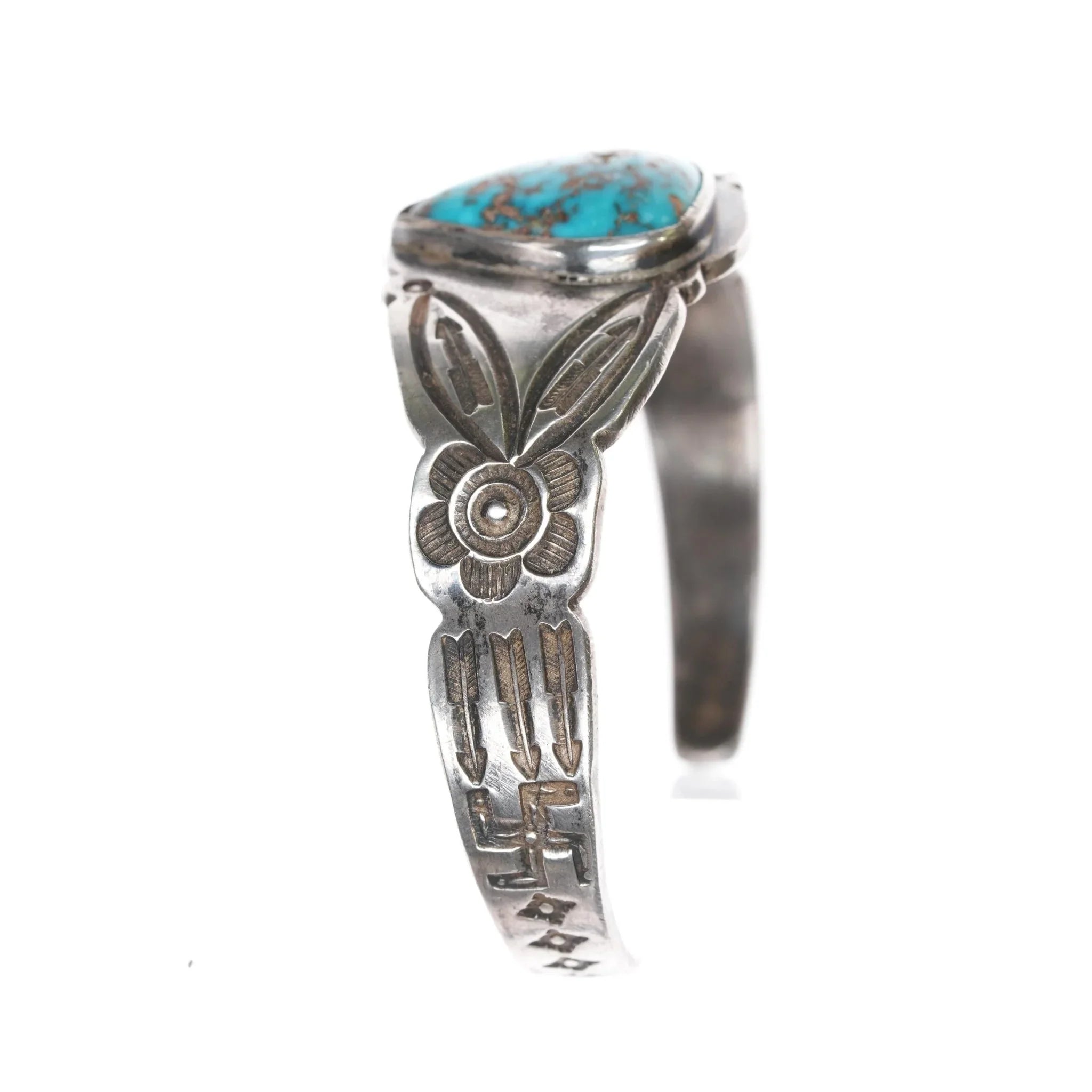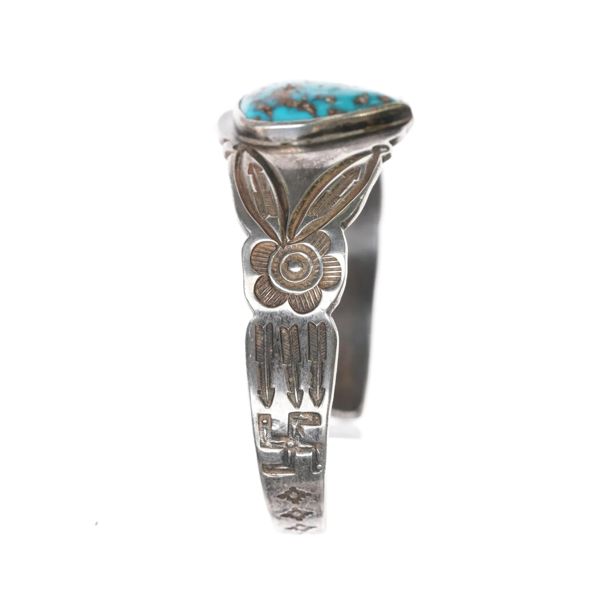 6.25" c1930‘s Navajo silver whirling logs high grade turquoise cuff bracelet. No issues, weight and measurements in pics. Unmarked other than trader/pawn code on reverse side.