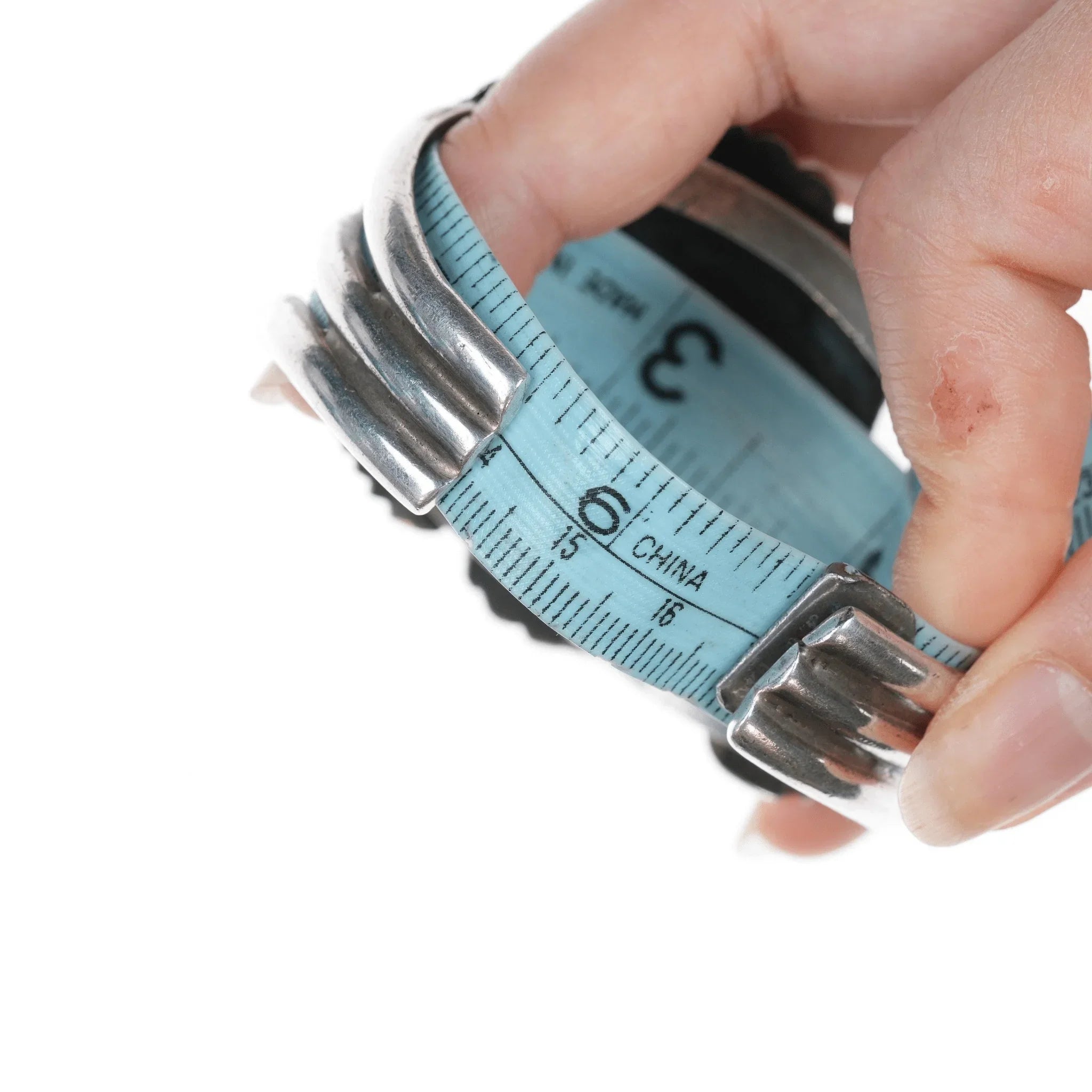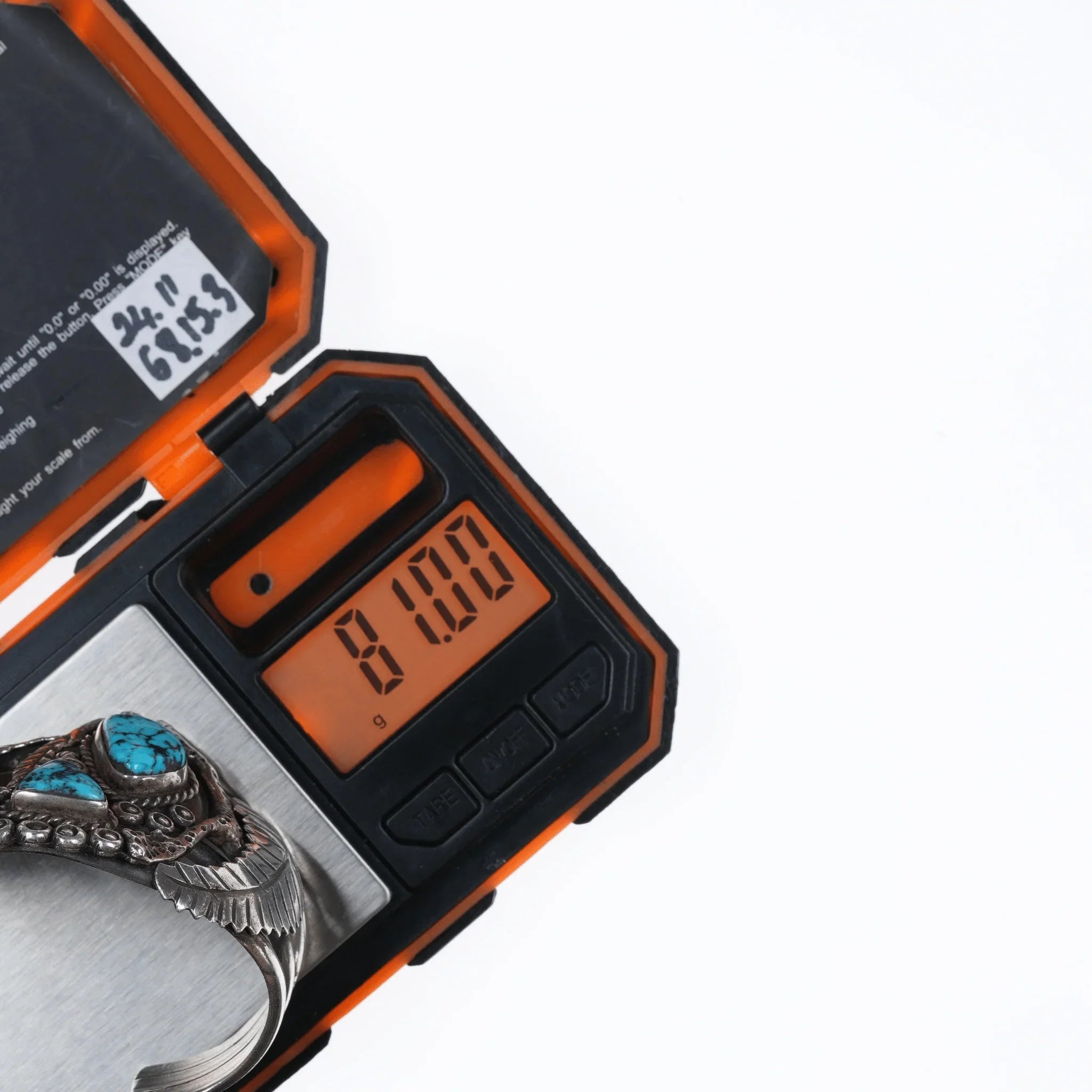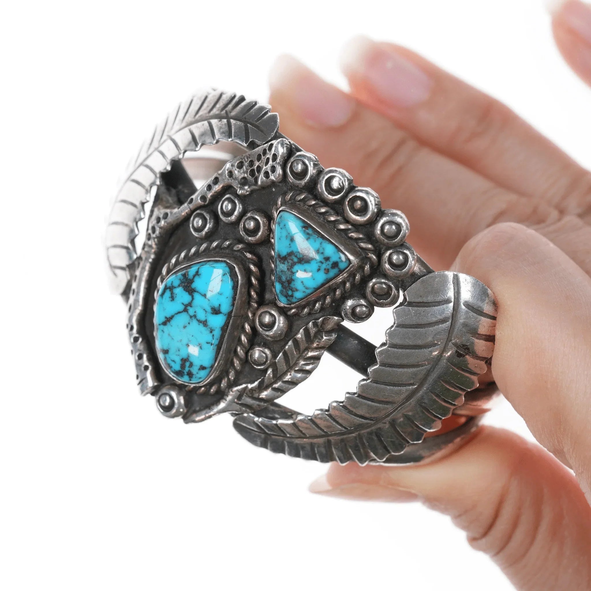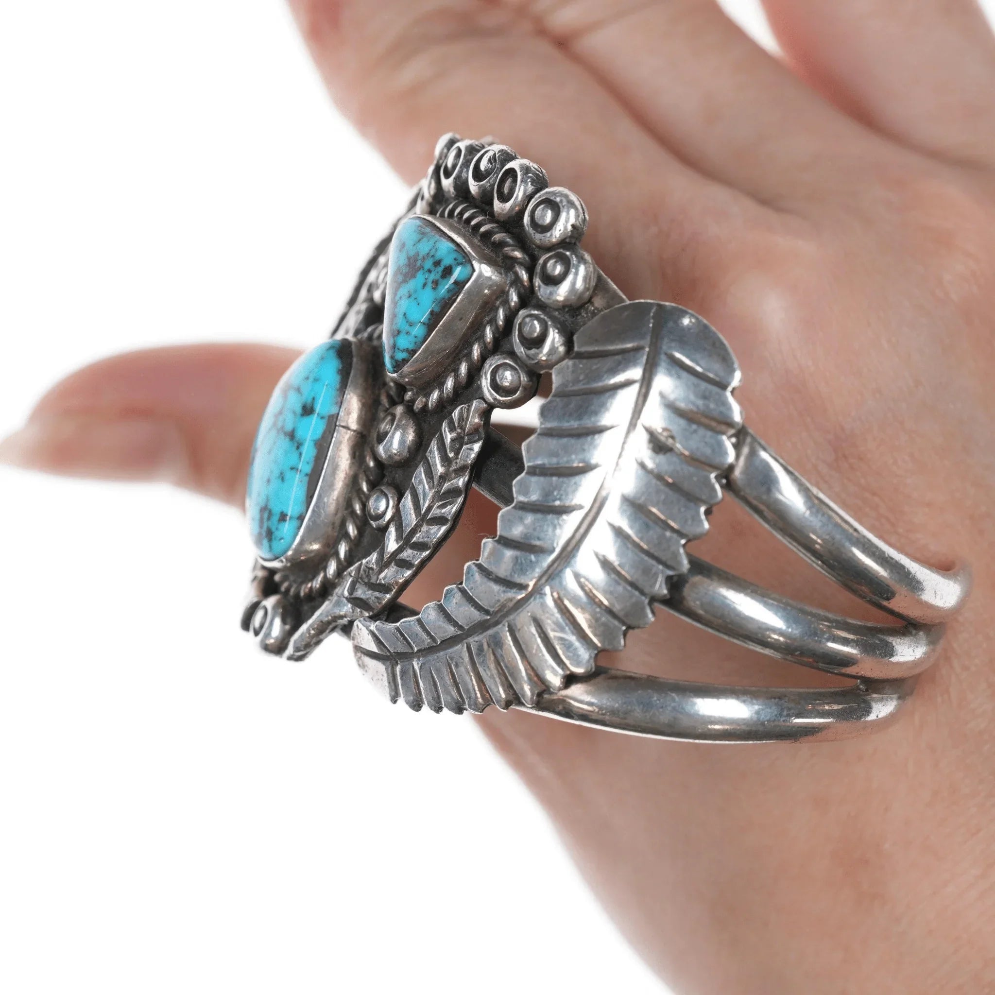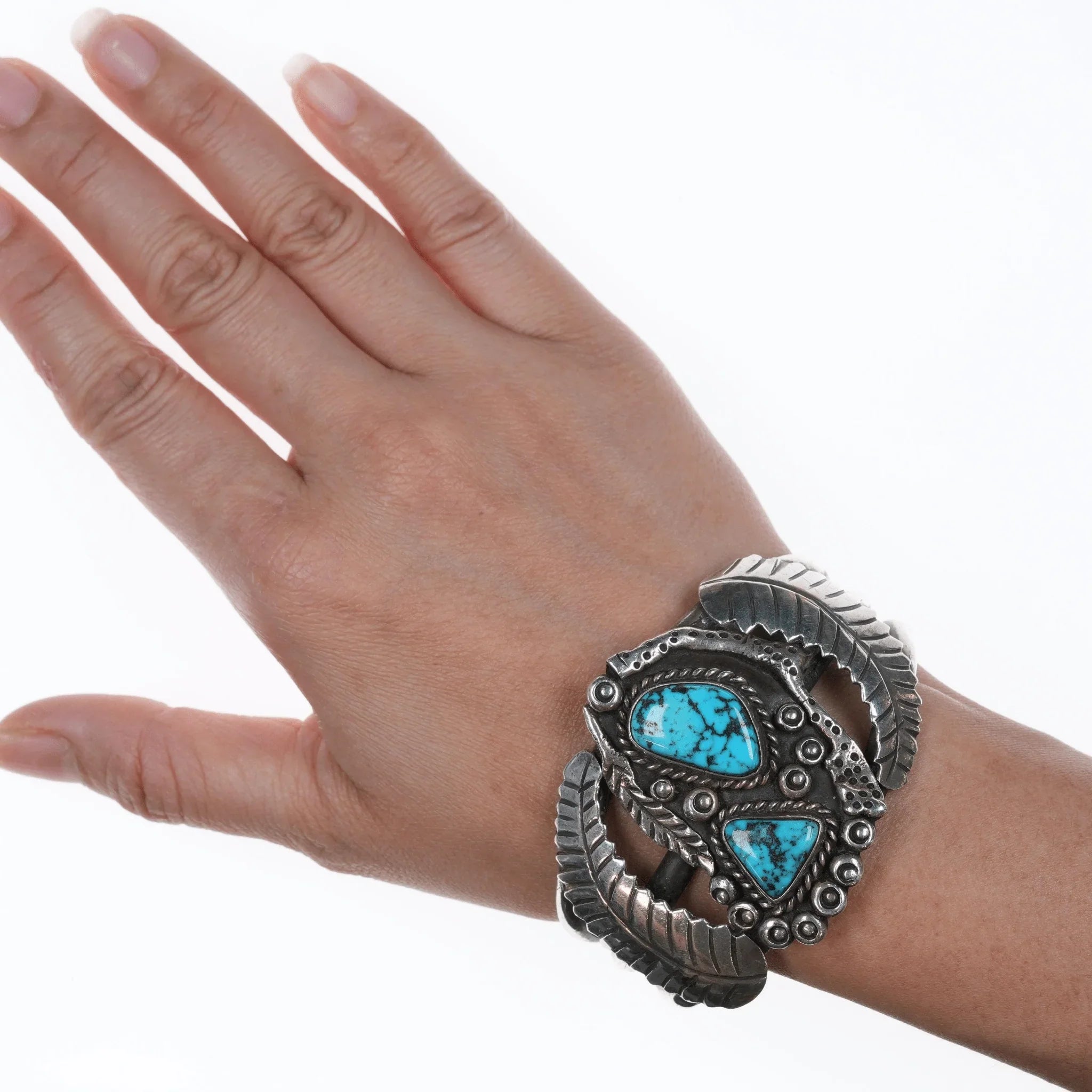 6.25" Vintage Navajo Silver cuff bracelet with two turquoise and leaves. Marked or<br>unmarked as shown in pics, weight and other measurements in pics. Sorry but my<br>jewelry is stored in a secure location and cannot be accessed for more pictures,<br>videos, or measurements until sold. If you look at pictures/description your<br>question should be answered. Thank you so much for your time and consideration!<br><br>All precious metals are tested and guaranteed. A Native American jewelry piece referred to as "silver" or "ingot" is guaranteed to be at least 90% silver. Bracelets are photographed on a 6" women's wrist.