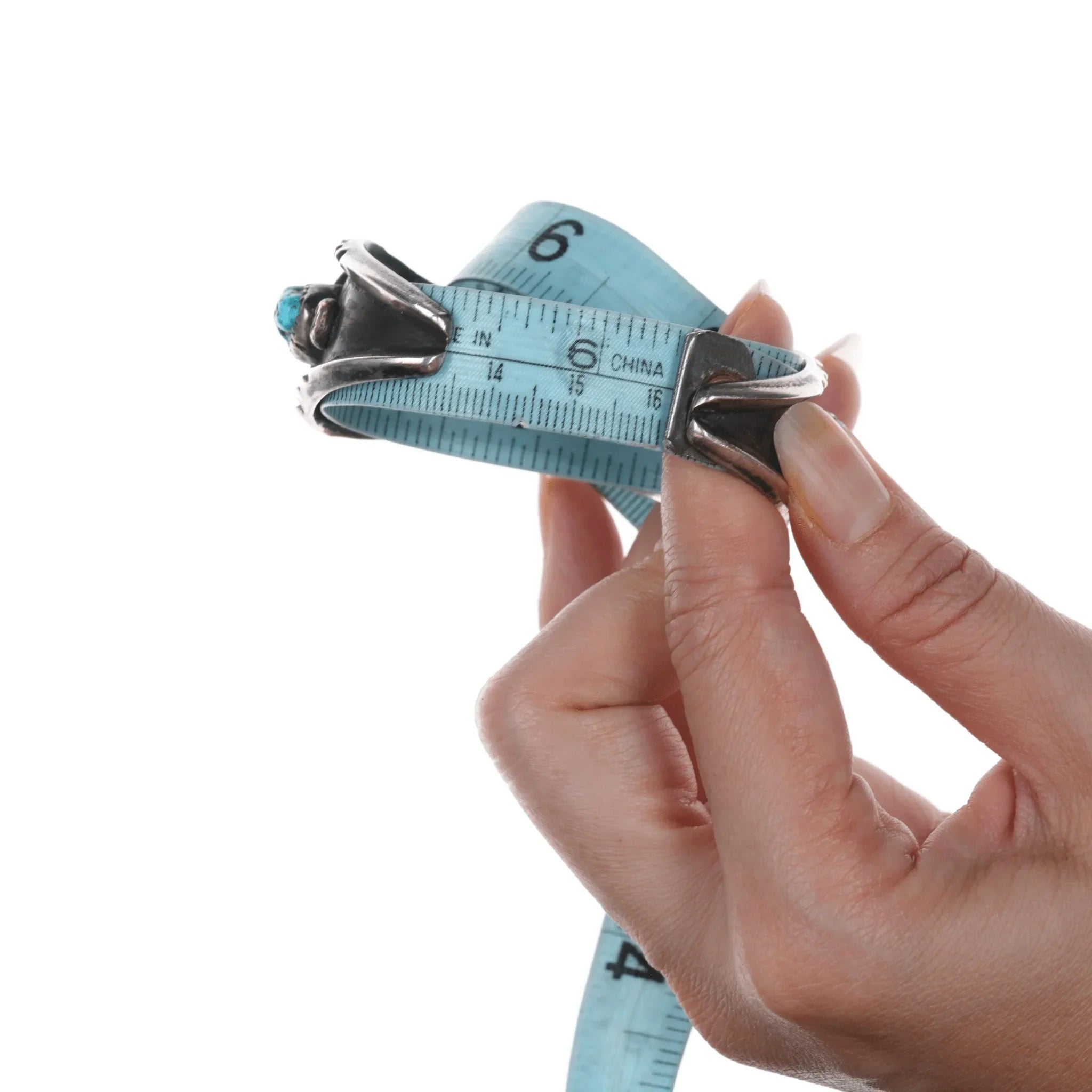 6 3/8" 1970's Native American sterling, turquoise, and coral cuff bracelet. This began it's life as a watch cuff and very long ago a bezel was soldered in the center and turquoise put in. Great with no issues.