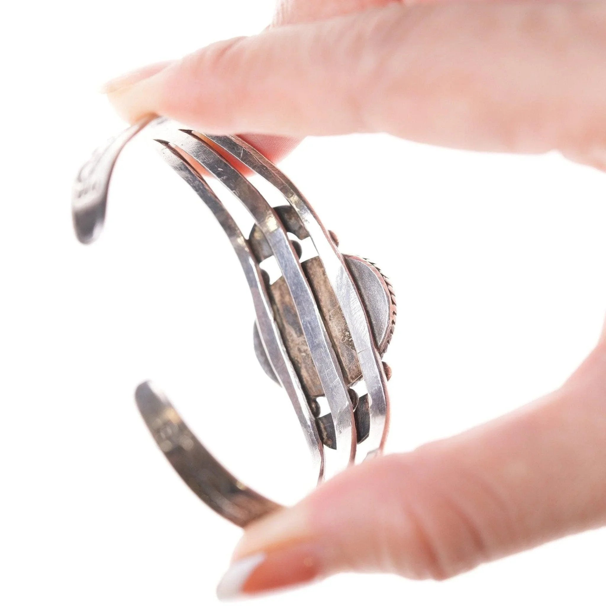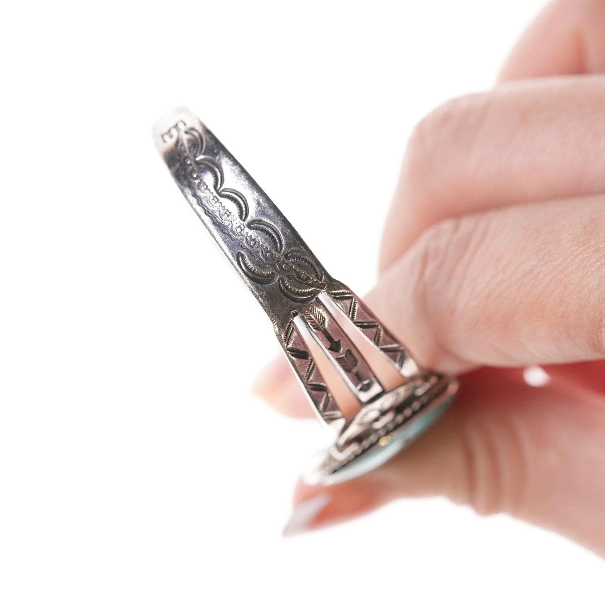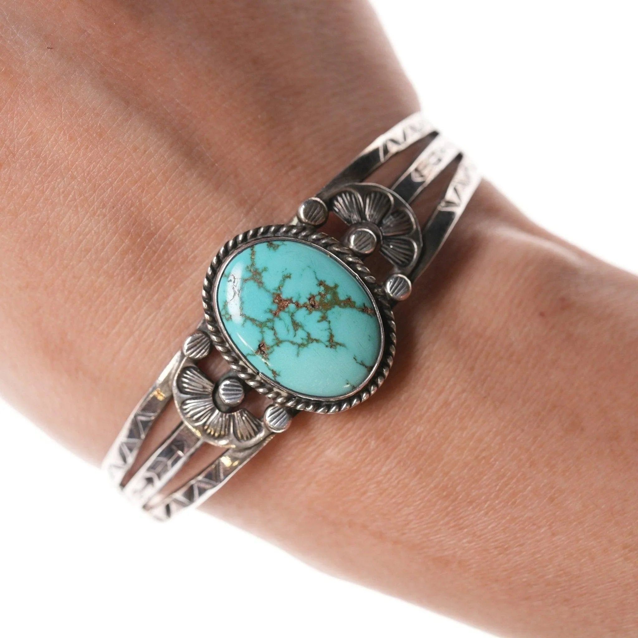 Bracciale in argento e turchese Navajo timbrato a mano da 6 3/8" degli anni '30 e '40, largo 26 mm al centro.