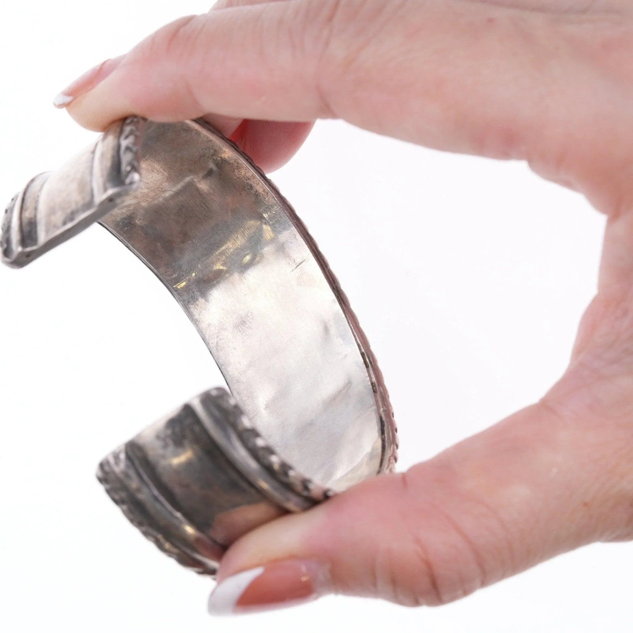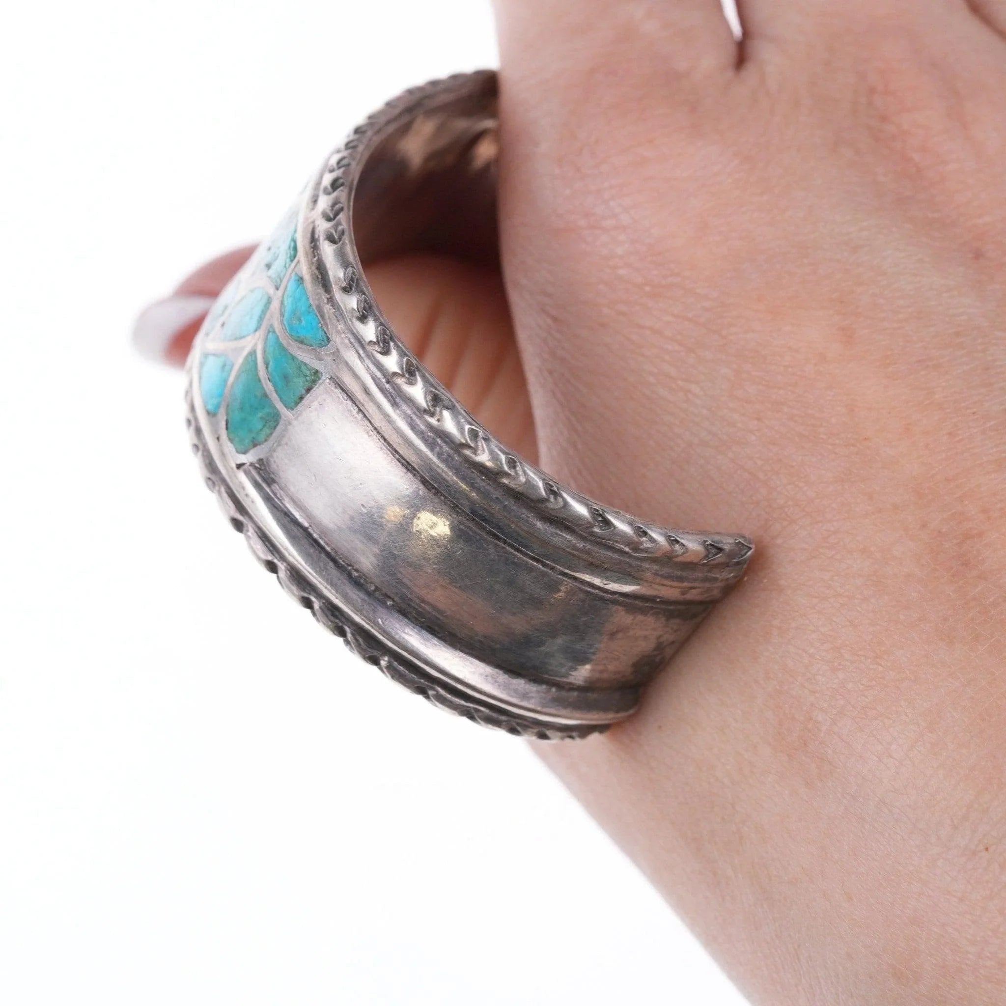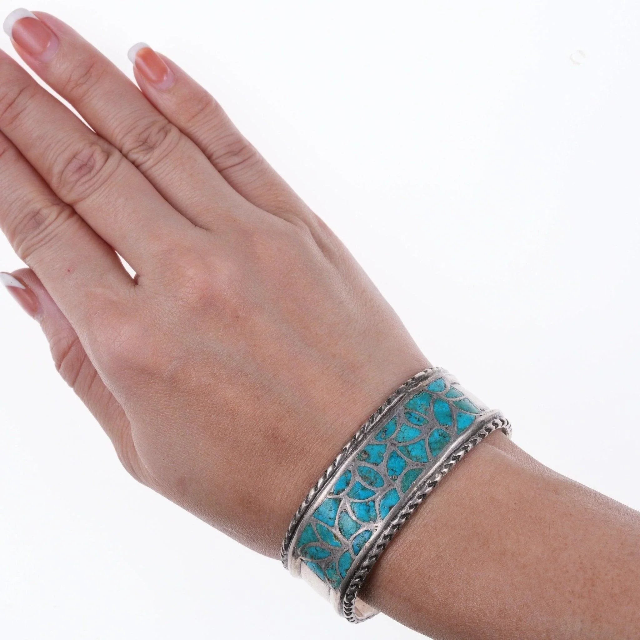 Bracciale in argento sterling con intarsio Zuni Fishscale da 6 3/8" degli anni '40 e '50, largo 23 mm.