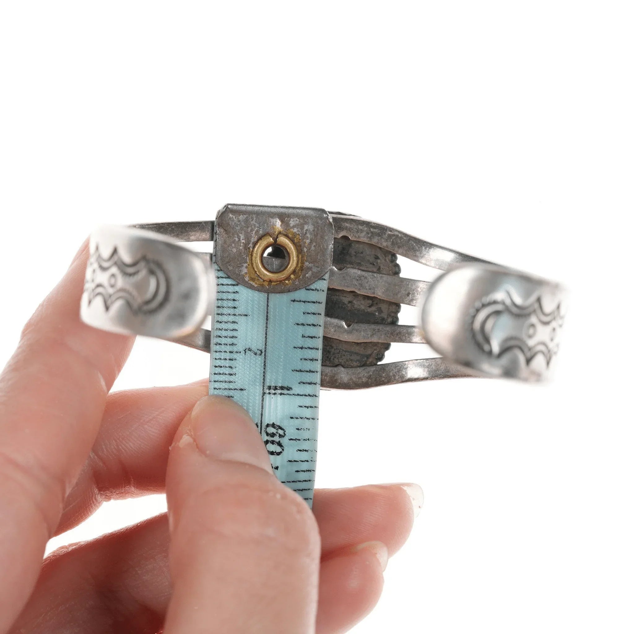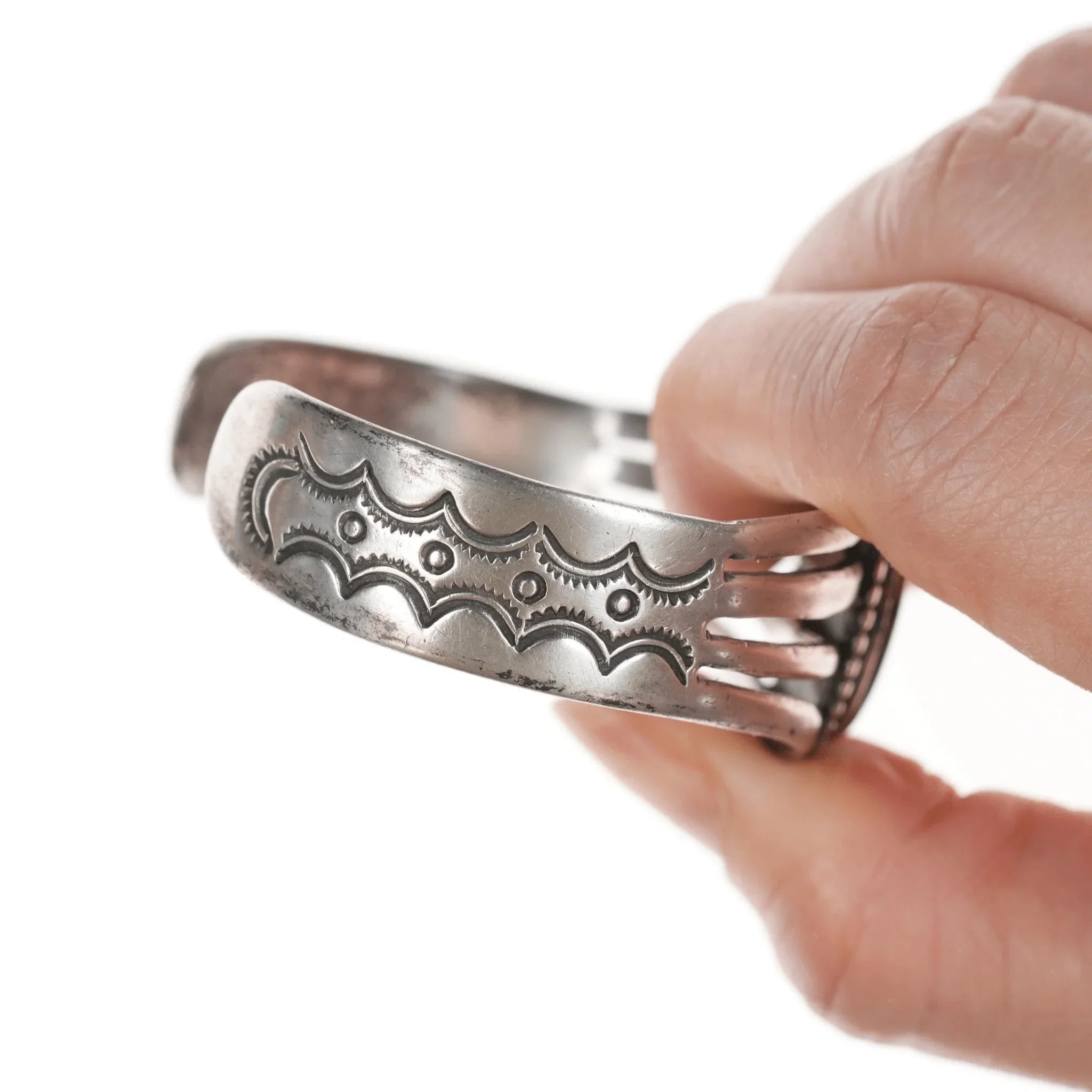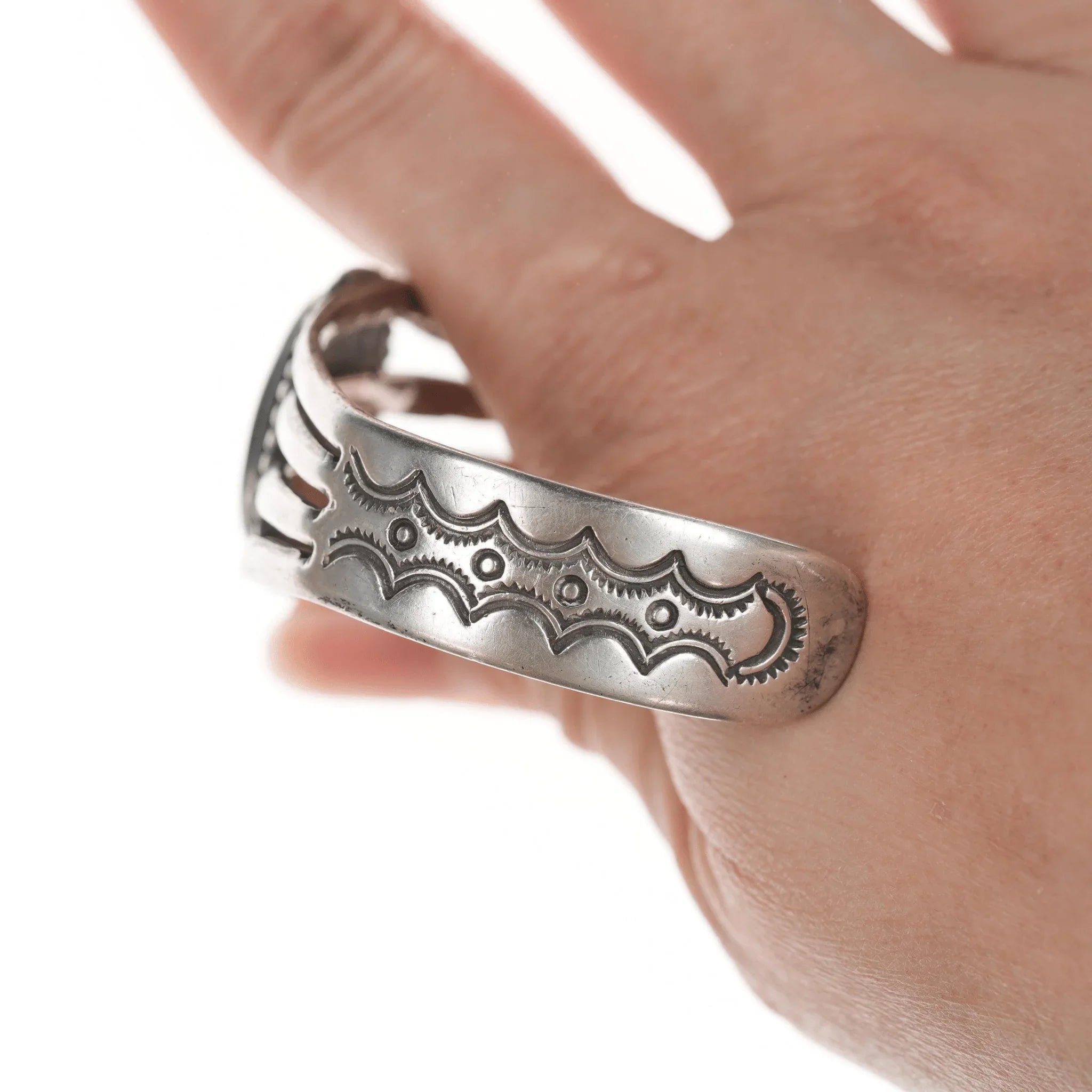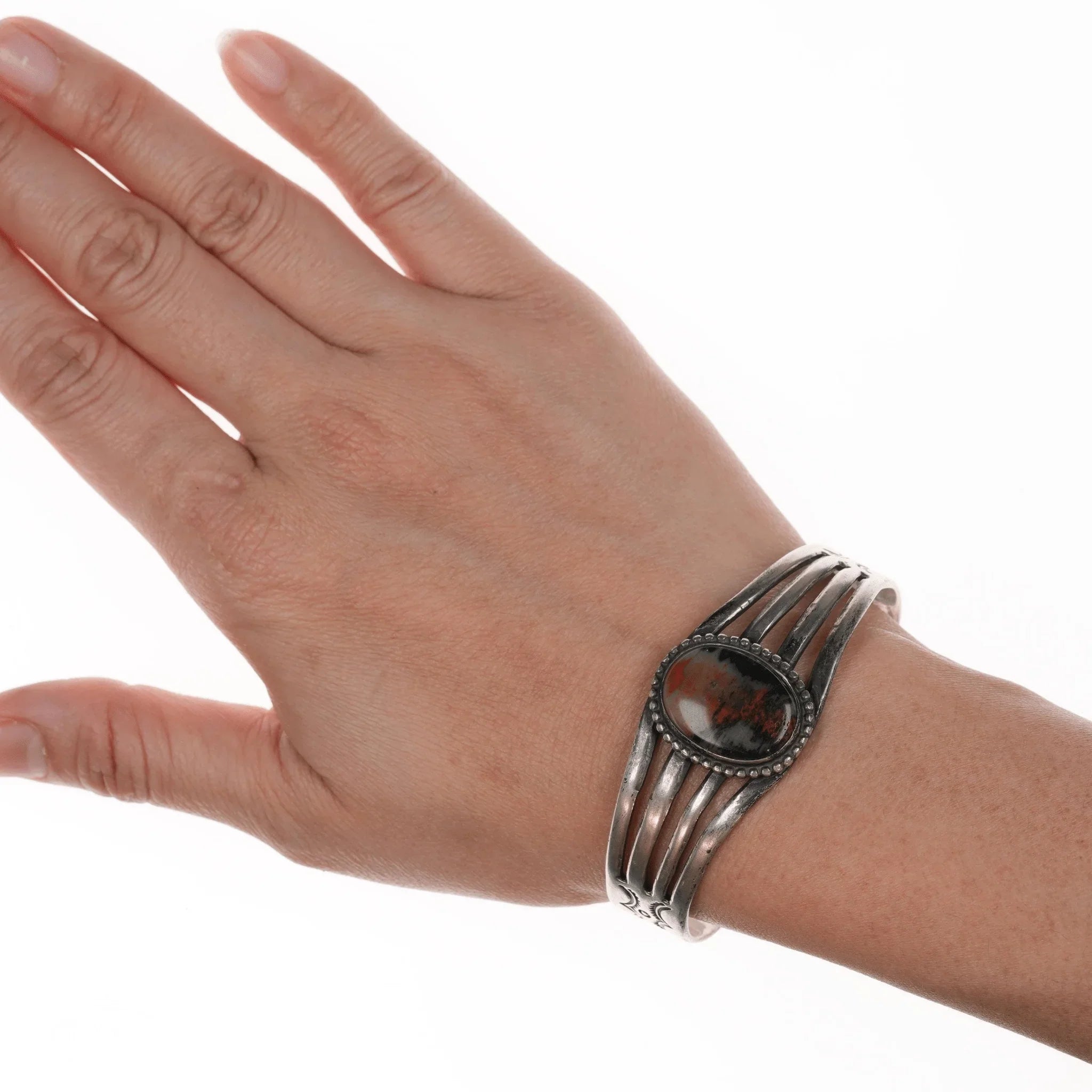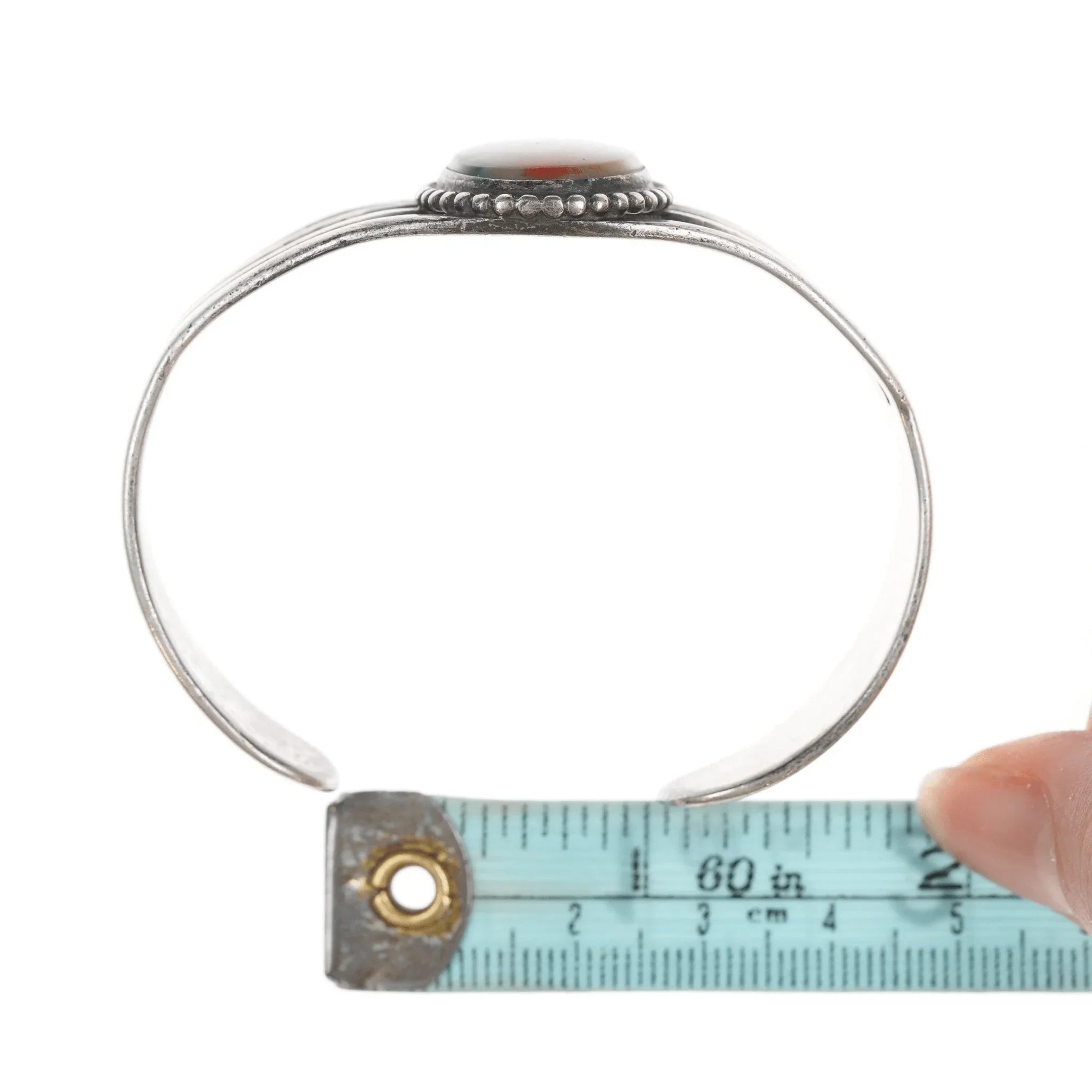 6 3/8" c1940's Navajo Silver Petrified wood agate cuff bracelet. Marked or<br>unmarked as shown in pics, weight and other measurements in pics. Sorry but my<br>jewelry is stored in a secure location and cannot be accessed for more pictures,<br>videos, or measurements until sold. If you look at pictures/description your<br>question should be answered. Thank you so much for your time and consideration!<br><br>All precious metals are tested and guaranteed, any Native American jewelry<br>referred to as Silver or Sterling is guaranteed to be a minimum of 90% (coin)<br>silver and possibly higher content. Anything marked is guaranteed to be what<br>it's marked, most bracelets are photographed on a 6" wrist (non hairy), rings<br>photographed on the appropriate sized finger when possible. With bracelets if<br>the measurement is not given in the description then inside circumference is<br>shown where the metal meets the number on the the cloth tape measure.