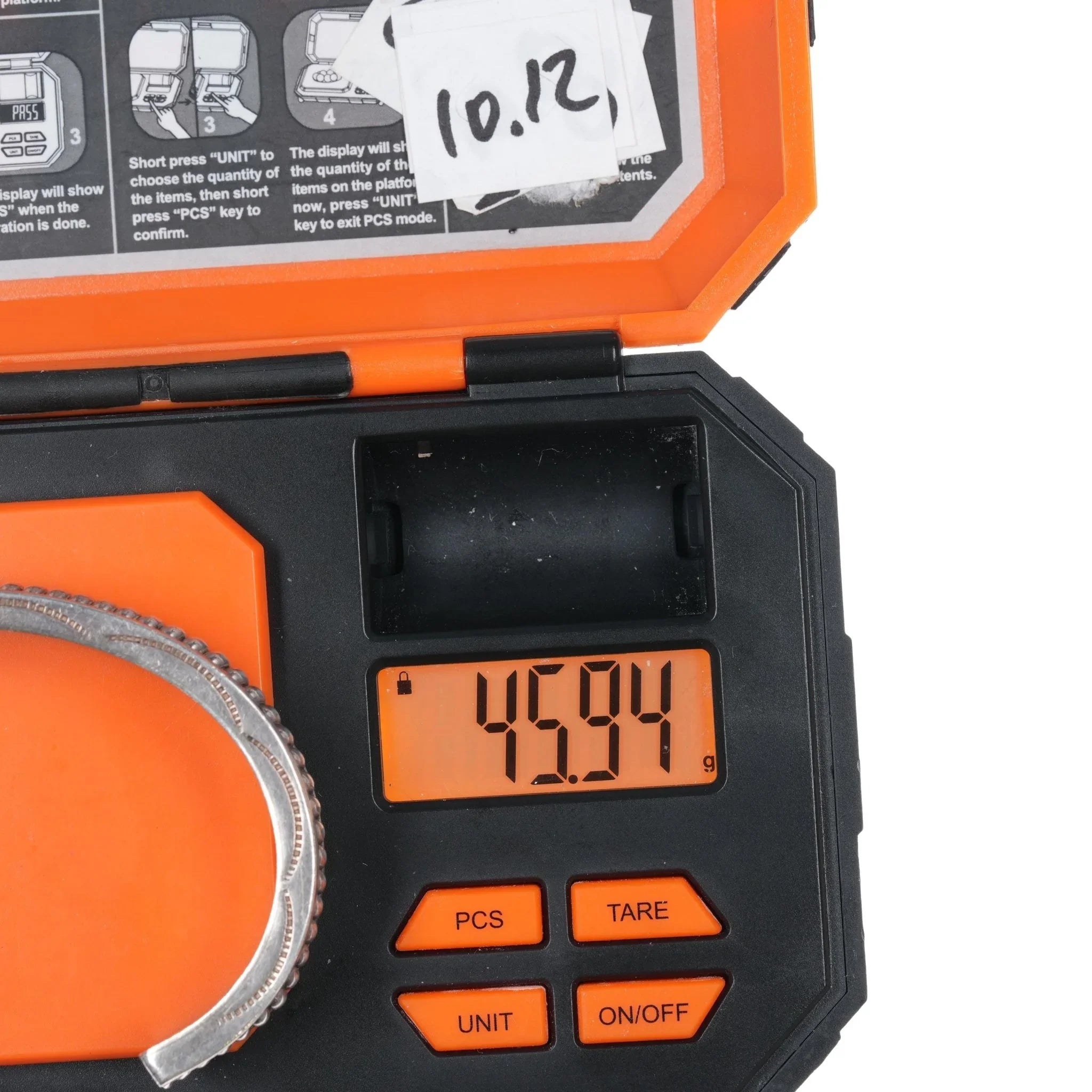 Marked or unmarked as shown in pics, weight and other measurements in pics. Sorry but my jewelry is stored in a secure location and cannot be accessed for more pictures, videos, or<br>measurements until sold. If you look at pictures/description your question<br>should be answered. Thank you so much for your time and consideration.