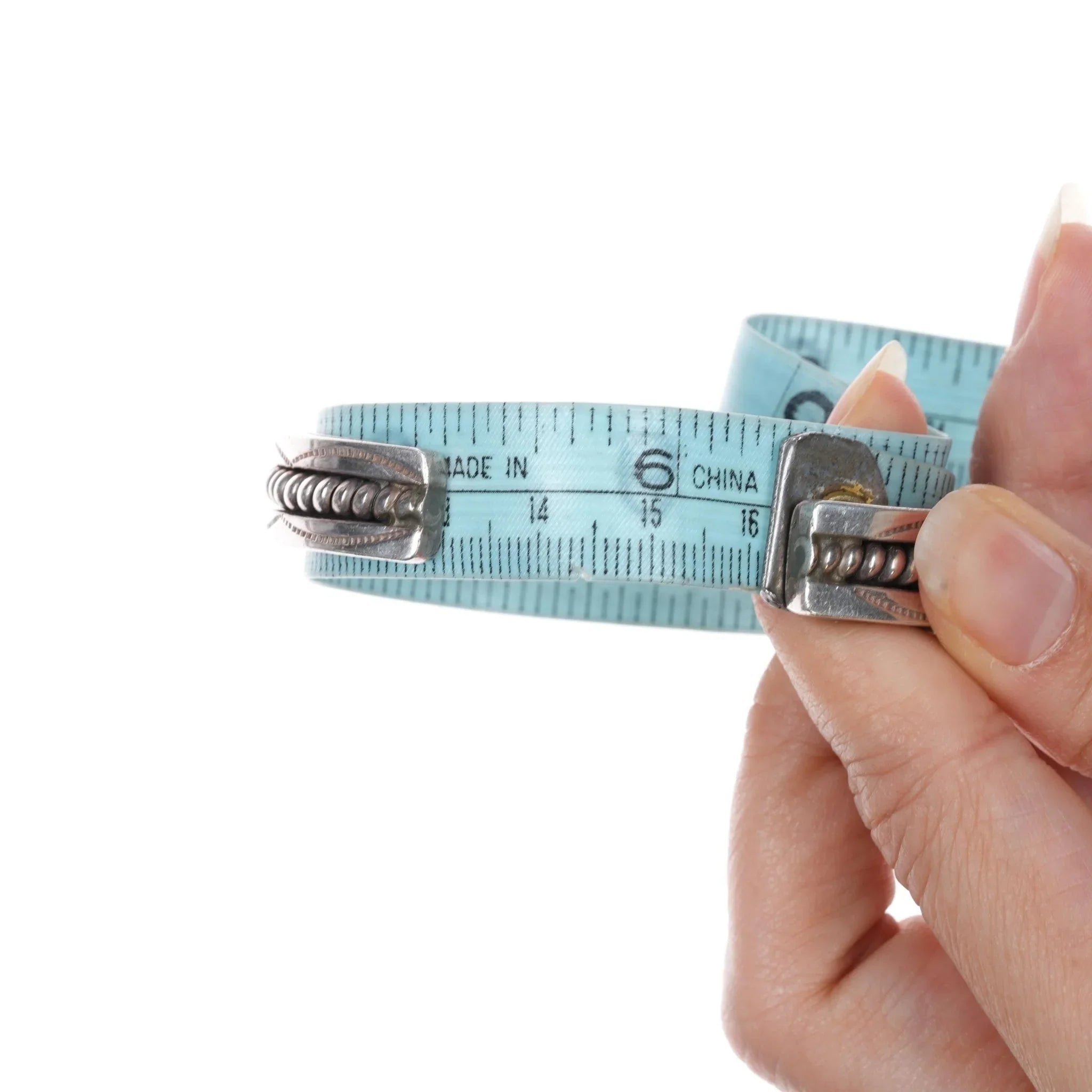 All precious metals are tested and guaranteed, any Native American jewelry<br>referred to as Silver or Sterling is guaranteed to be a minimum of 90% (coin)<br>silver and possibly higher content. Anything marked is guaranteed to be what<br>it‘s marked, most bracelets are photographed on a 6" wrist (non hairy), rings<br>photographed on the appropriate sized finger when possible. With bracelets if<br>the measurement is not given in the description then inside circumference is<br>shown where the metal meets the number on the the cloth tape measure.