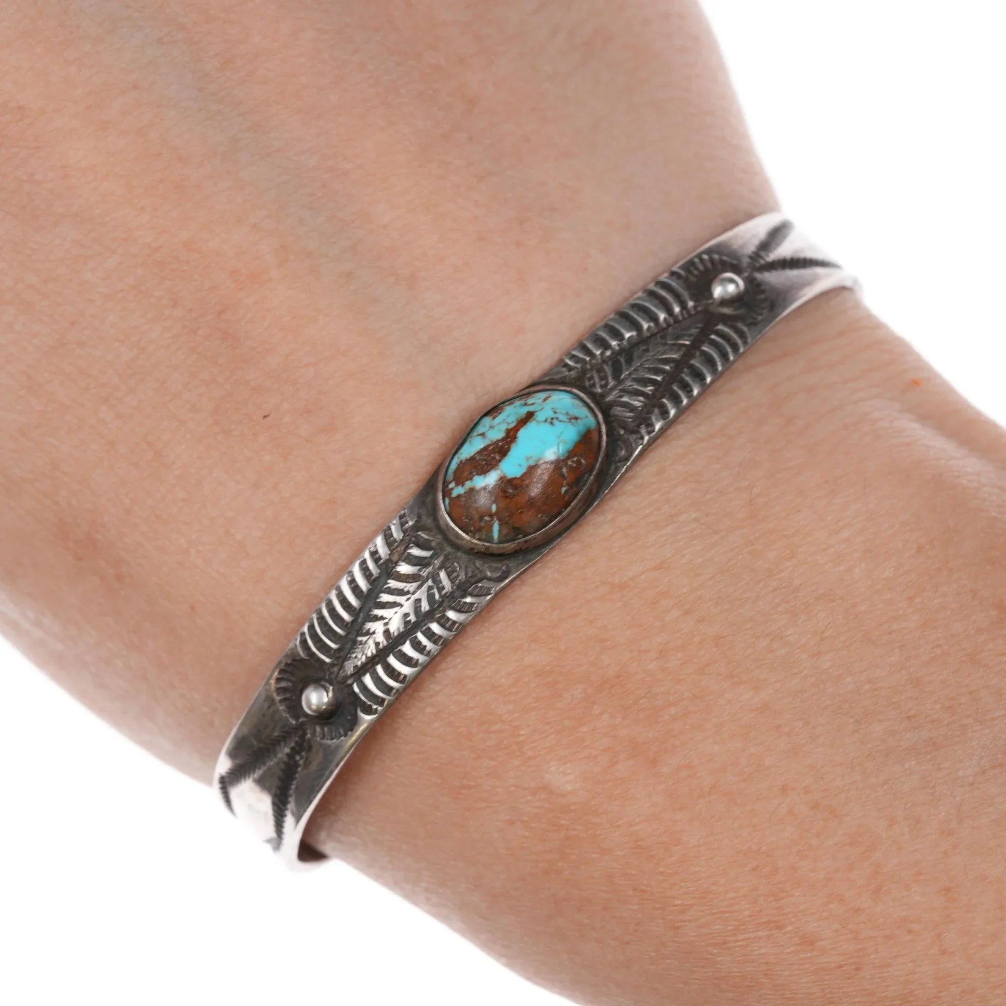 All precious metals are tested and guaranteed. A Native American jewelry piece referred to as "silver" or "ingot" is guaranteed to be at least 90% silver. I rarely use the word "sterling" when referring to older Native American silver or really any older silver jewelry as silver contents vary and "sterling" is 92.5% silver. No older jewelry is going to be exactly 92.5% silver, some a little over, some a little under. It wasn‘t an exact thing with handmade jewelry. I‘ve seen thousands of pieces xrf‘d to prove this. Bracelets are photographed on a 6" women‘s wrist.