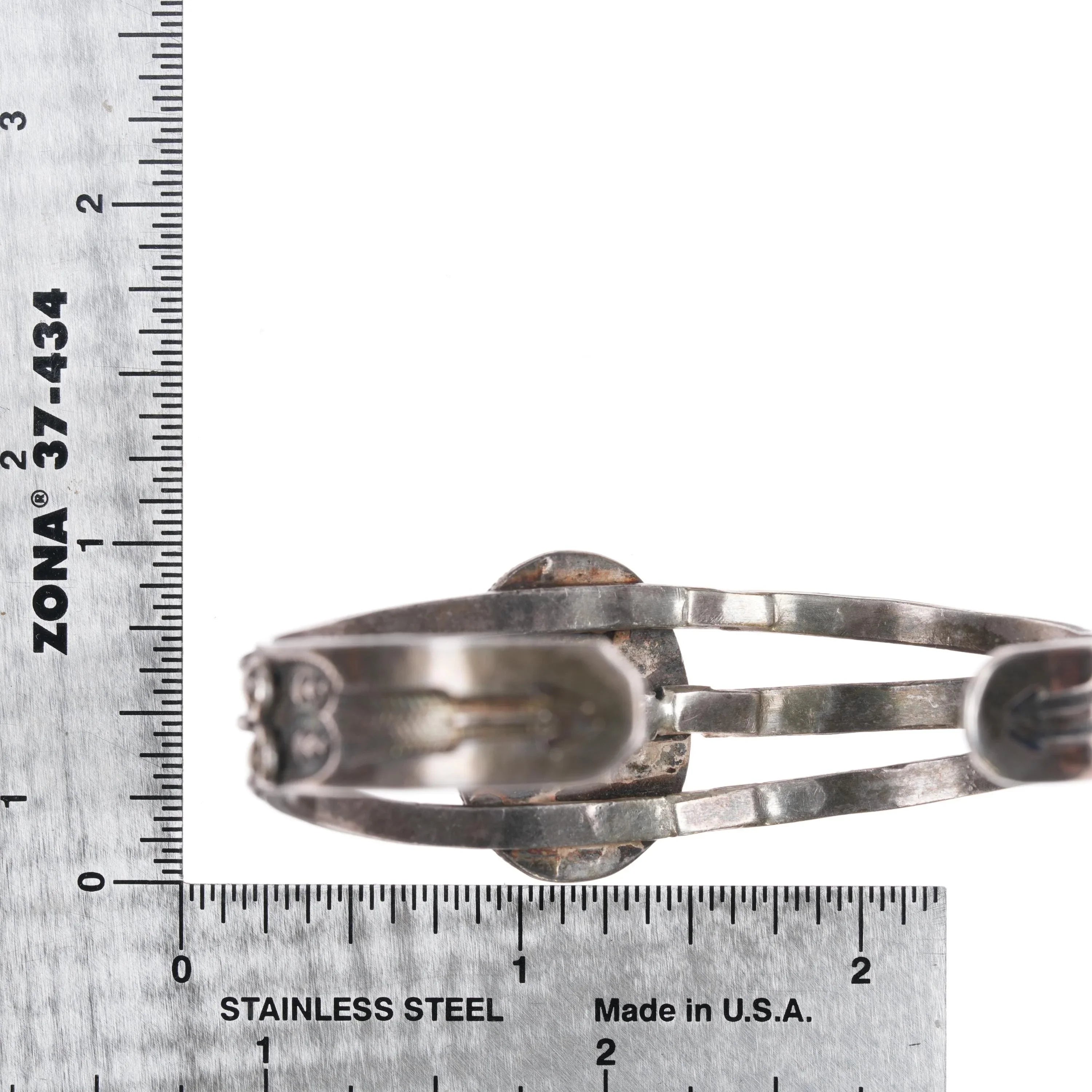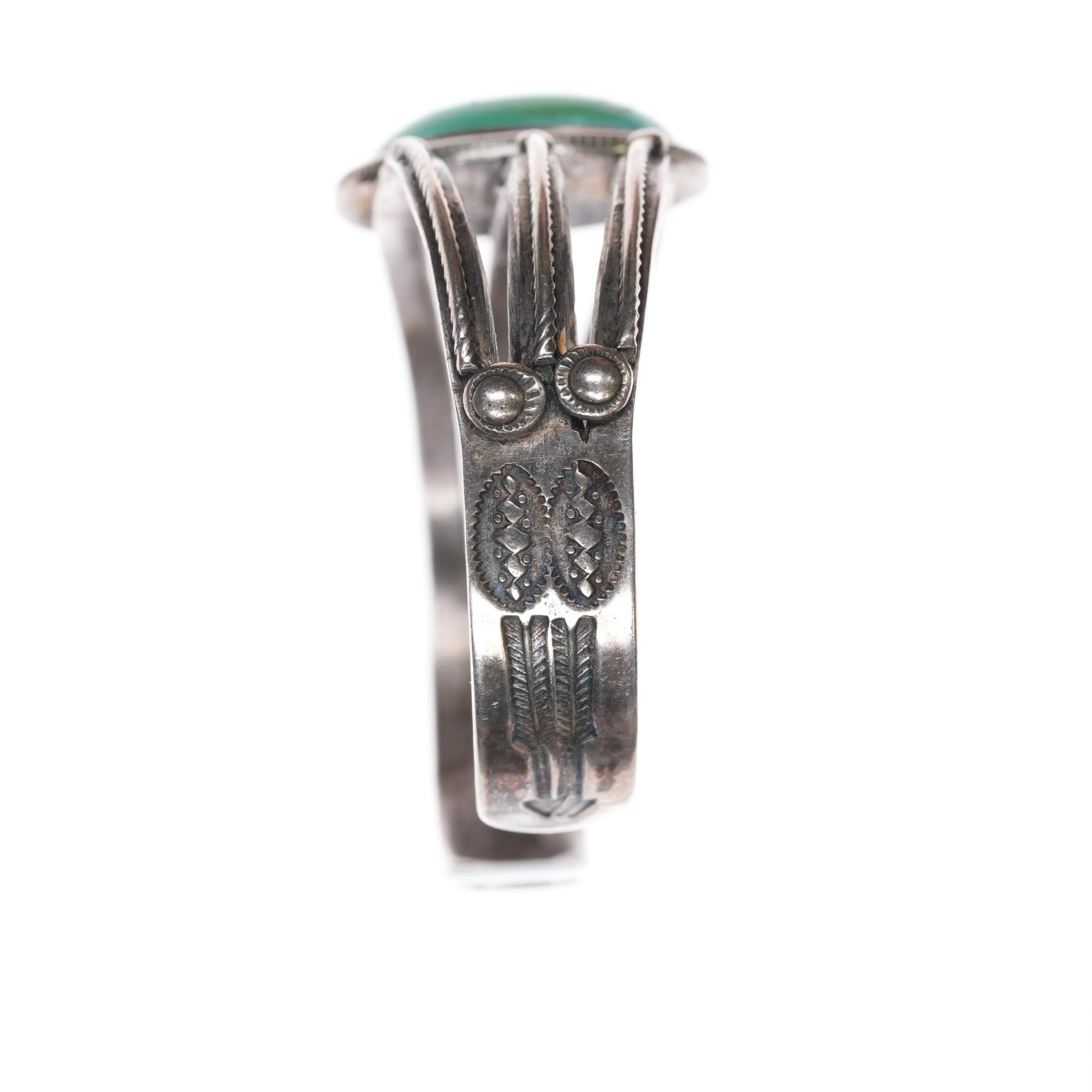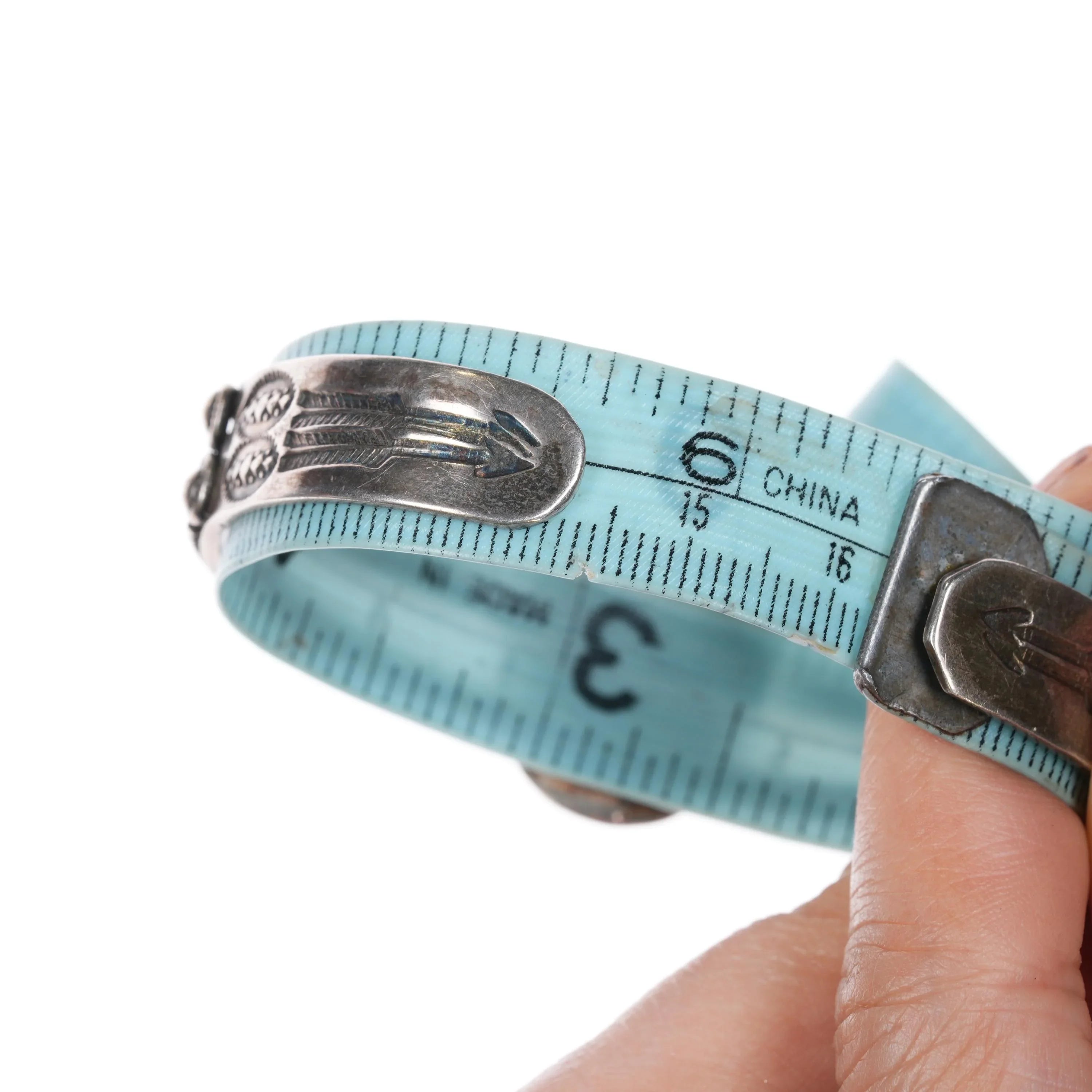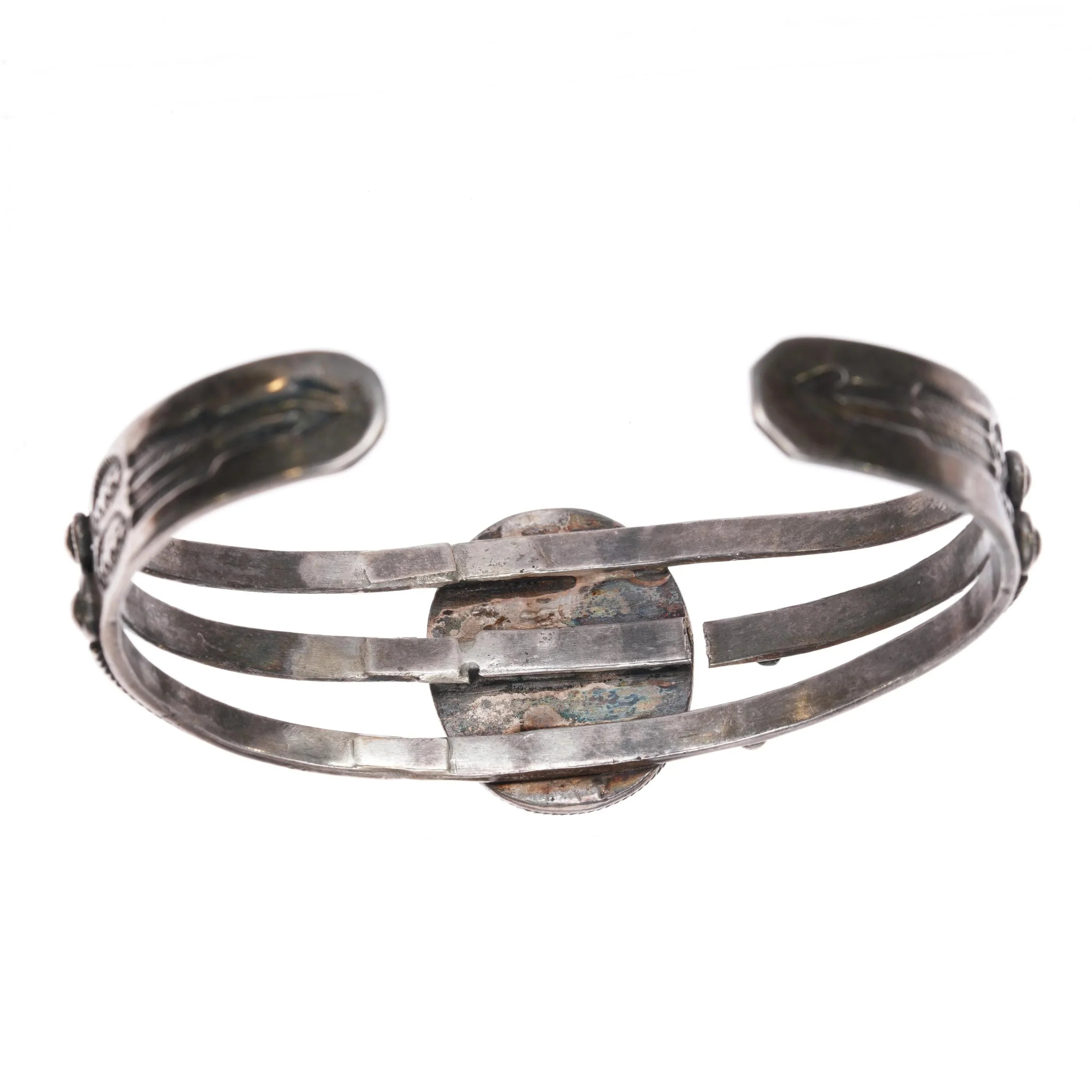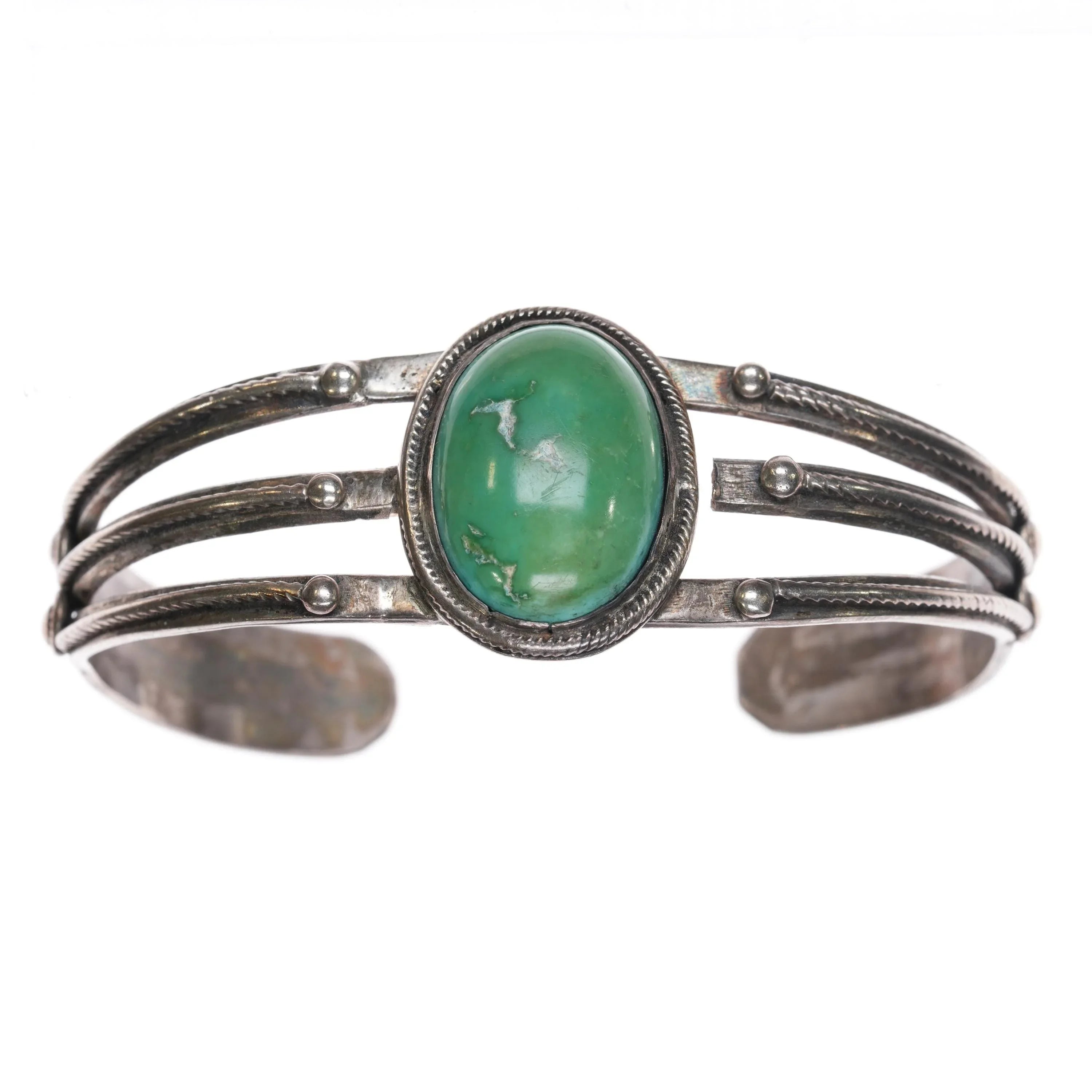 6.35" 1930‘s Navajo sterling silver 3 shank single stone turquoise cuff bracelet. Weight and measurements in pictures, solid sterling silver. Unmarked as typical of Native American silver jewelry of this era (second quarter of 20th century) This is a very stout bracelet, it has a repair on one side of the stone, and a break to the center shank on the other side. Still it is super stout and will outlive us all. Not noticeable when worn.