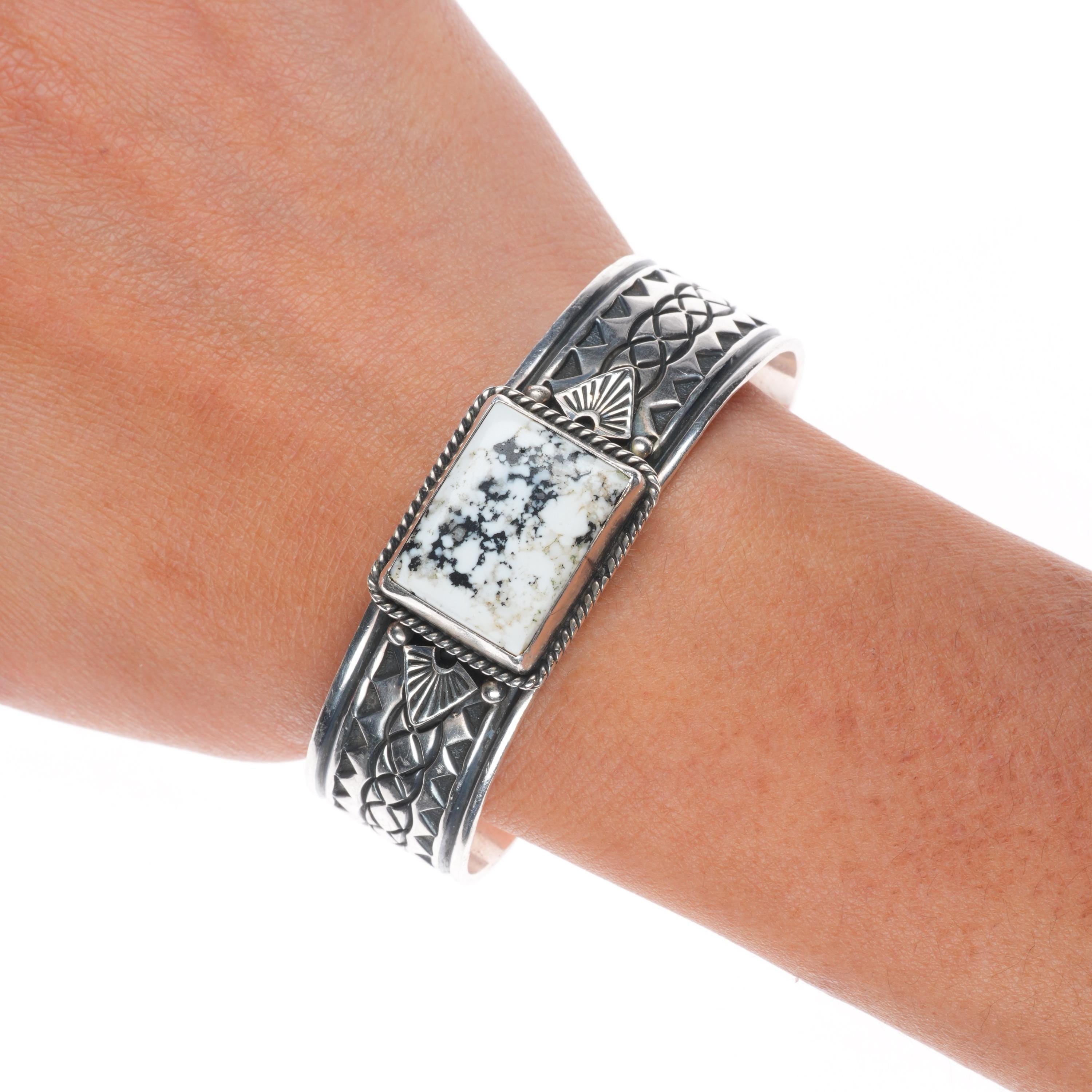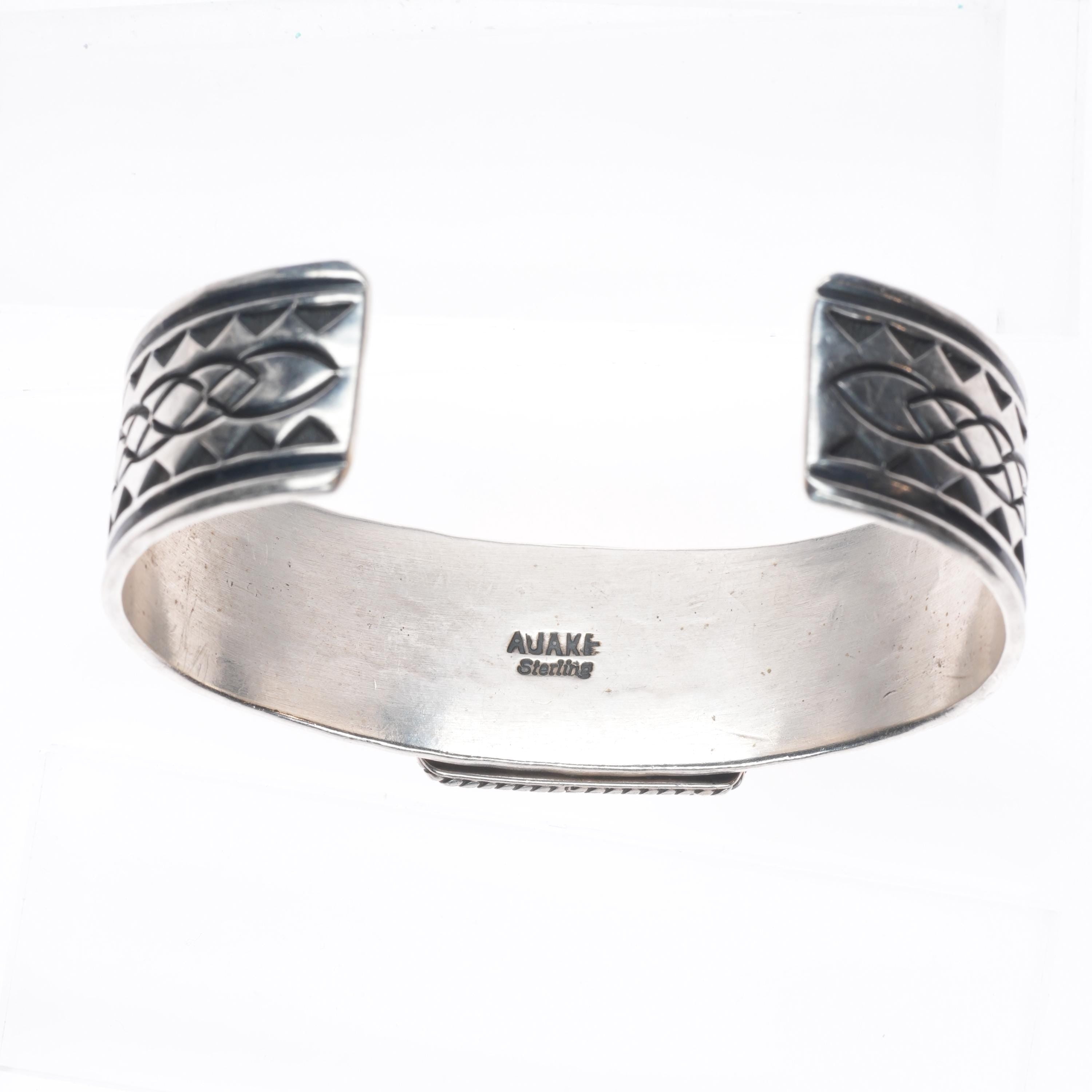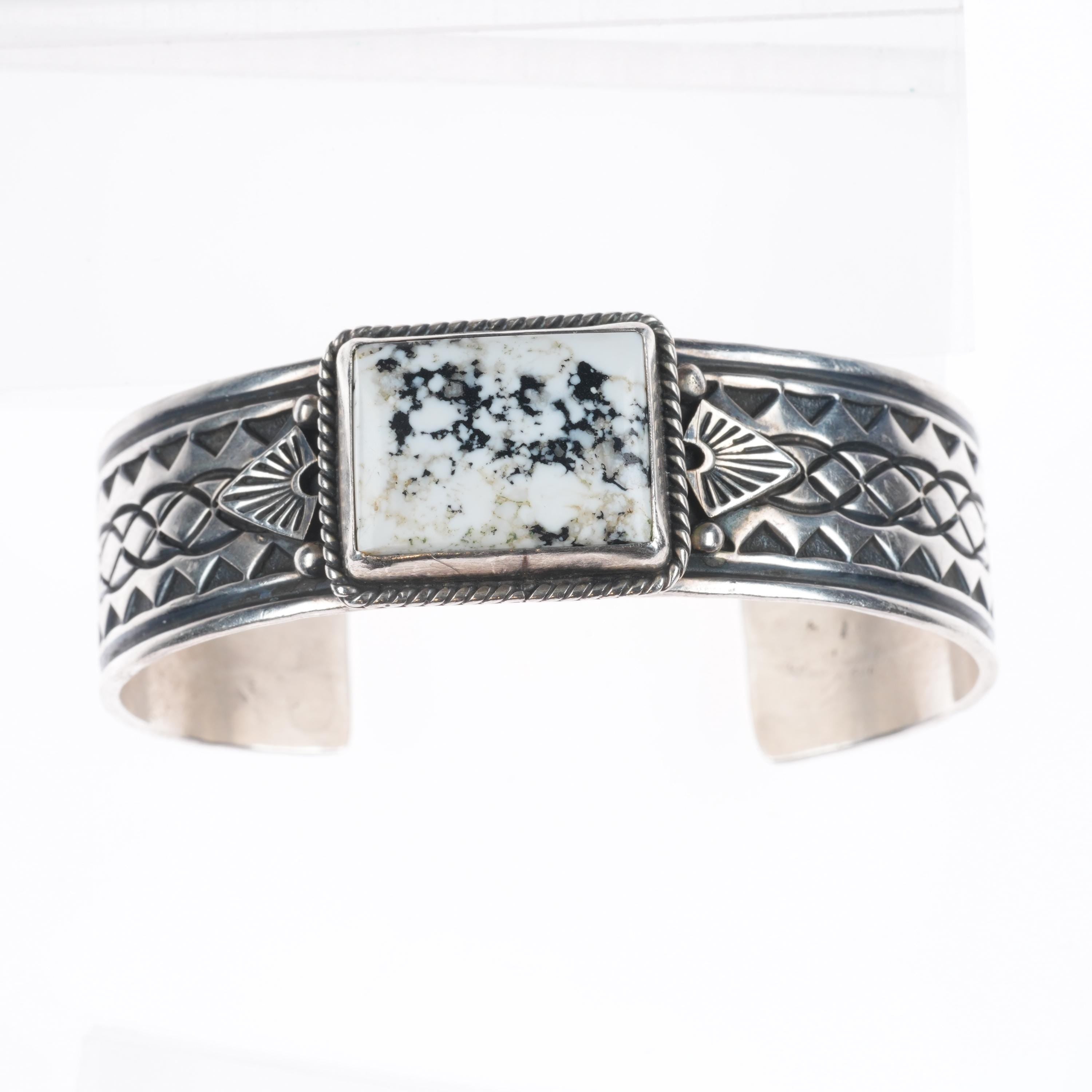 6.4" Albert Jake Navajo sterling silver White Buffalo deep stamped cuff bracelet. Tested and guaranteed solid sterling silver with weight and measurements in pictures. Circa last quarter of the 20th century with age appropriate wear..