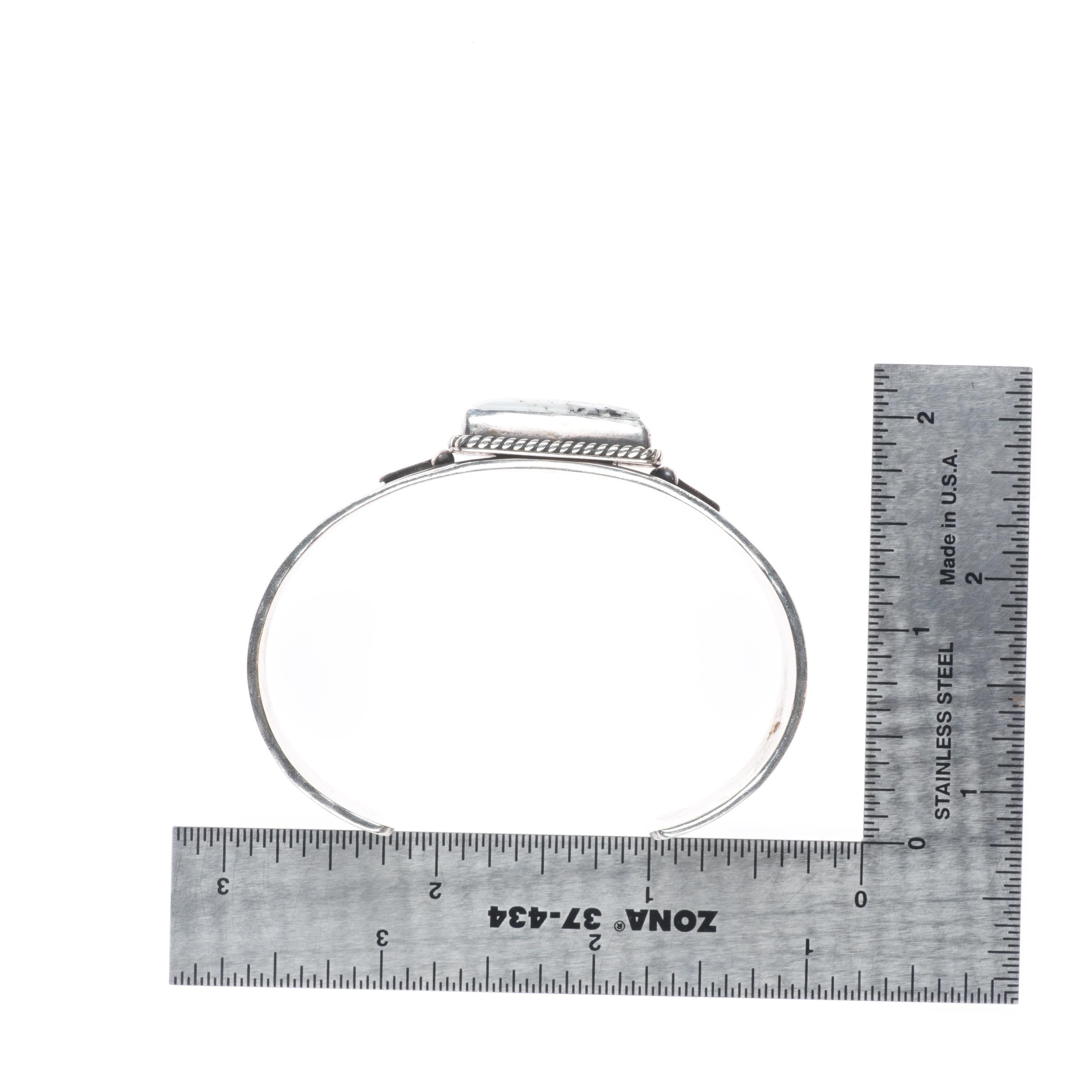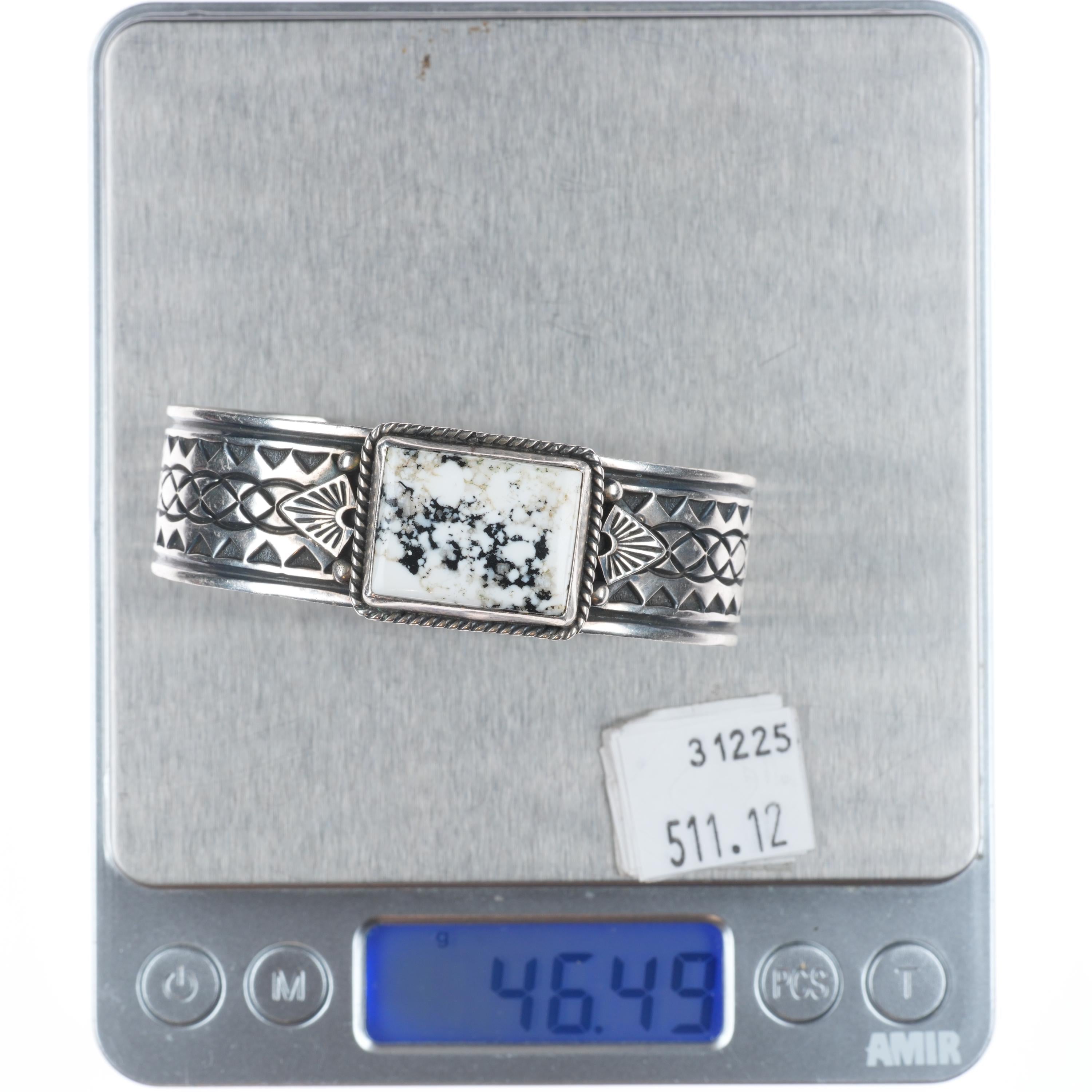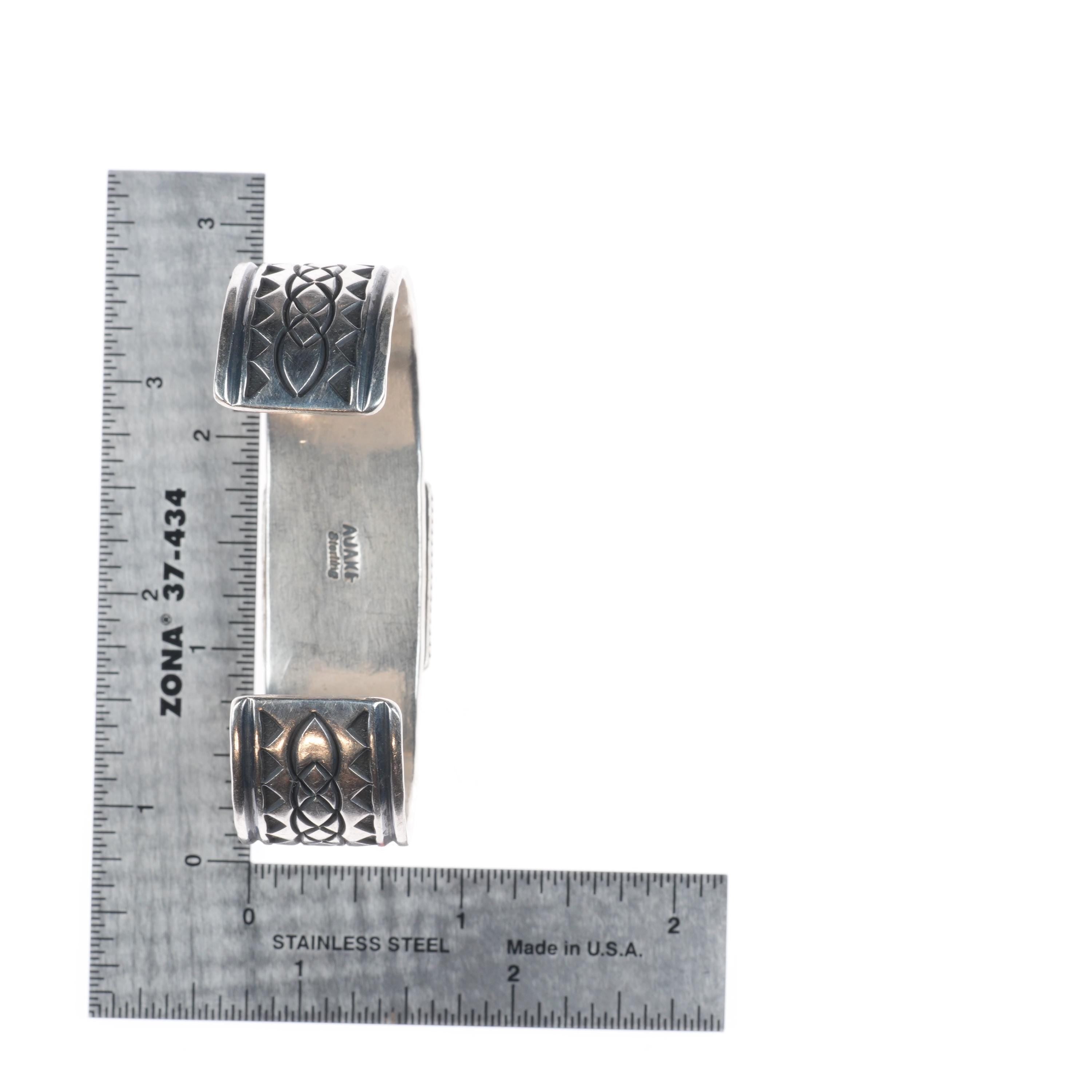 6.4" Albert Jake Navajo sterling silver White Buffalo deep stamped cuff bracelet. Tested and guaranteed solid sterling silver with weight and measurements in pictures. Circa last quarter of the 20th century with age appropriate wear..