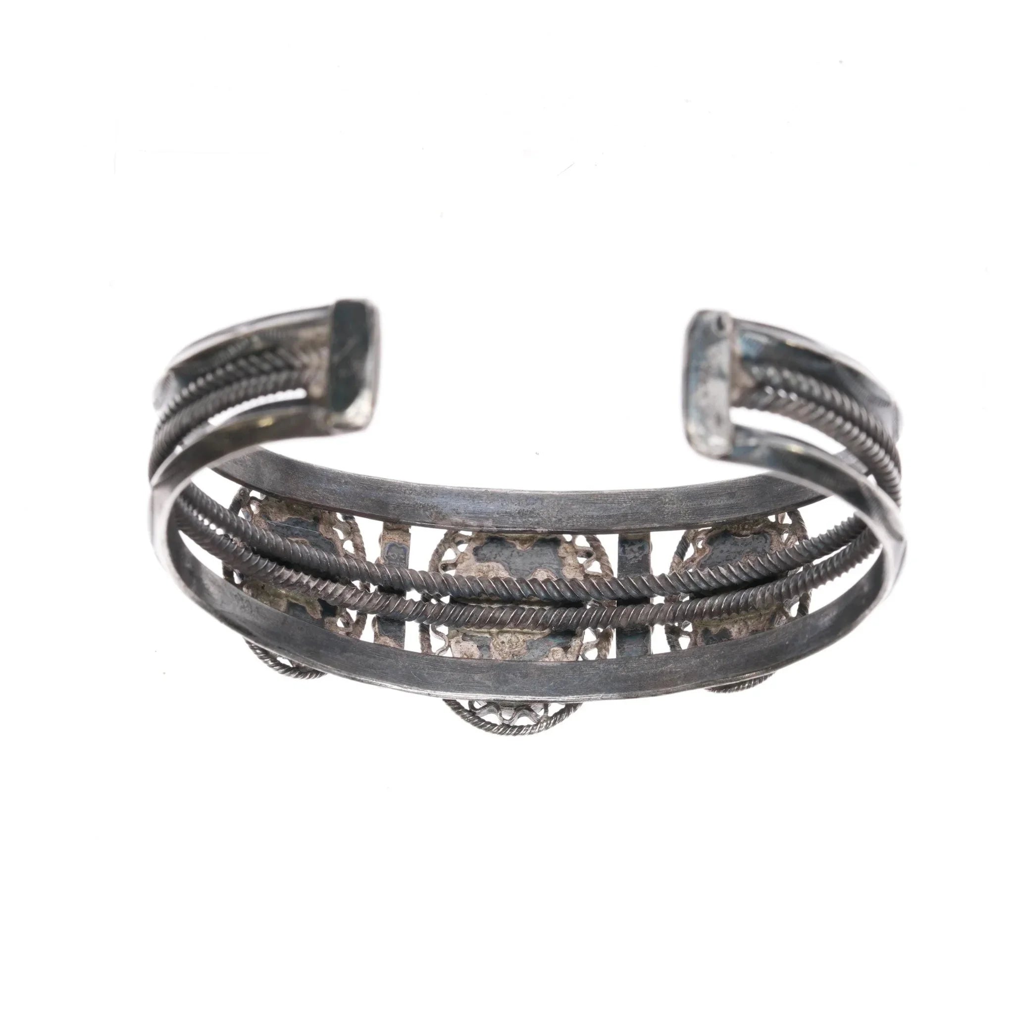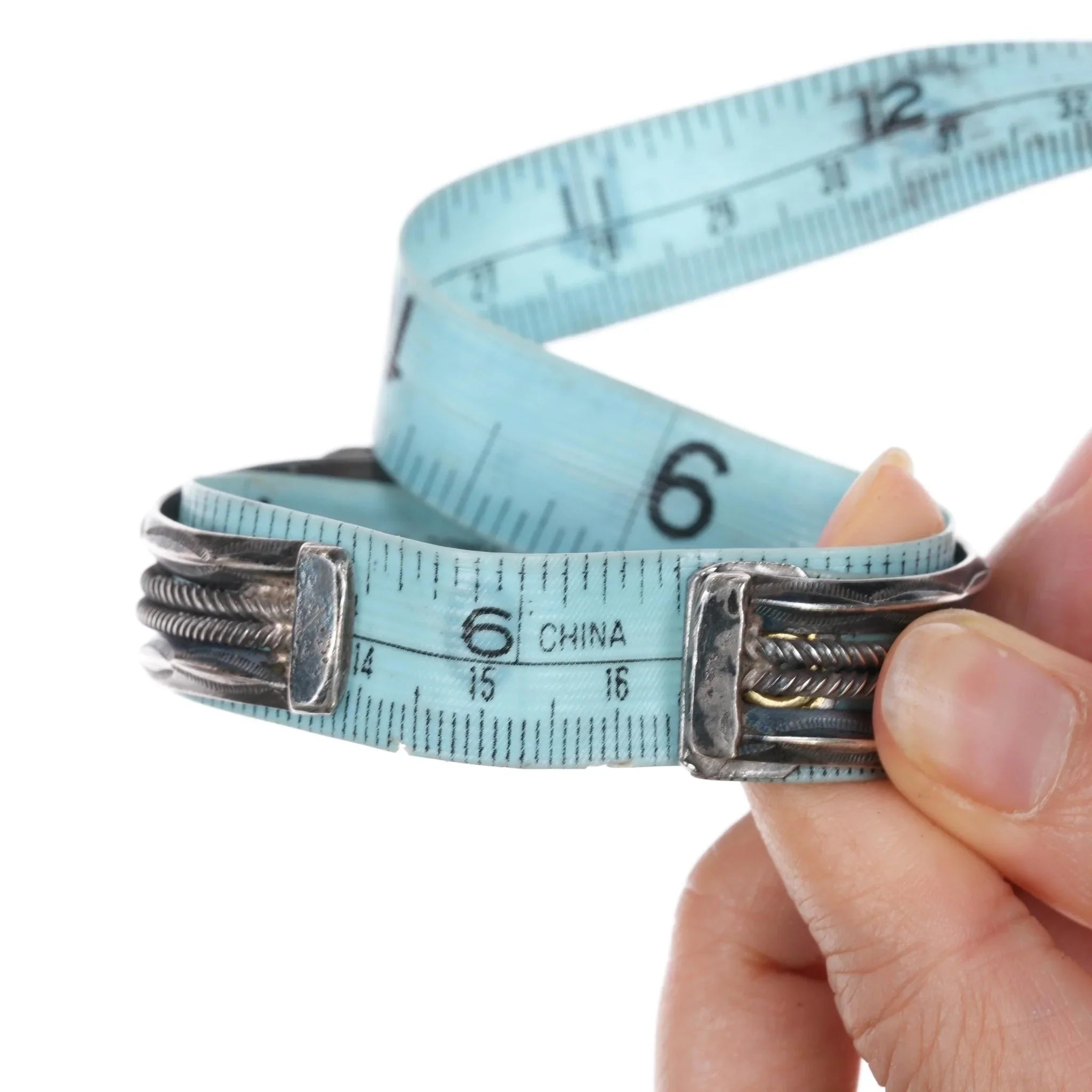 6.5" 40‘s-50‘s Native American silver cuff bracelet with nice turquoise. Complex bracelet with a lot going for it, solid sterling with no markings, weight and measurements in pics.