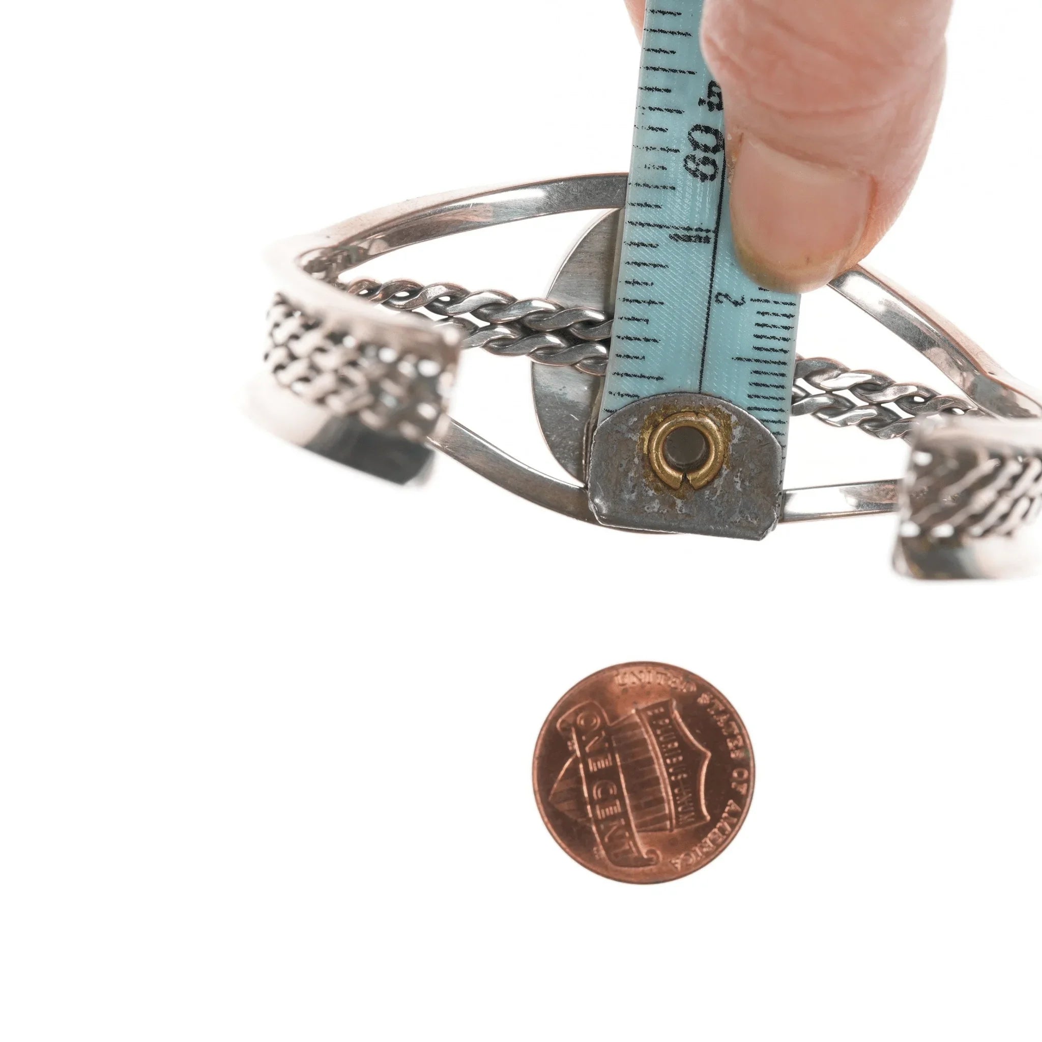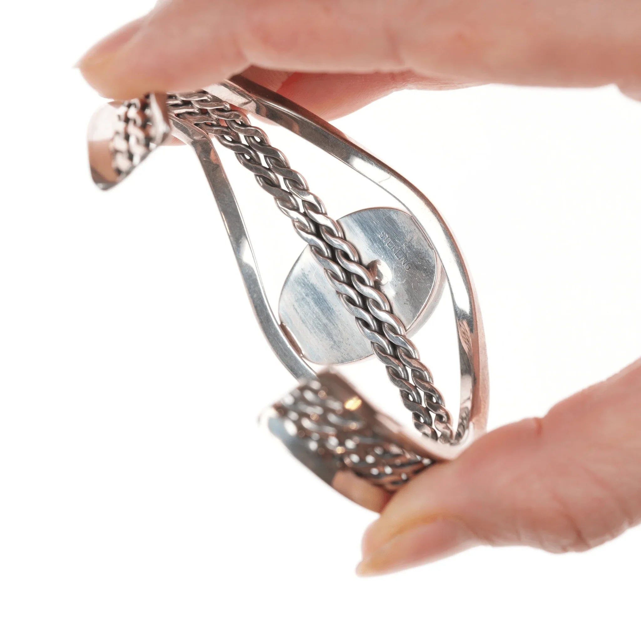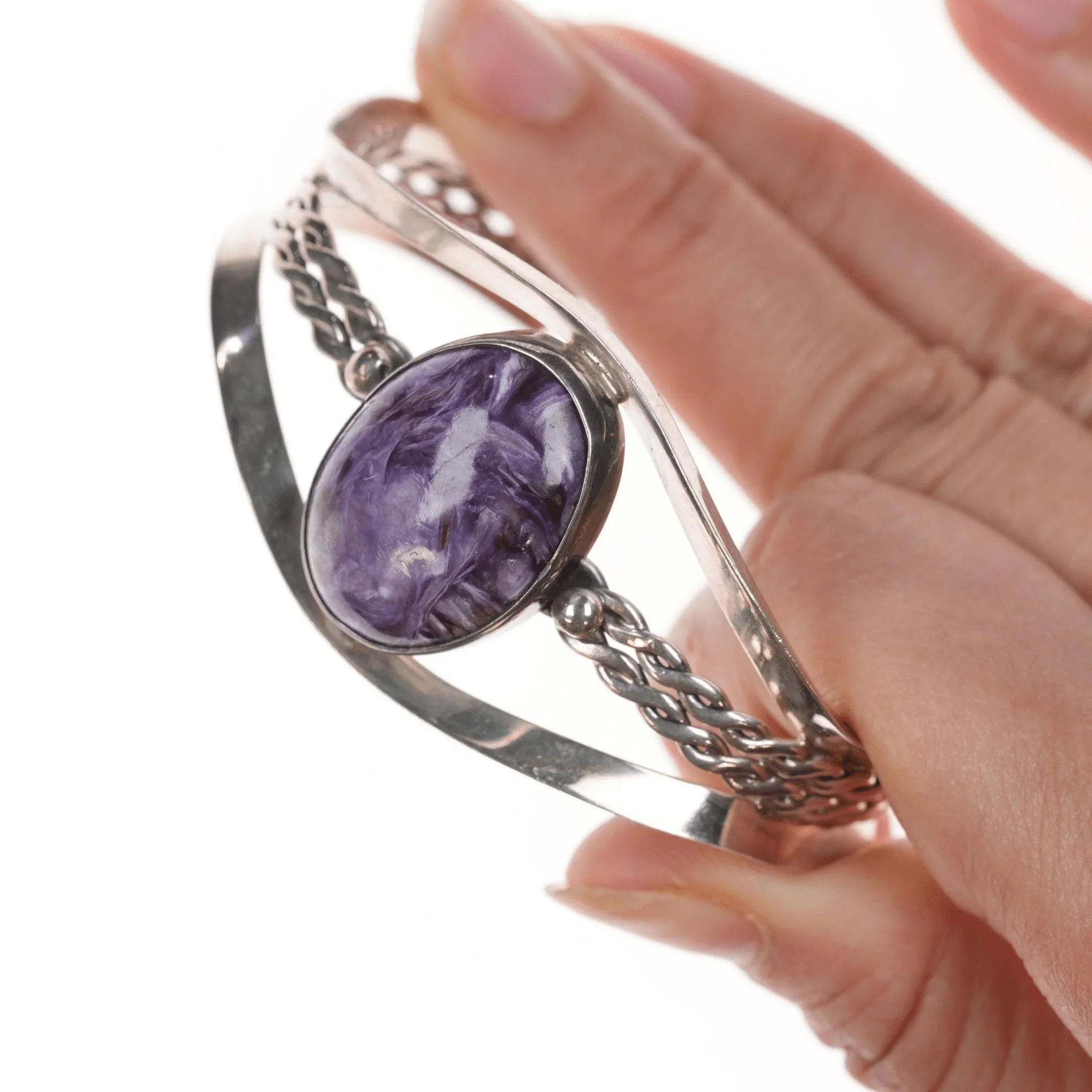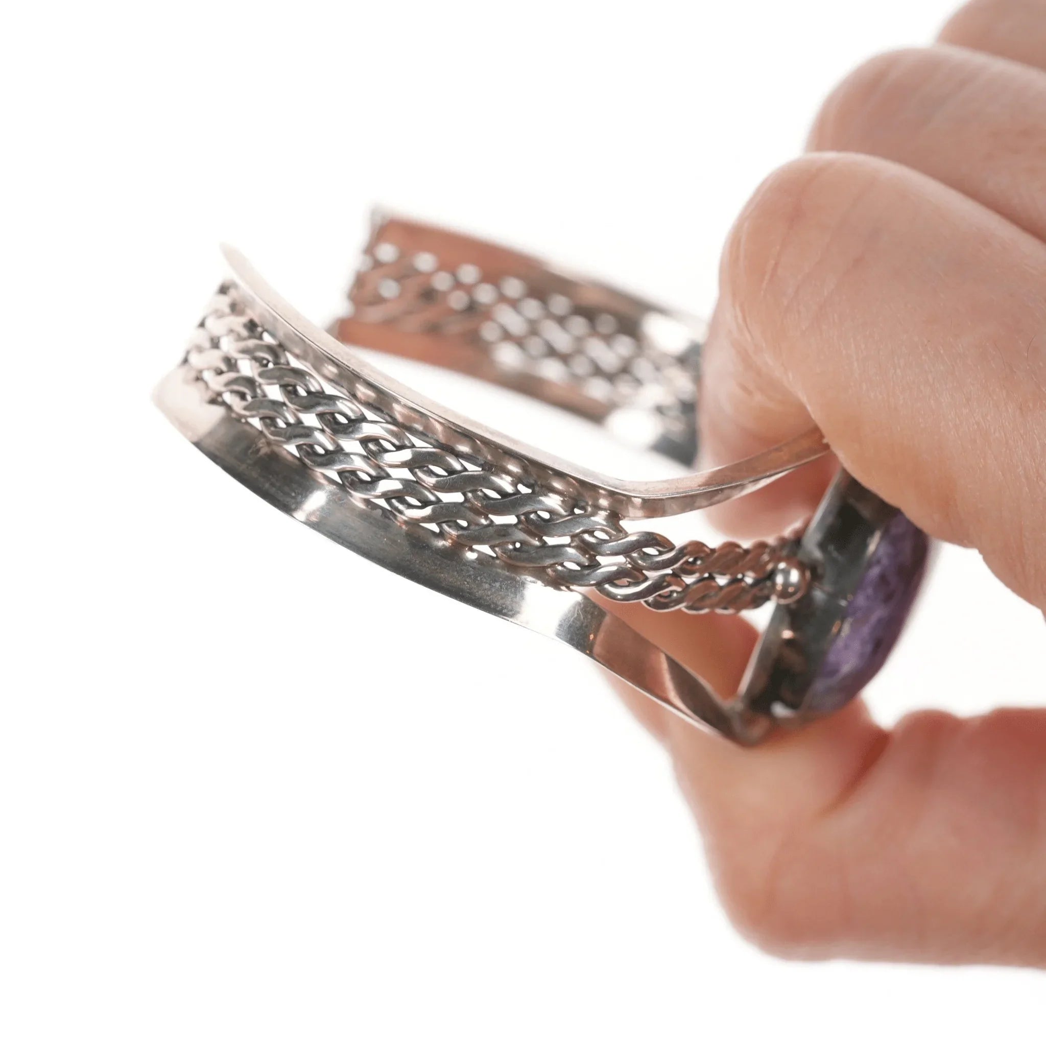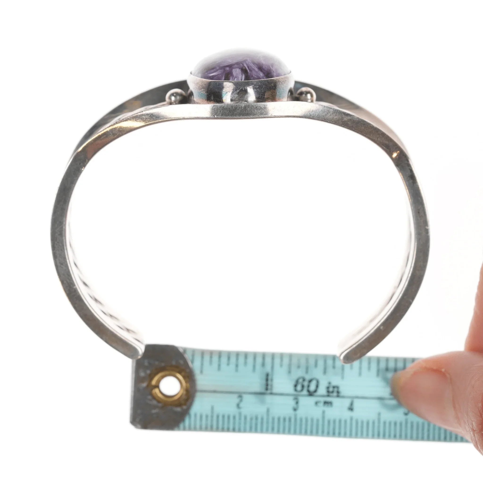 6 5/8" Purpurite Vintage Desert Rose Trading Southwestern sterling cuff bracelet. Older piece before they started making it in China. No issues. <br><br> Marked or unmarked as shown in pics, weight and other measurements in pics. Sorry but my jewelry is stored in a secure location and cannot be accessed for more pictures,<br>videos, or measurements until sold. If you look at pictures/description your<br>question should be answered. Thank you so much for your time and consideration!<br><br>All precious metals are tested and guaranteed. A Native American jewelry piece referred to as "silver" or "ingot" is guaranteed to be at least 90% silver. Bracelets are photographed on a 6" women's wrist.