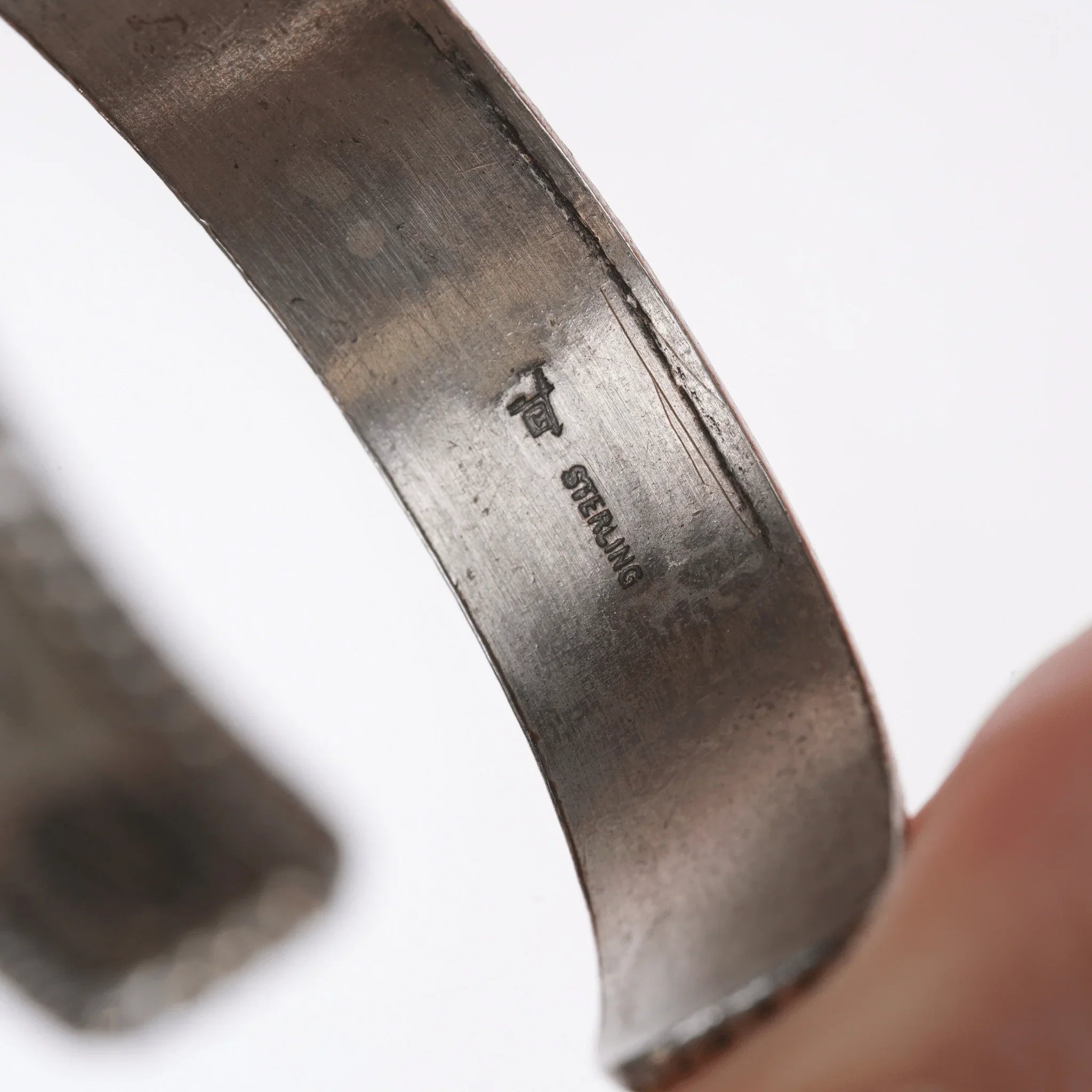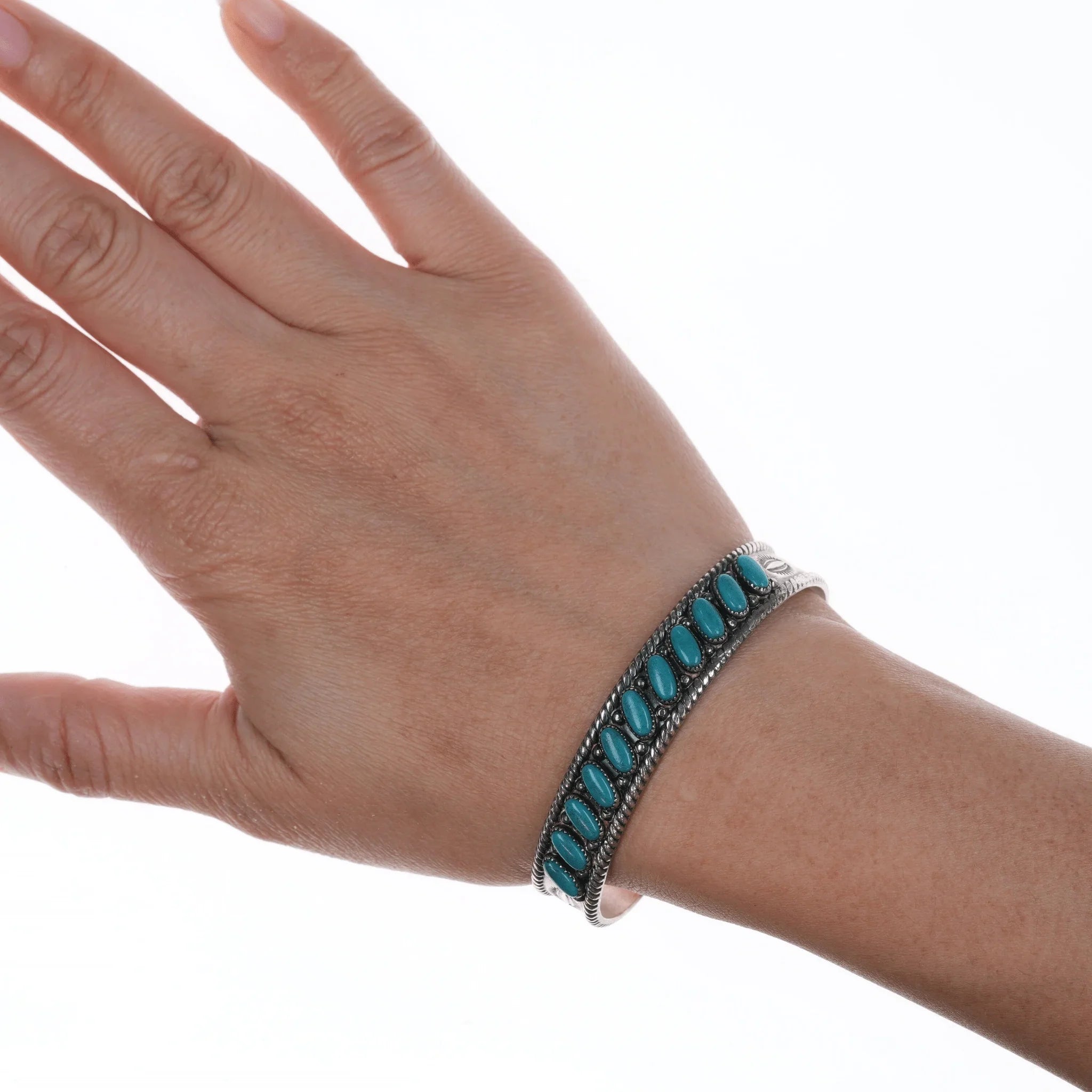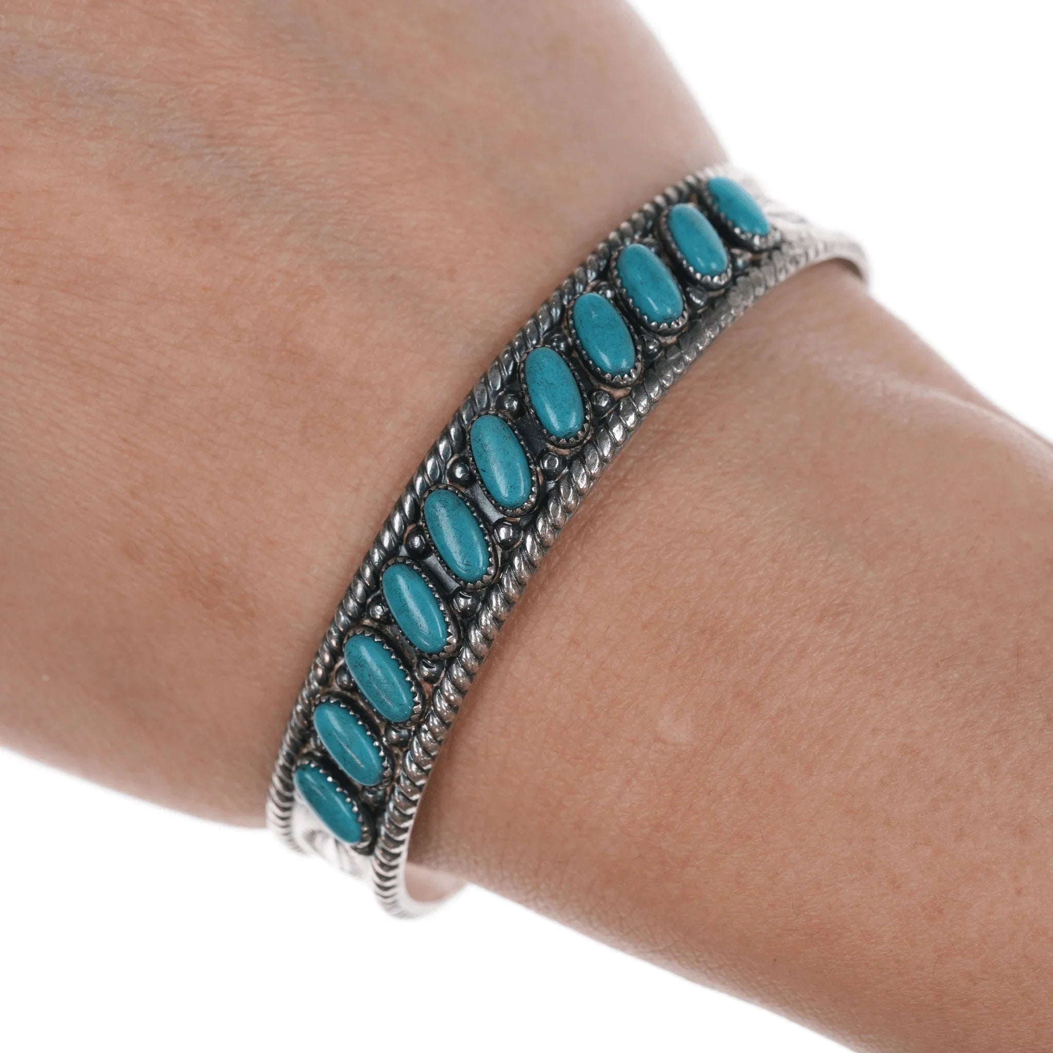 6.5" Bell Trading post Navajo Curio sterling and turquoise row cuff bracelet. Marked or<br>unmarked as shown in pics, weight and other measurements in pics. Sorry but my<br>jewelry is stored in a secure location and cannot be accessed for more pictures,<br>videos, or measurements until sold. If you look at pictures/description your<br>question should be answered. Thank you so much for your time and consideration!<br><br>All precious metals are tested and guaranteed. A Native American jewelry piece referred to as "silver" or "ingot" is guaranteed to be at least 90% silver. Bracelets are photographed on a 6" women's wrist.