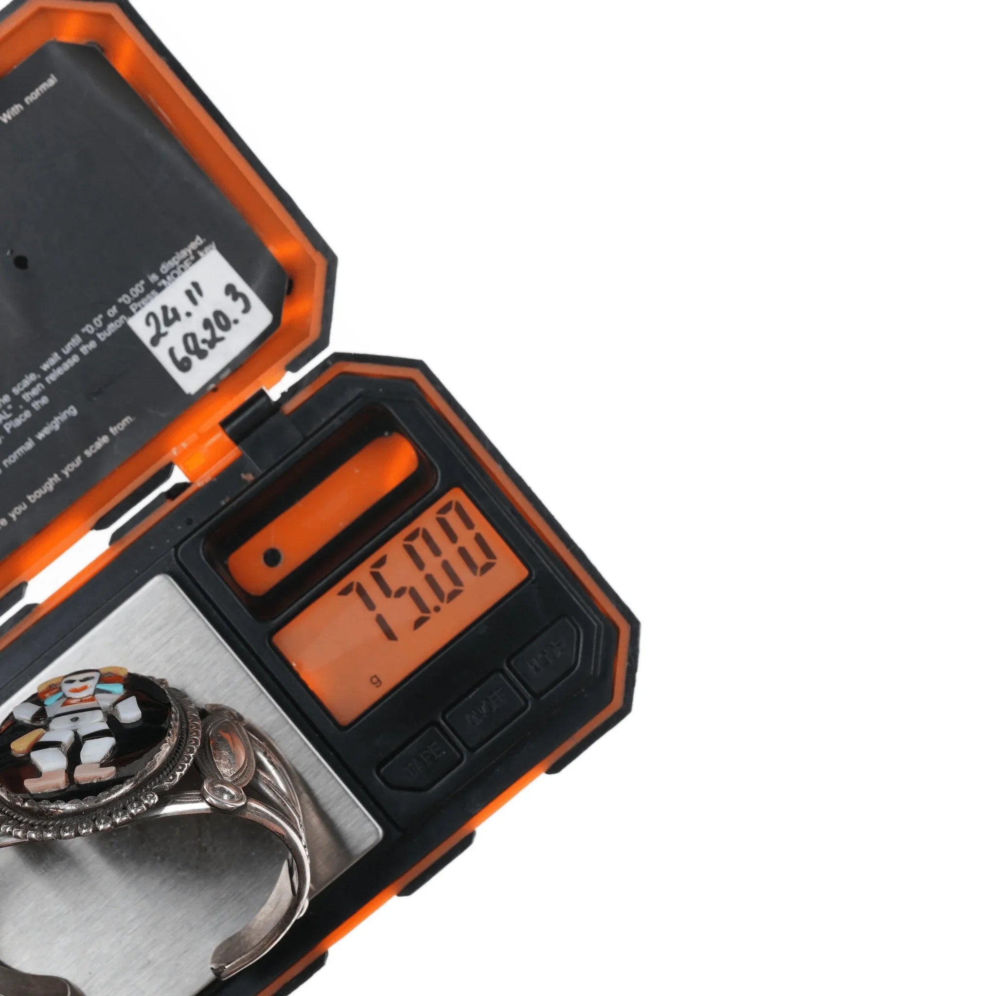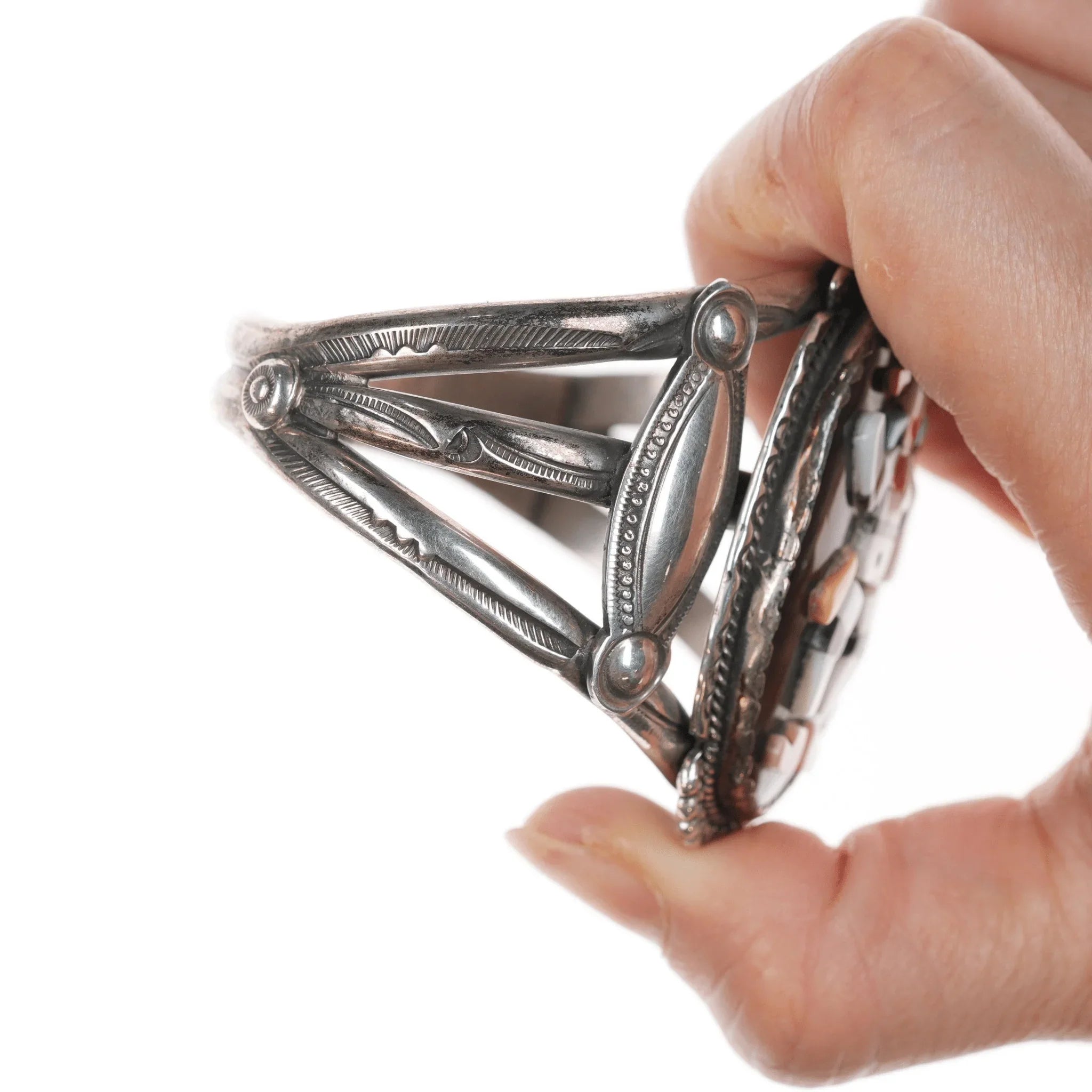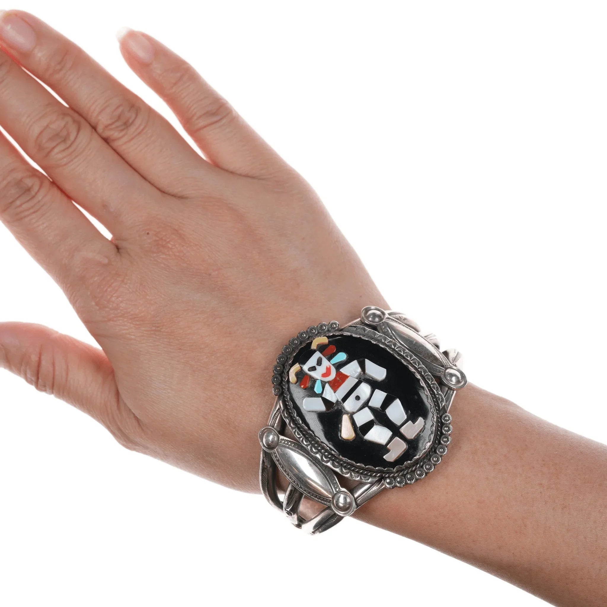 6.5" Bev Etsate Zuni inlaid plaque in Navajo heavy stamped silver cuff bracelet. The silver work on this cuff is way better than any Bev Etsate cuffs I've seen. It's signed on the back illegibly, very nice silverwork. Likely a collaboration.<br><br>Beverly Etsate is an acclaimed Zuni Inlay artist. Bev is the daughter of revered Zuni artists Rosalie and Augustine Pinto. Bev continues her parents’ tradition of inlaid jewelry by producing jewelry in the same style as her elders. As she had learned from her parents she has been a teacher to her two sons Carl Etsate a fetish carver and Todd Etsate as well as her daughter Tracy Bowekaty, a jewelry maker who is also following in her mother’s and grandparents’ paths.<br><br>She has over 40 years of experience in her craft. Over that time, she has become one of Zuni's foremost jewelers.<br><br>Her work ranges through all the traditional techniques of Zuni: mosaic inlay, raised inlay, animated, pictorial inlay, and also needlepoint. She creates overlay and inlay figures, blossoms, holiday themes, corn style inlay, and needlepoint. Some of her favorite designs are kachinas, mudheads and bears. A great sense of humor is evident in many of her holiday pieces.<br><br> Marked or unmarked as shown in pics, weight and other measurements in pics. Sorry but my jewelry is stored in a secure location and cannot be accessed for more pictures,<br>videos, or measurements until sold. If you look at pictures/description your<br>question should be answered. Thank you so much for your time and consideration!<br><br>All precious metals are tested and guaranteed. A Native American jewelry piece referred to as "silver" or "ingot" is guaranteed to be at least 90% silver. Bracelets are photographed on a 6" women's wrist.