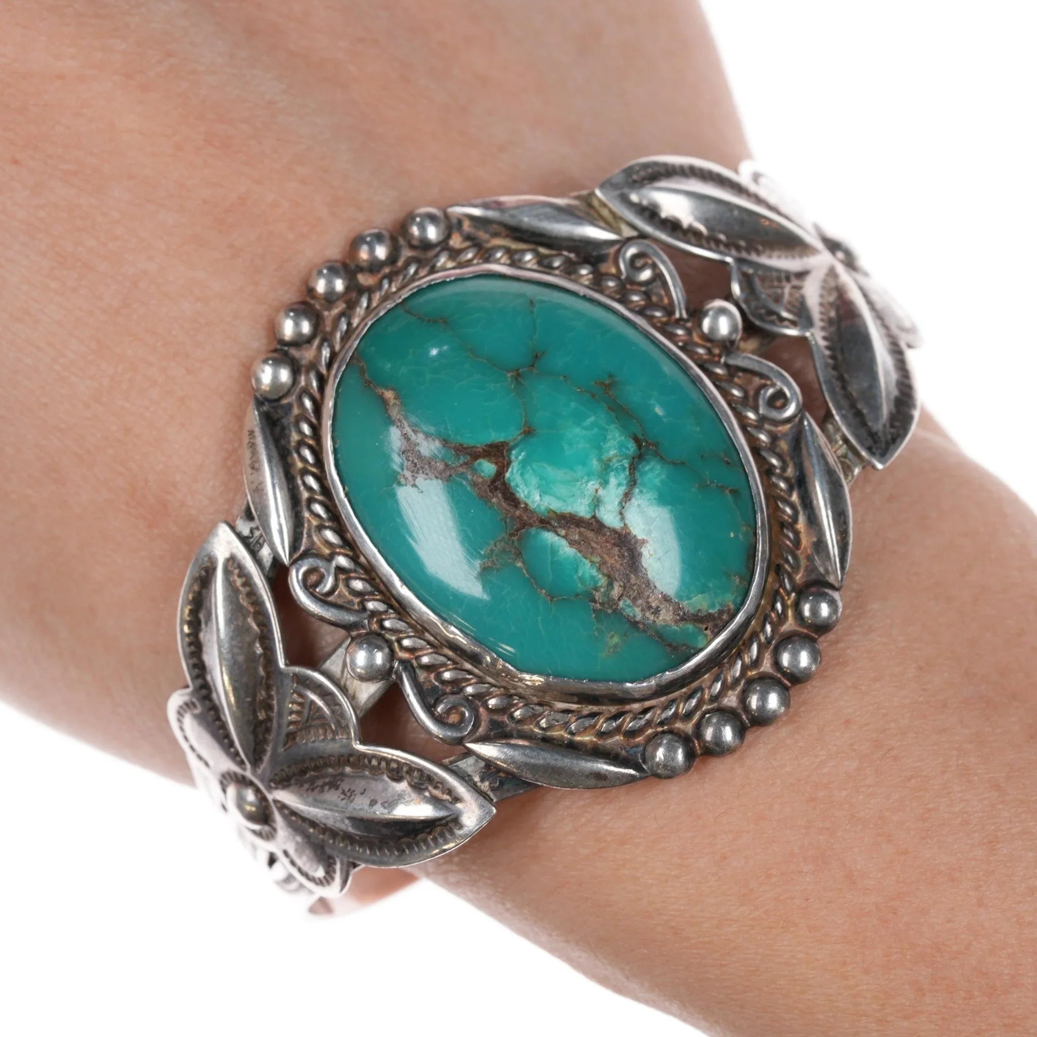 6.5" c1950‘s Bell Trading Post Navajo Curio sterling green turquoise cuff bracelet (mid 20th century) Solid sterling, weight and measurements in pics.