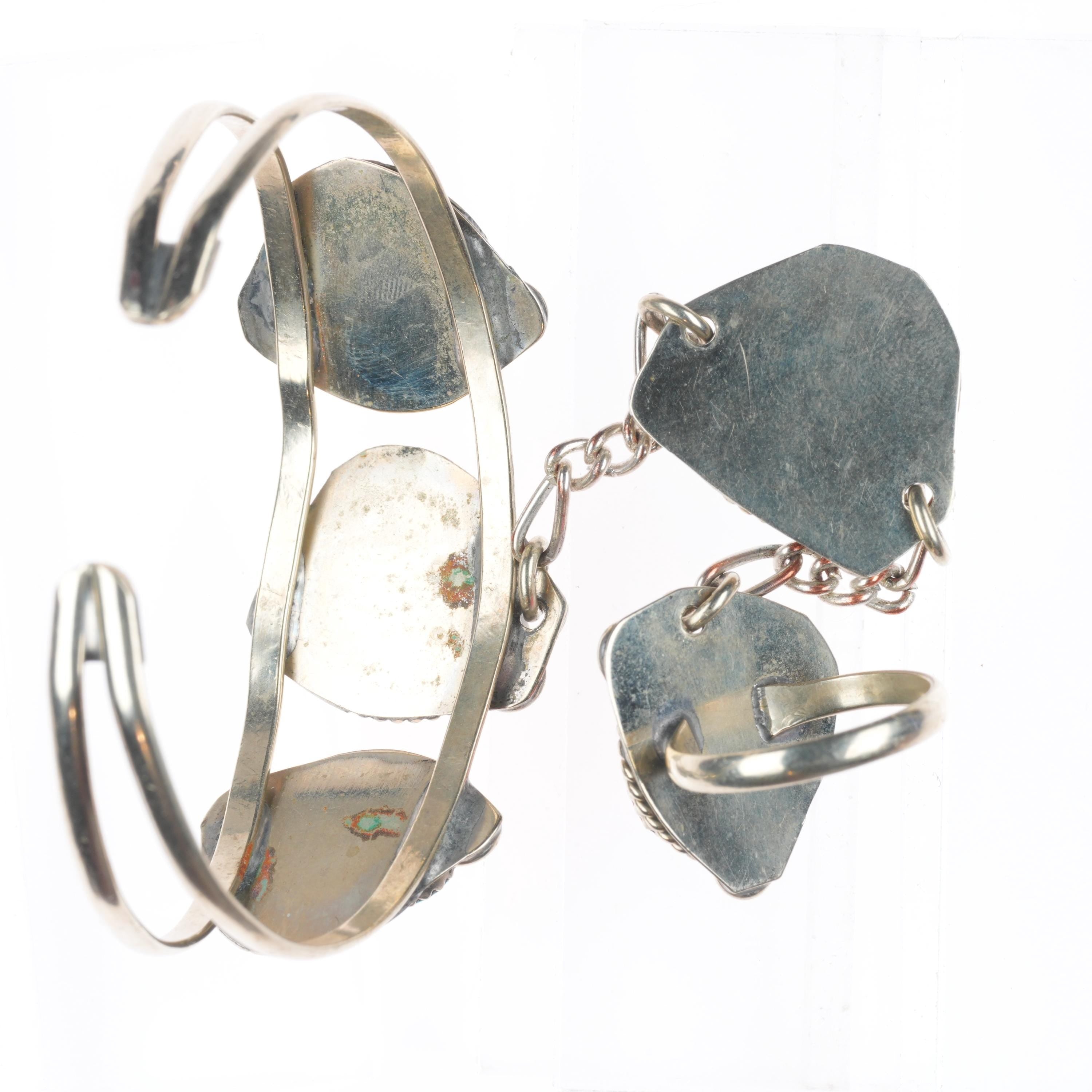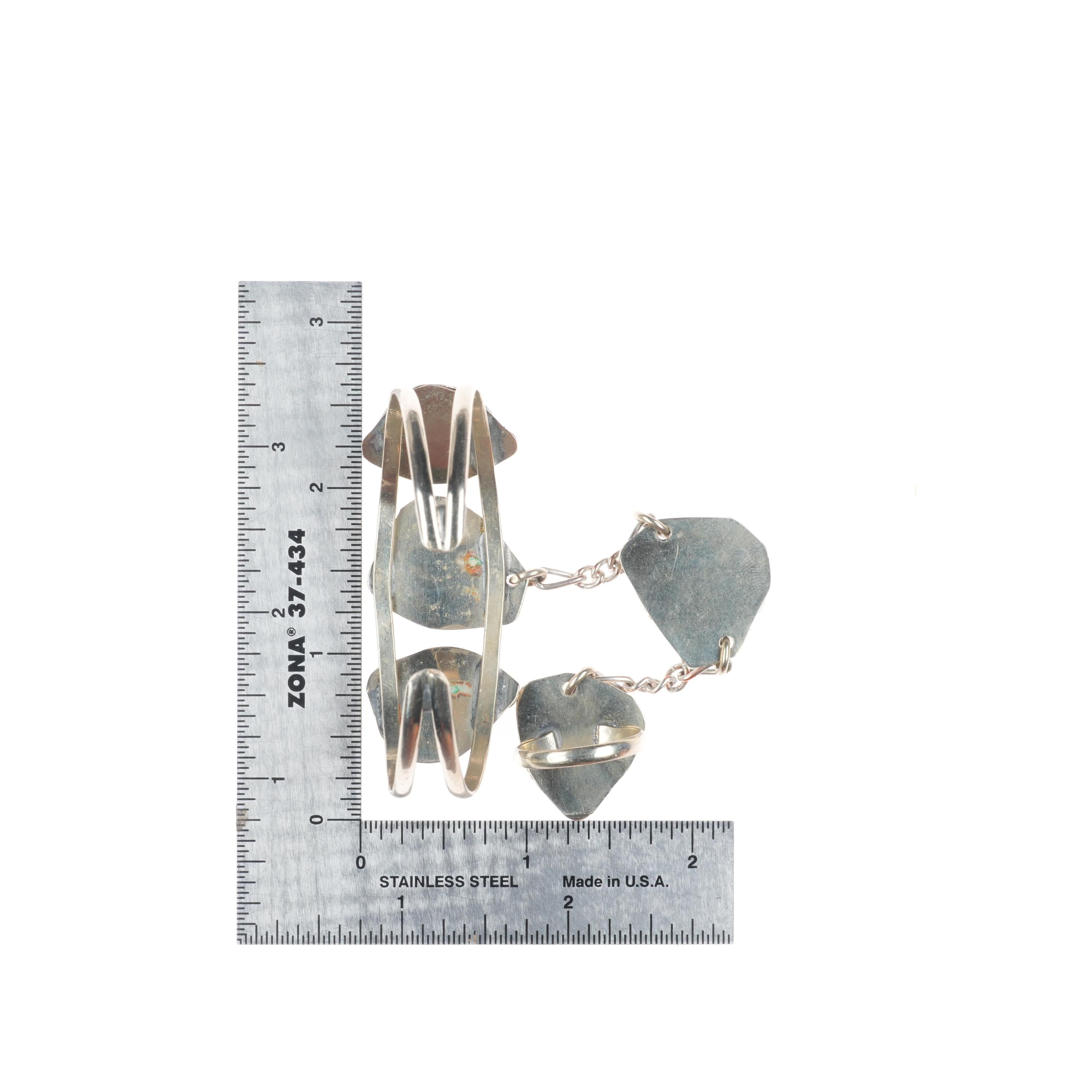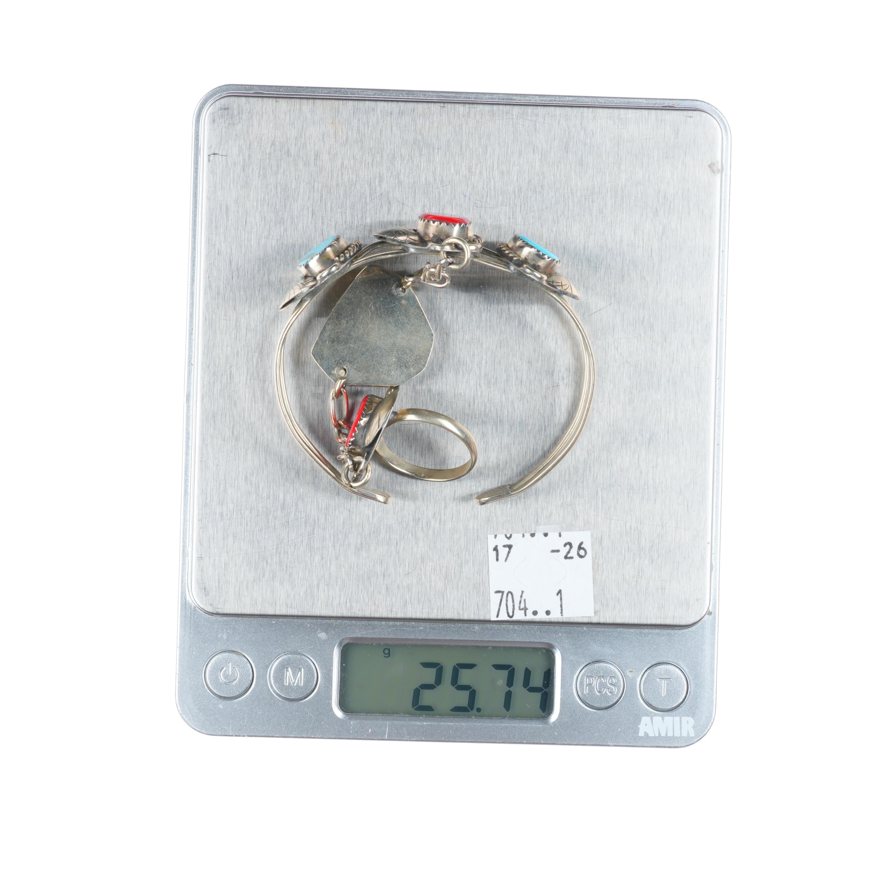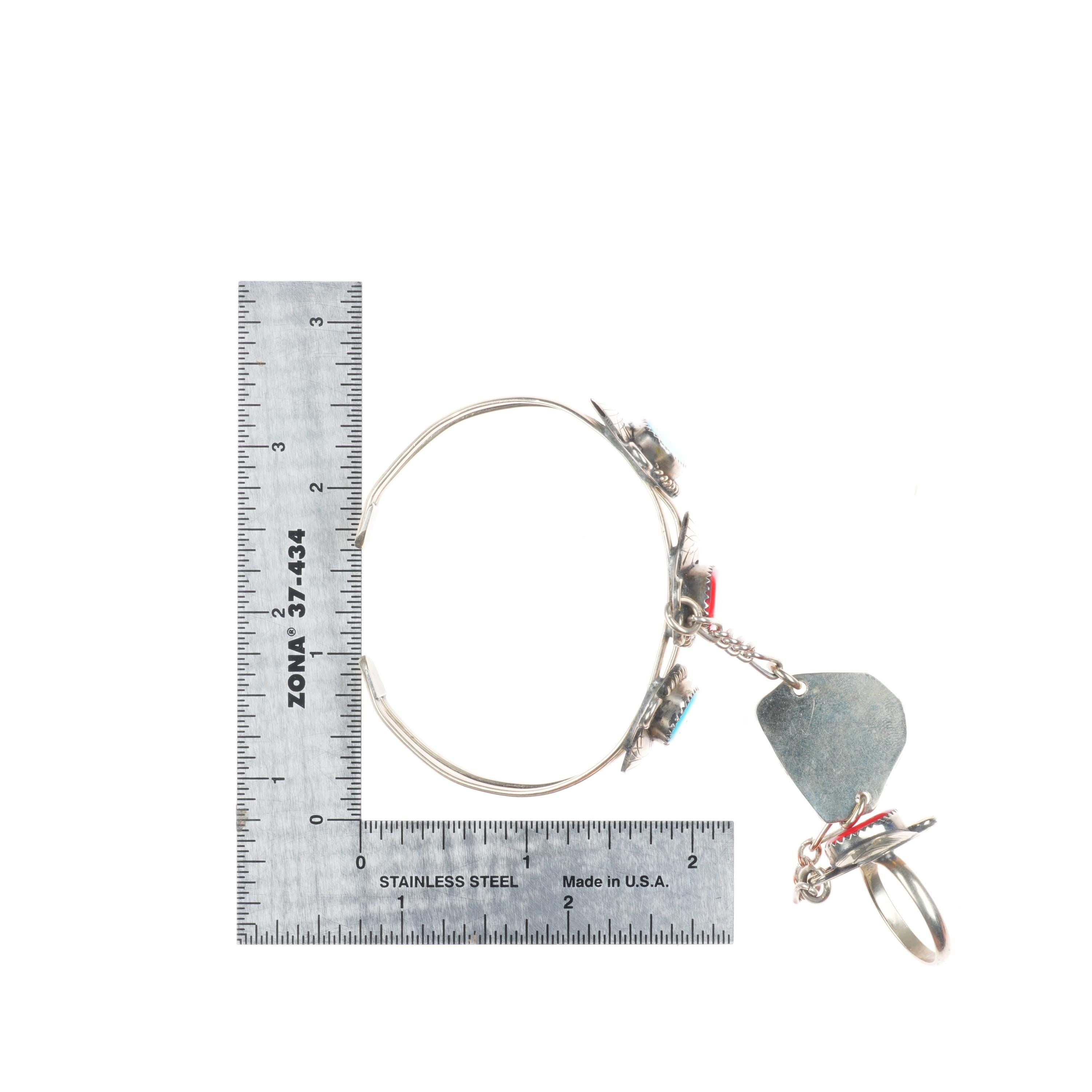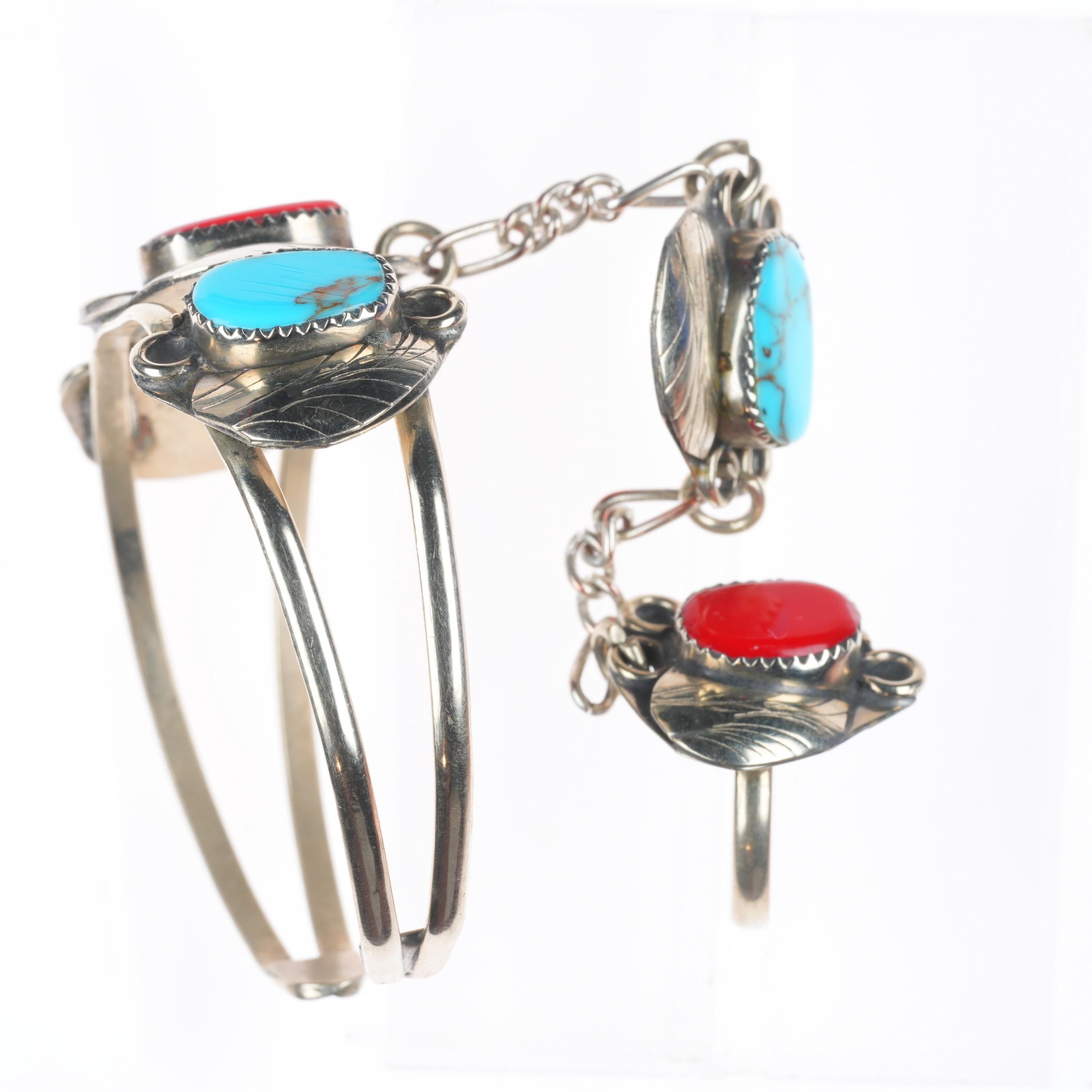 6.5" cuff sz7.5 Ring southwestern alpaca/faux turquoise/coral slave bracelet. Faux stones and alpaca, not silver, circa last quarter of the 20th century. While I'm happy to answer any questions or concerns, I beg you to take the time to look through all of the photos as they should answer them. There should be around 10 photos. If no marking is mentioned or photographed please assume that it's unmarked as is common with Native American jewelry of this era.