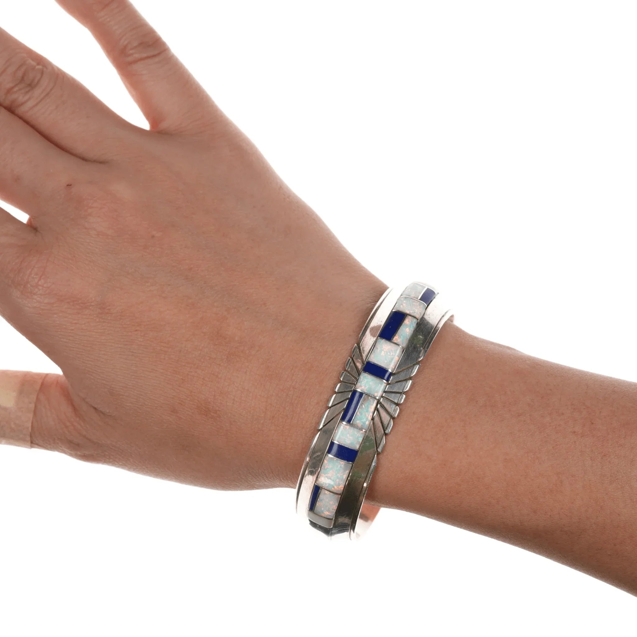 6.5" JB Native American sterling channel inlay Opal and Lapis cuff bracelet