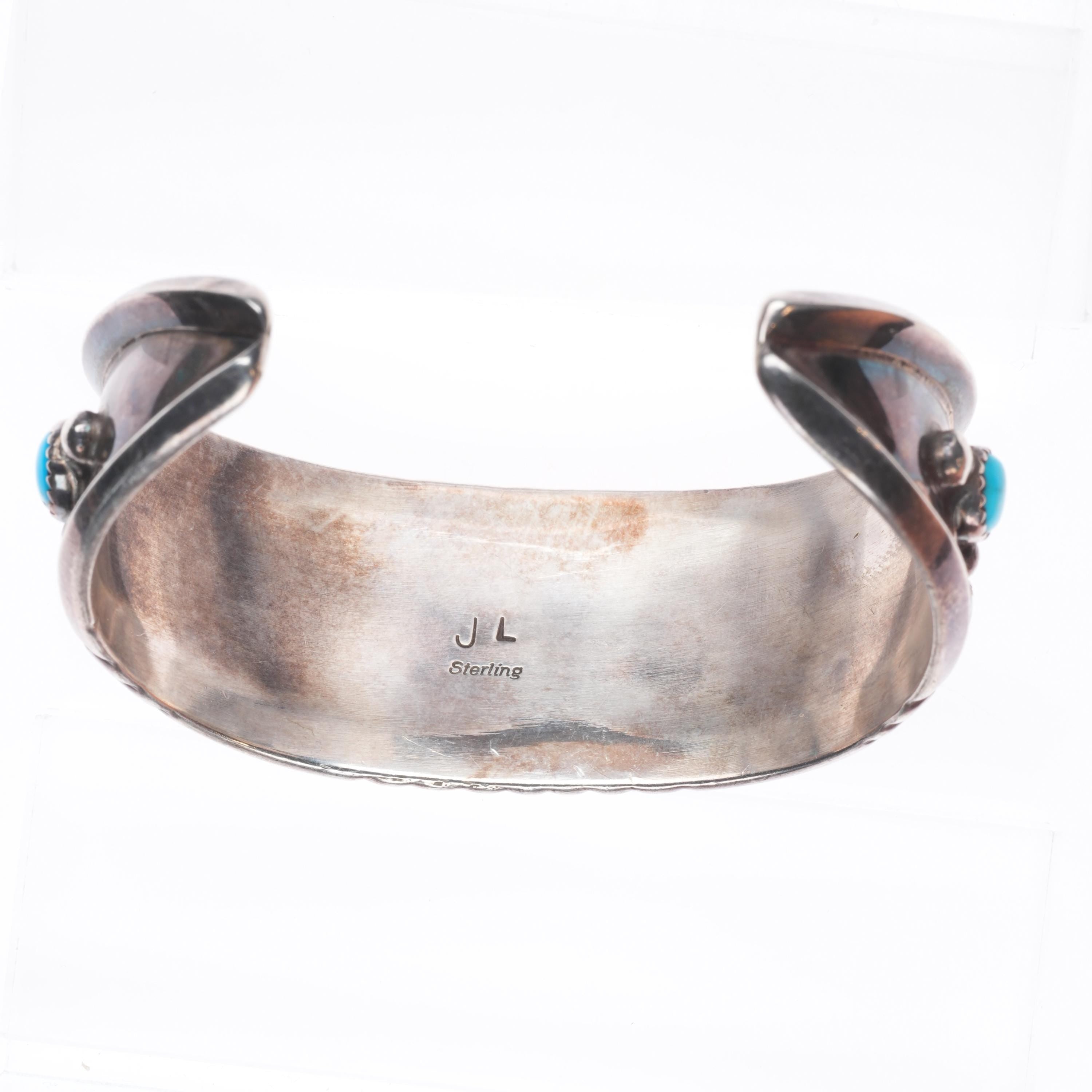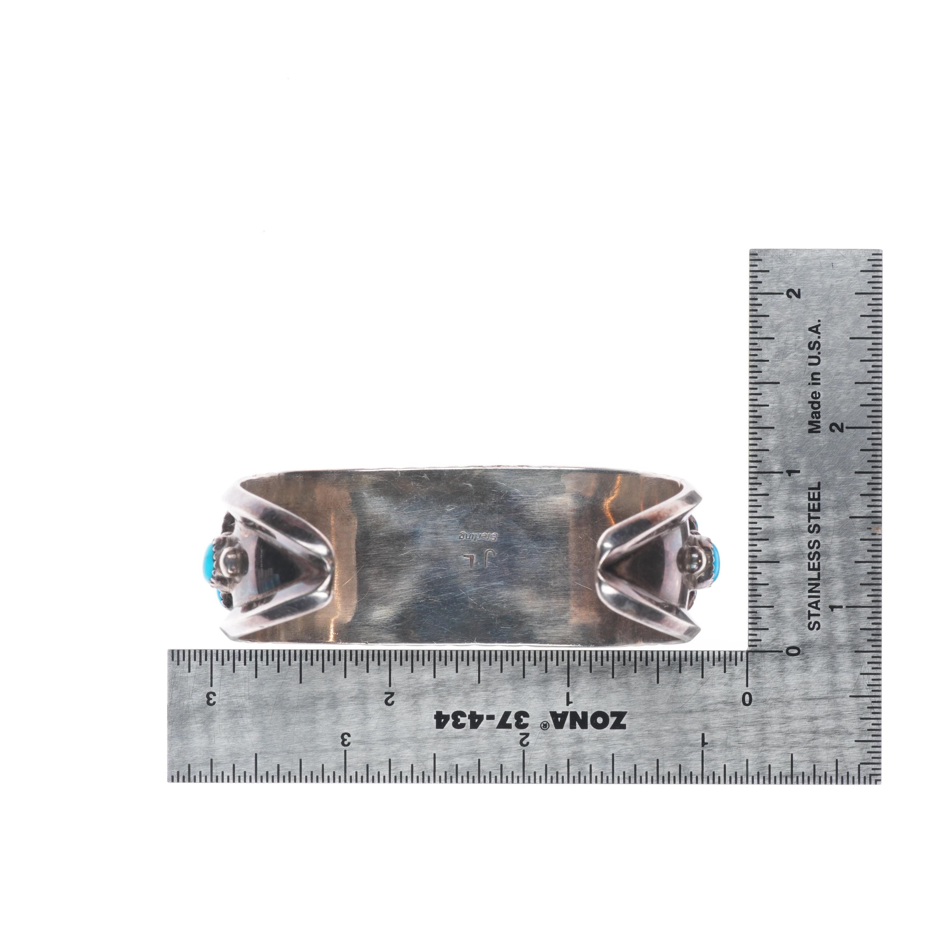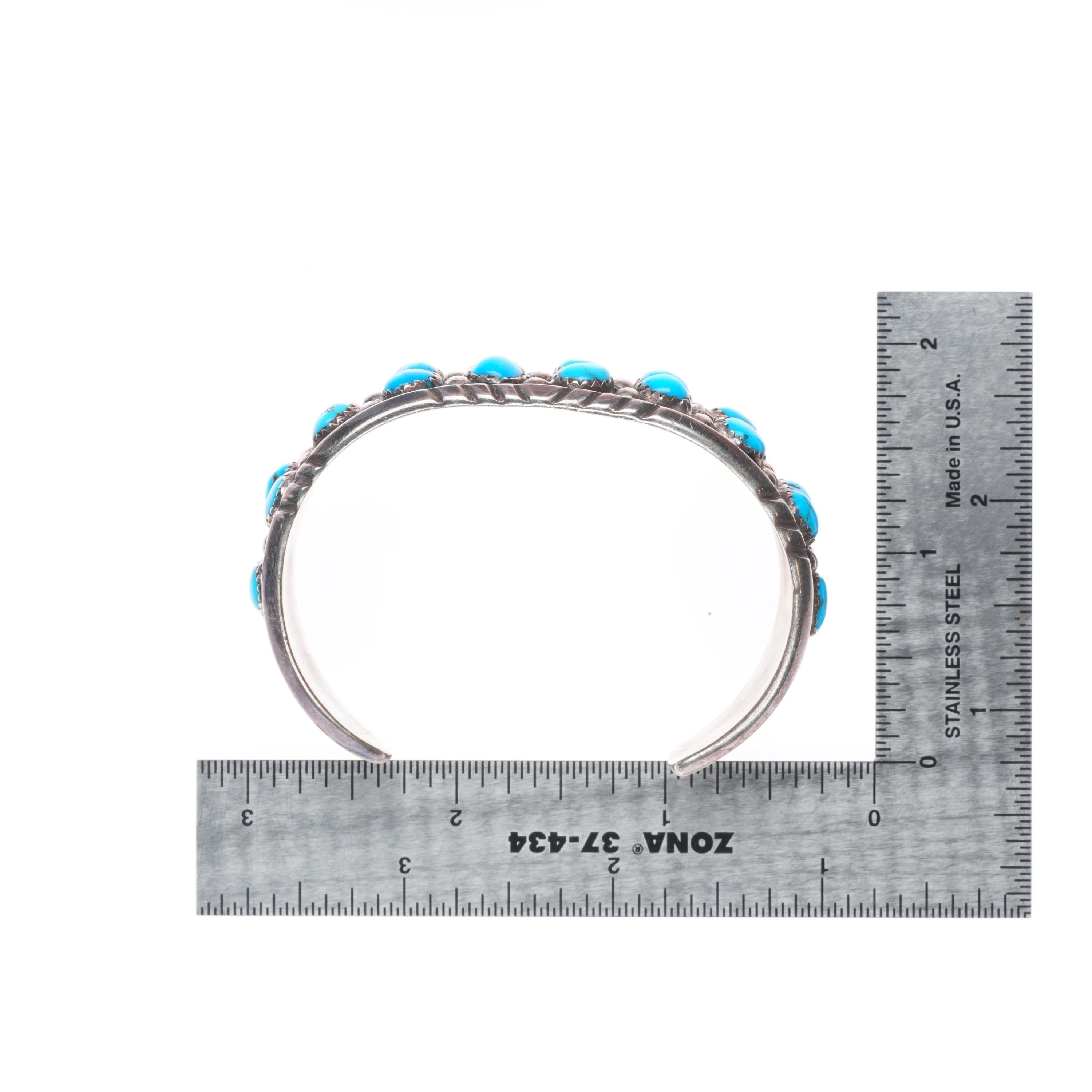 6.5" Jones Latome Navajo sterling silver turquoise cluster cuff bracelet. Tested and guaranteed solid sterling silver with weight and measurements in pictures. Circa last quarter of the 20th century with age appropriate wear..