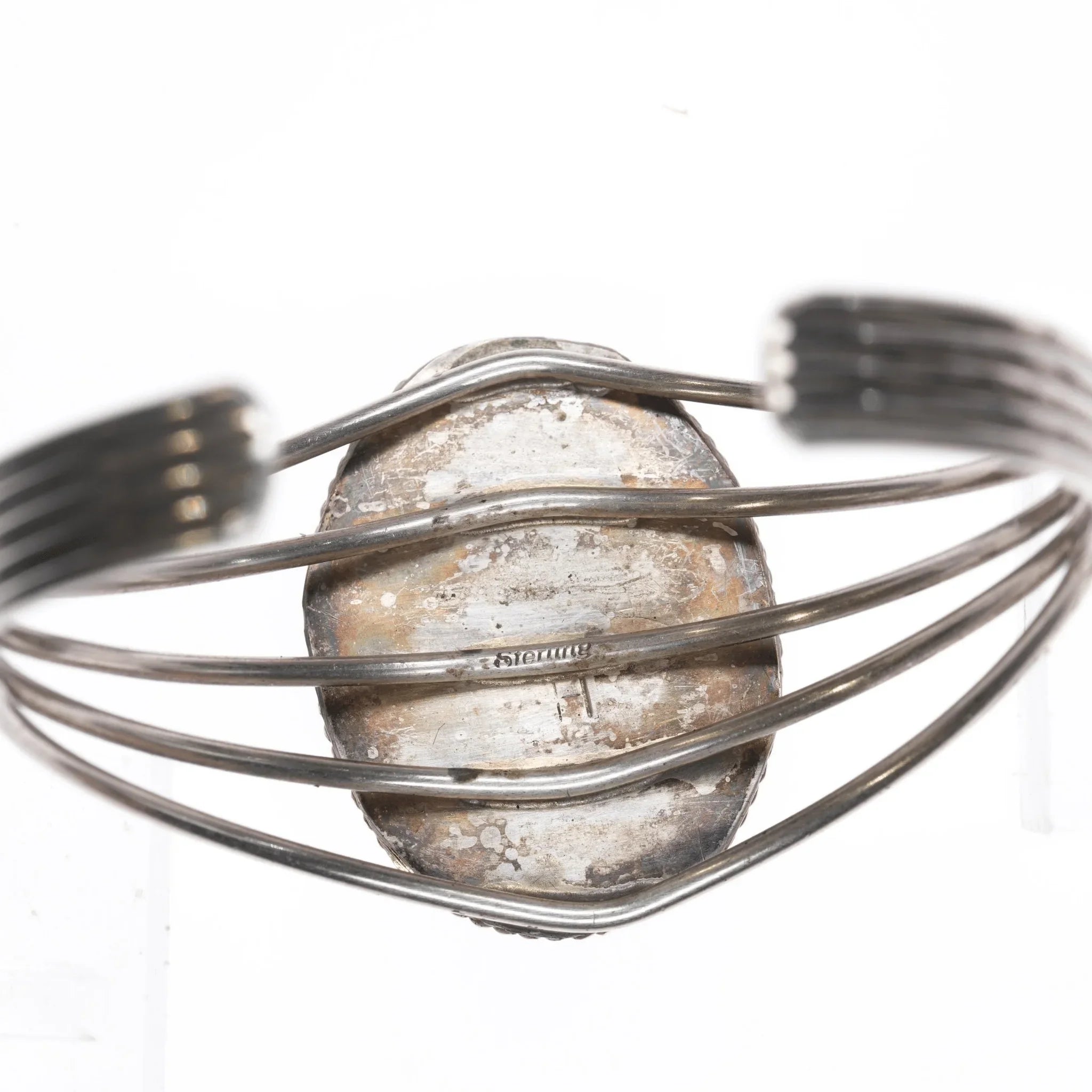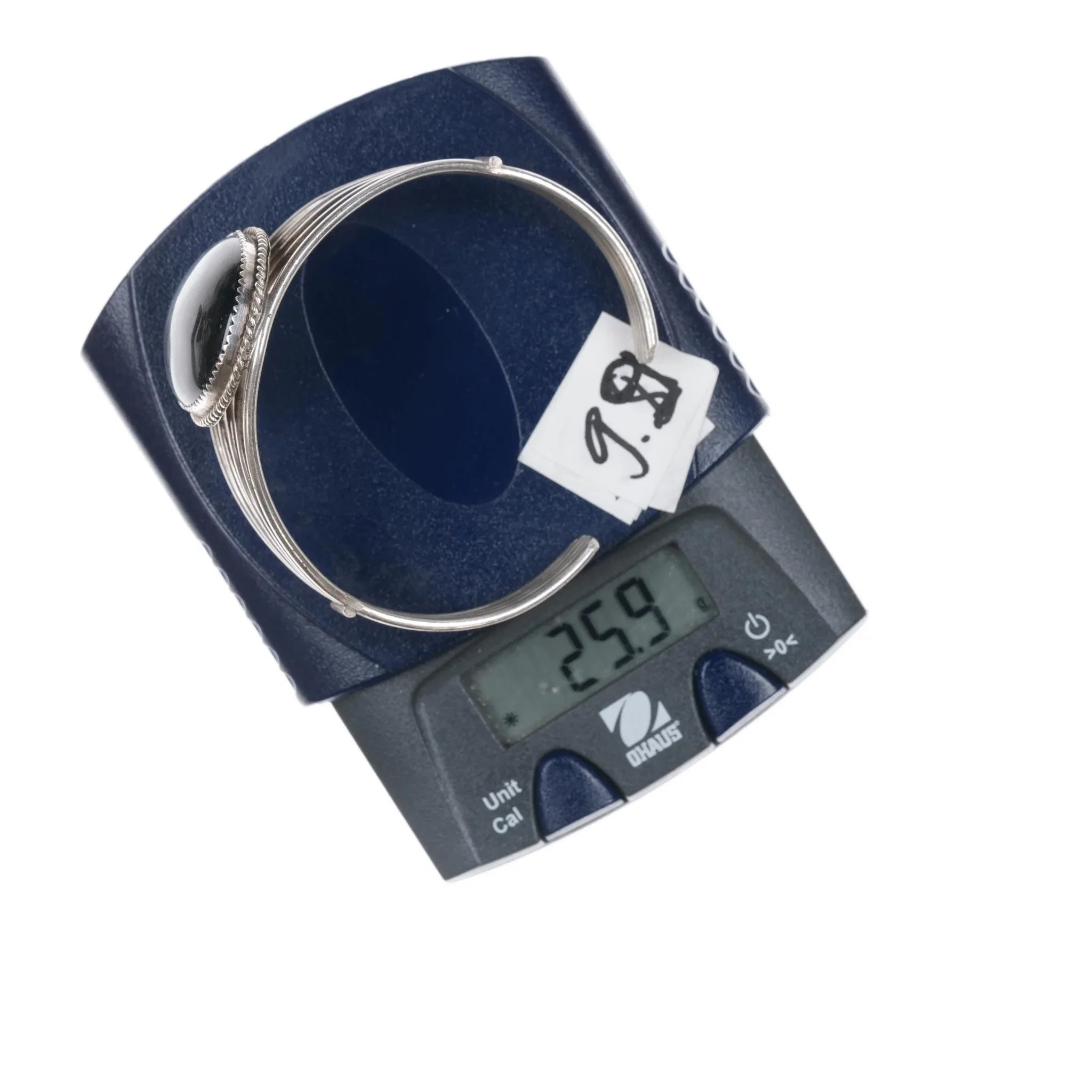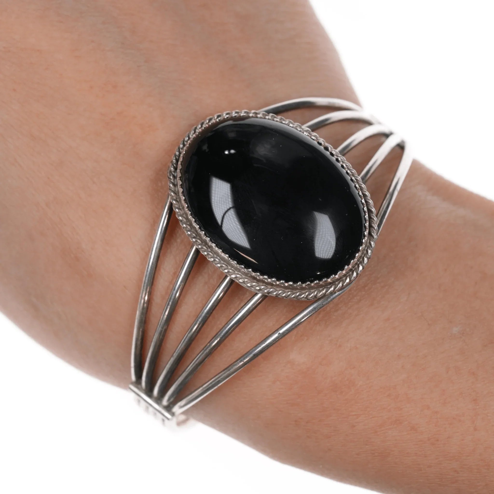 6.5" Retro Native American H Springy sterling and onyx cuff bracelet. H hallmark, no issues. Nice springy sterling wire