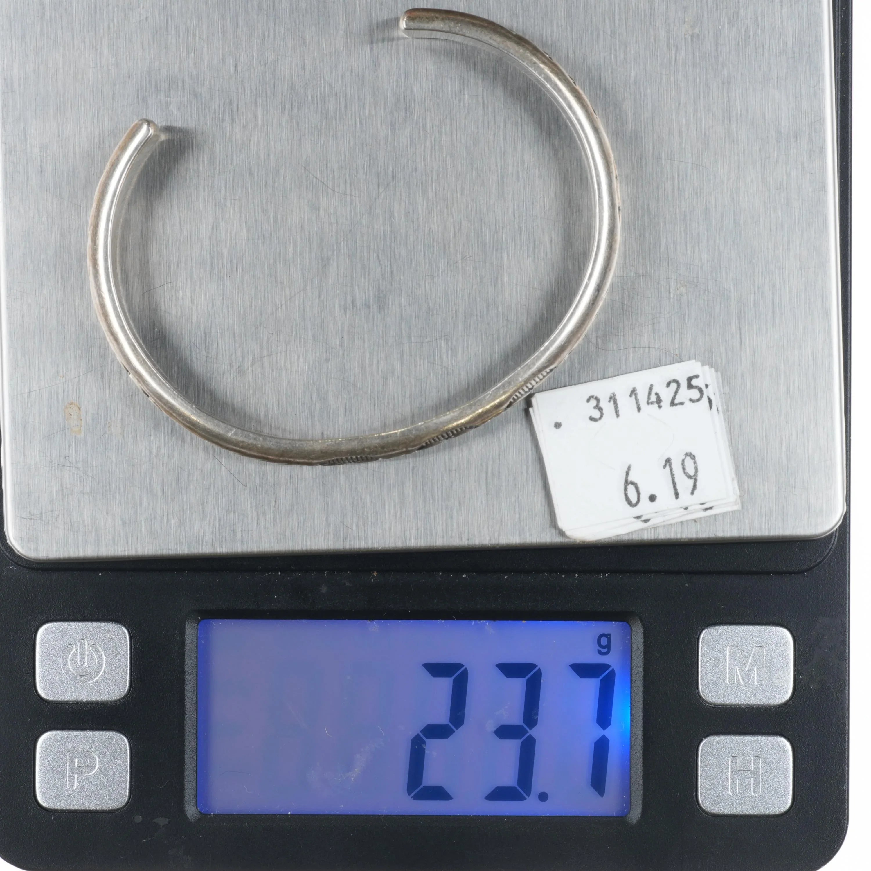 6.5" Sharon Cisco Navajo slim stacker hand stamped sterling silver cuff bracelet. Tested and guaranteed solid sterling silver with the markings shown . Some expected wear, no damage. Weight and measurements in pictures. Circa last quarter of the 20th century.