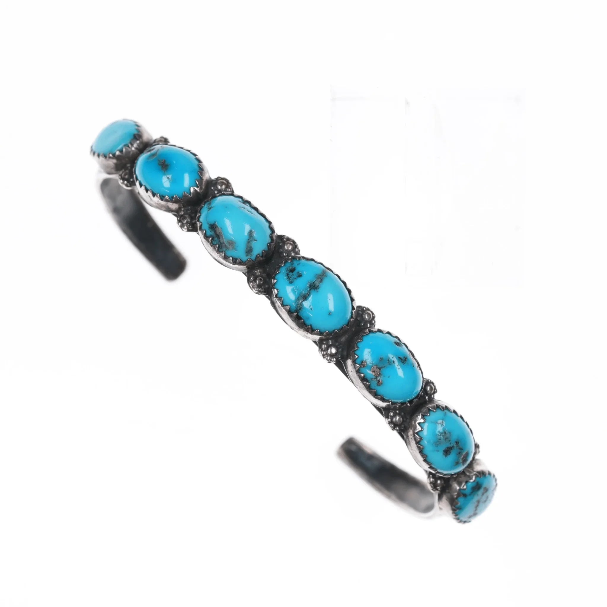 6.5" Sturdy Vintage Hand stamped sterling turquoise row cuff bracelet. No issues, nice hand stamped design on edges.