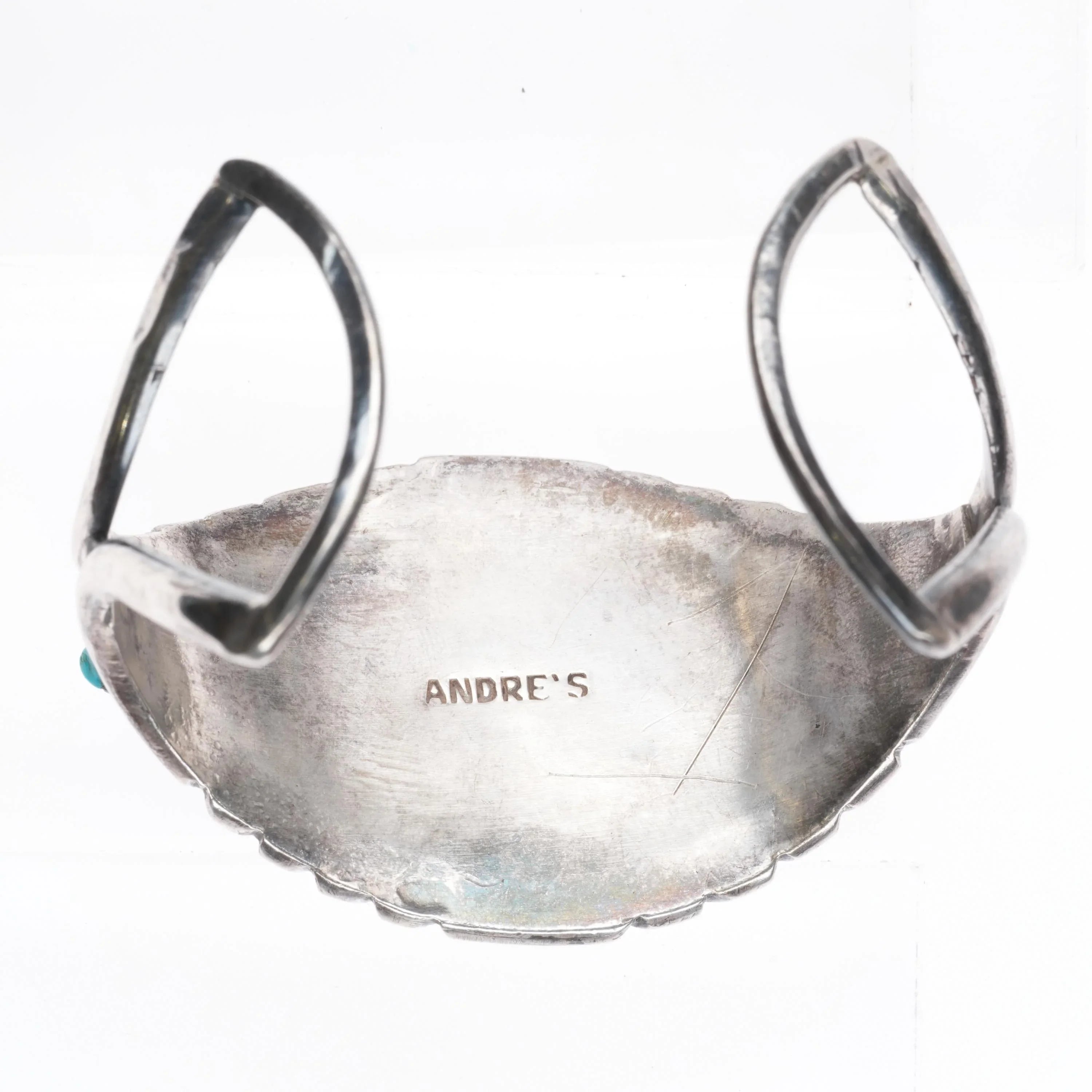 6.5" Vintage 70‘s-80‘s Andre‘s Navajo sterling silver turquoise cuff bracelet. Tested and guaranteed solid sterling silver. Weight and measurements in pictures. Some expected wear with no damage.