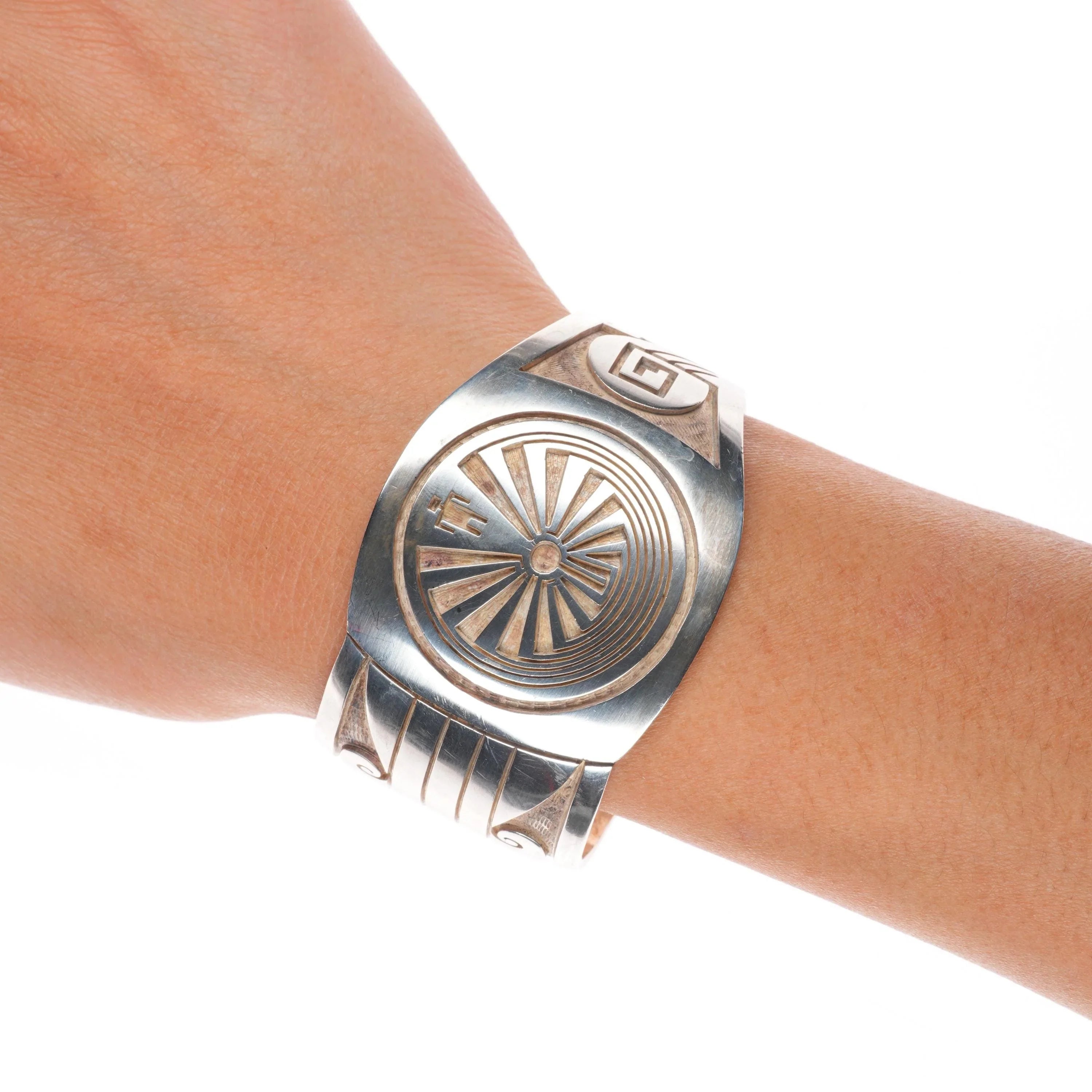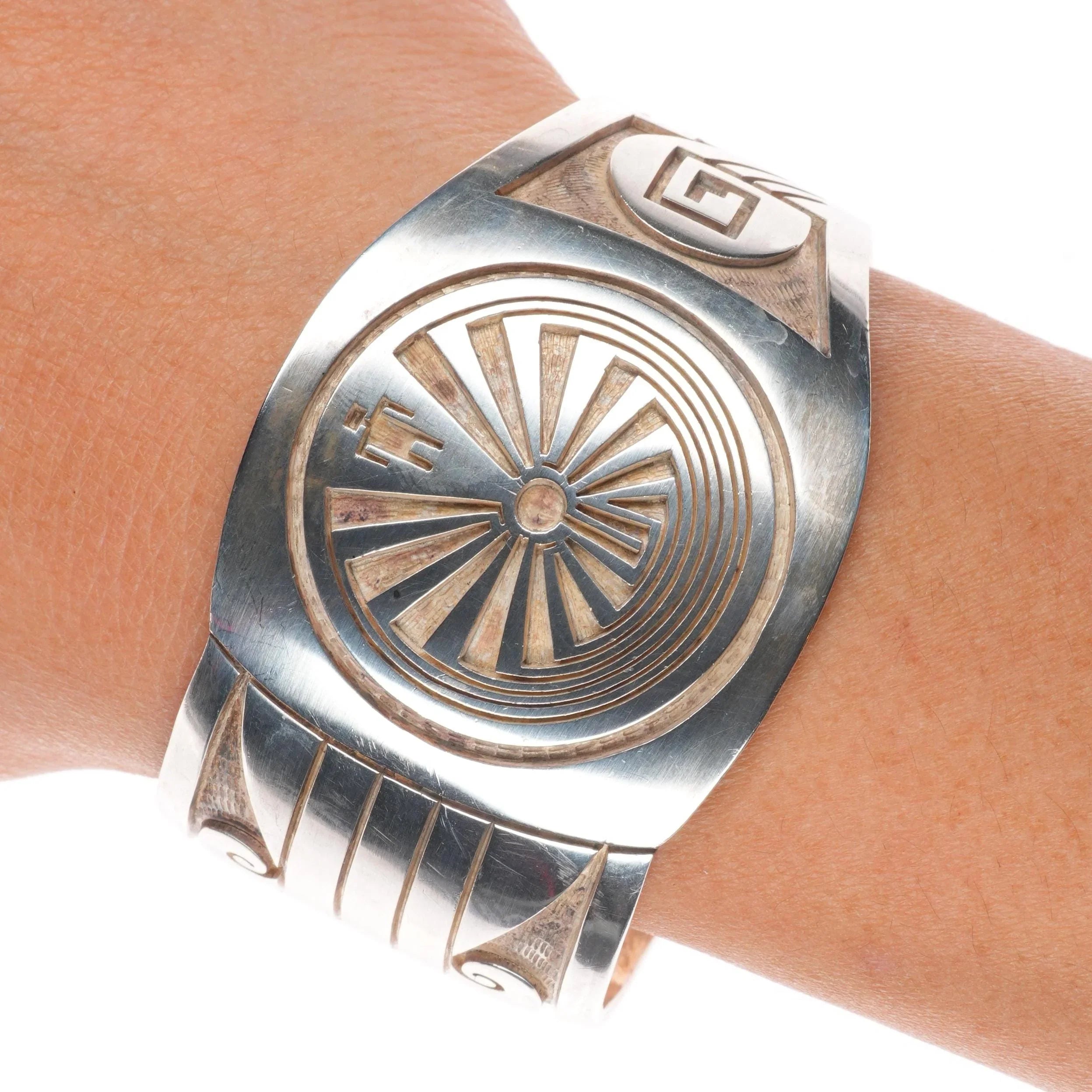 6.5" Vintage Hopi overlay Man in the Maze sterling silver cuff bracelet. Tested and guaranteed solid sterling silver with weight and measurements in pictures. Circa last quarter of the 20th century. Picto-hallmark as shown. I recognize it but don‘t have time to look into it.