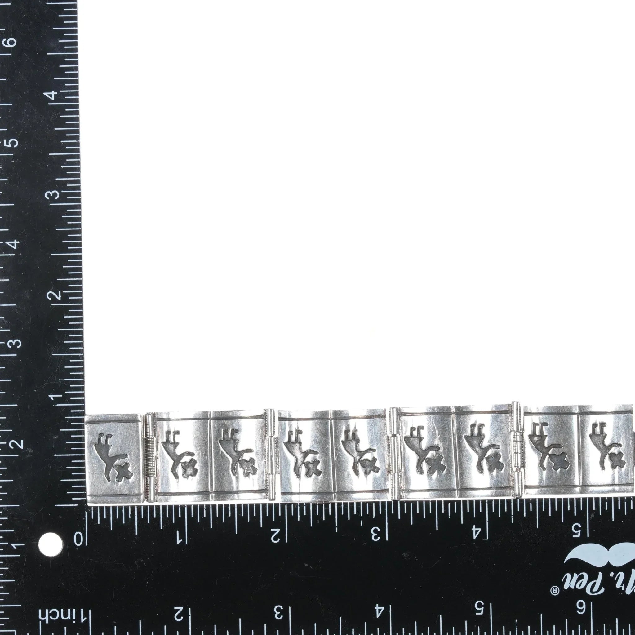 6.5" Vintage Native American silver Kachina dancer link bracelet. Solid sterling, weight and measurements in pics, unmarked as typical of this era (third quarter of the 20th century)