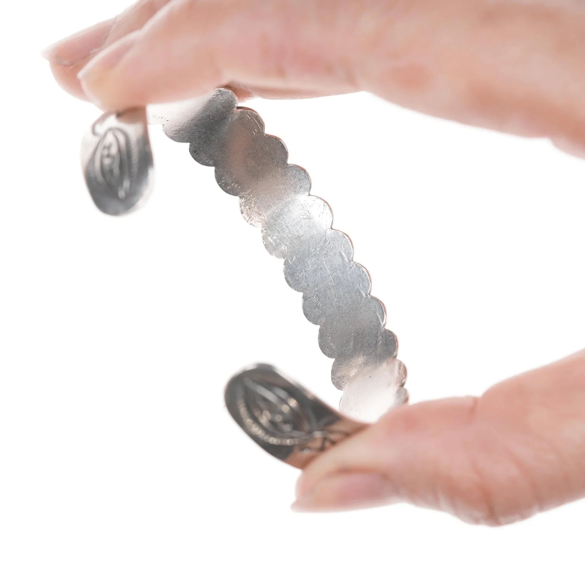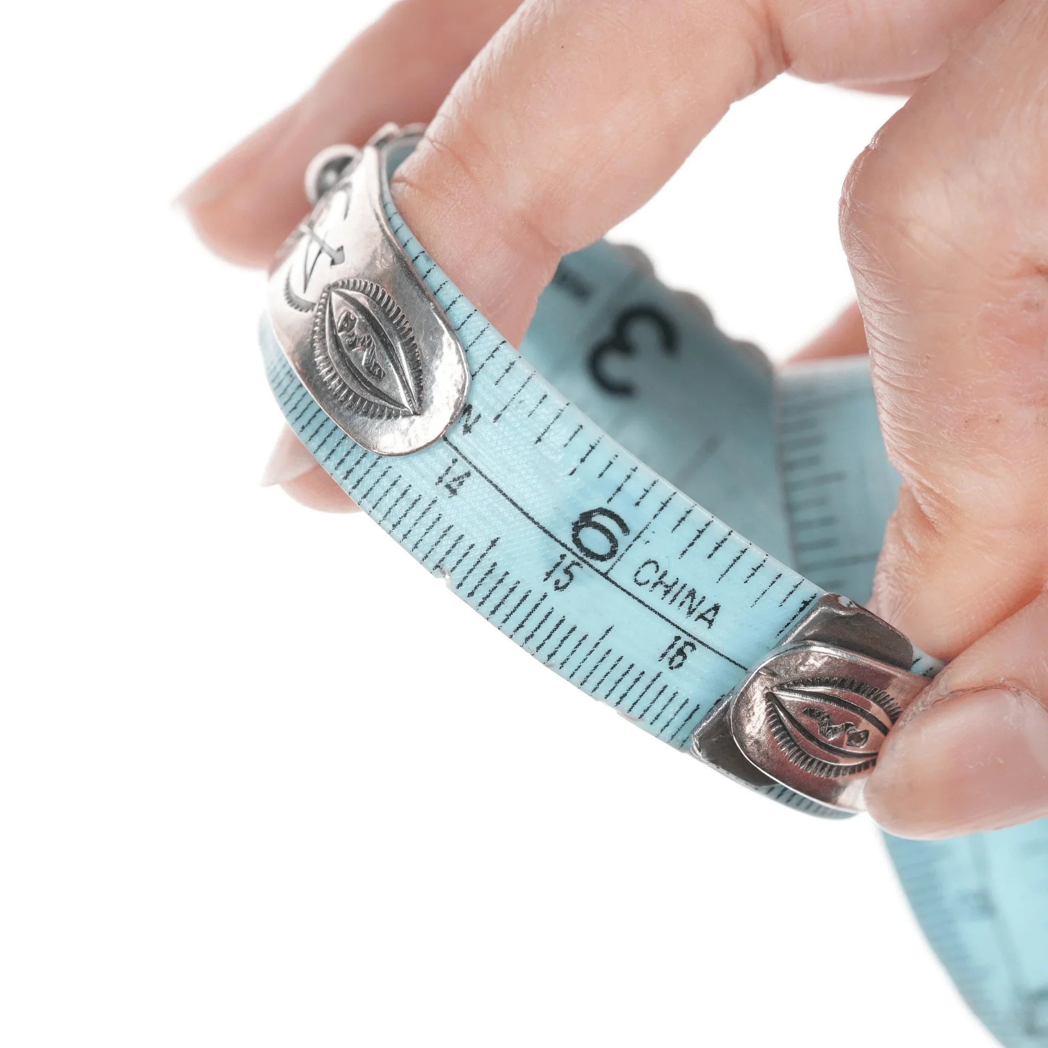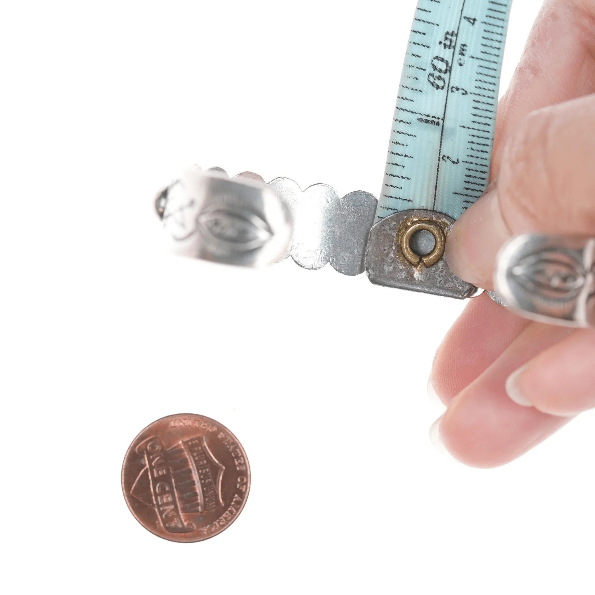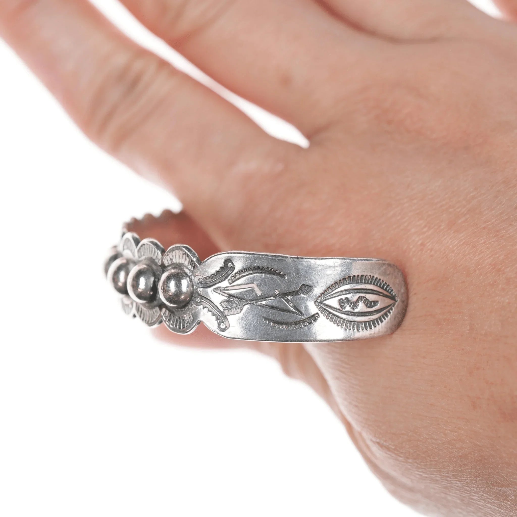 6.5" Vintage Navajo curio Hand stamped silver cuff bracelet <br><br>Marked or unmarked as shown in pics, weight and other measurements in pics. Sorry but my jewelry is stored in a secure location and cannot be accessed for more pictures,<br>videos, or measurements until sold. If you look at pictures/description your<br>question should be answered. Thank you so much for your time and consideration! If you would like to chat, that would be great, but lets chat about something that isn't answered in this listing that we put so much effort into already :)<br><br>All precious metals are tested and guaranteed. A Native American jewelry piece referred to as "silver" or "ingot" is guaranteed to be at least 90% silver. I rarely use the word "sterling" when referring to older Native American silver or really any older silver jewelry as silver contents vary and "sterling" is 92.5% silver. No older jewelry is going to be exactly 92.5% silver, some a little over, some a little under. It wasn't an exact thing with handmade jewelry. I've seen thousands of pieces xrf'd to prove this. Bracelets are photographed on a 6" women's wrist.<br><br>anderas
