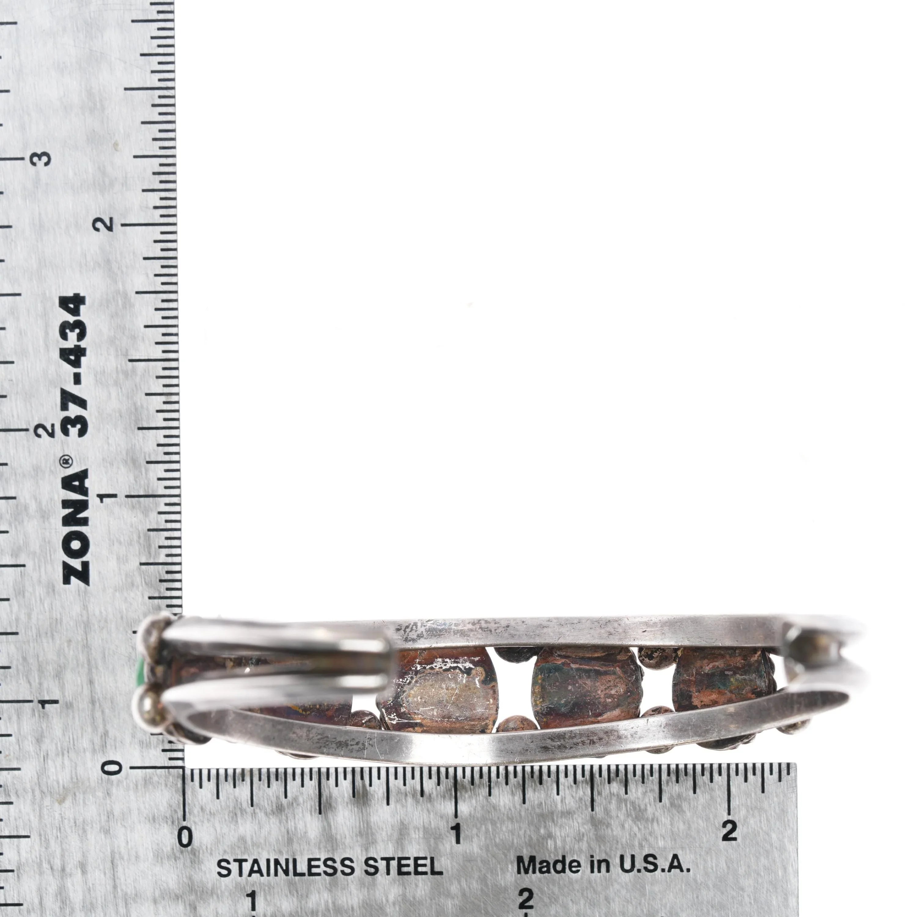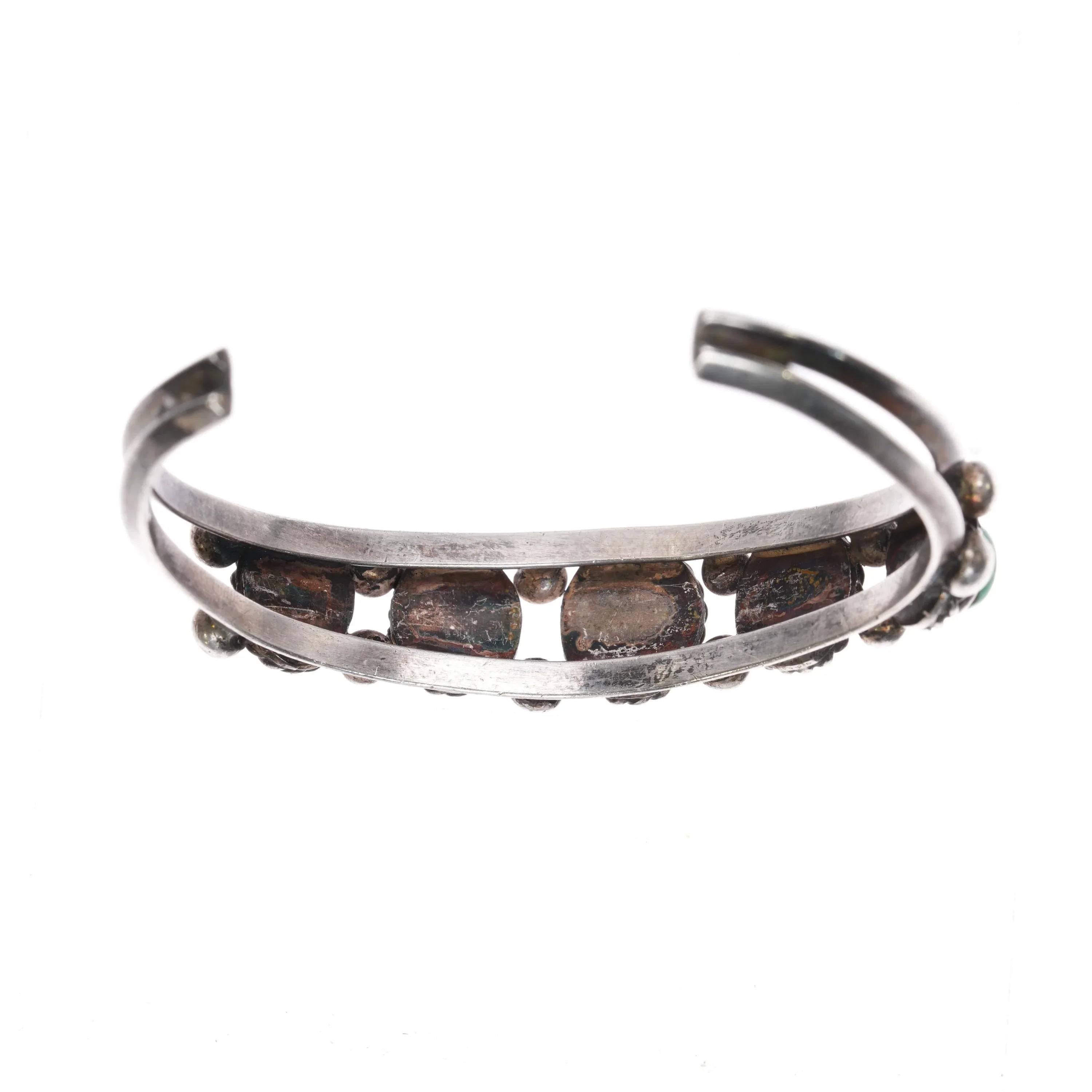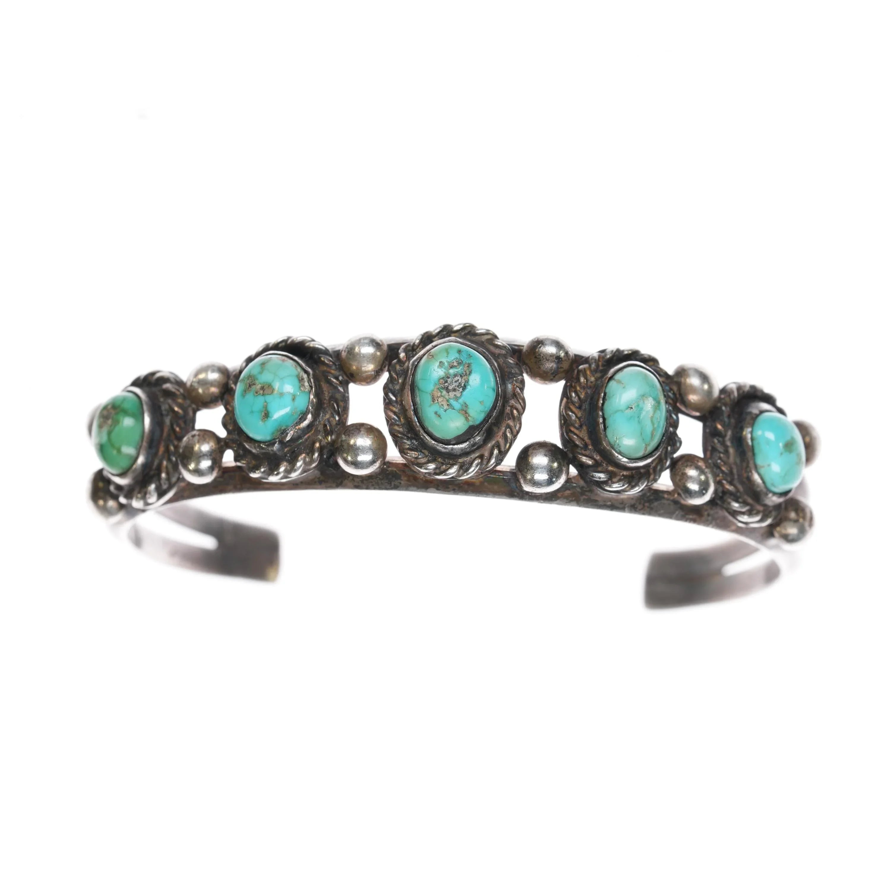 6.5" Vintage Navajo sterling row cuff bracelet with rope bezels. 50‘s-60‘s, unmarked, solid sterling. Sturdy with no damage or significant wear.