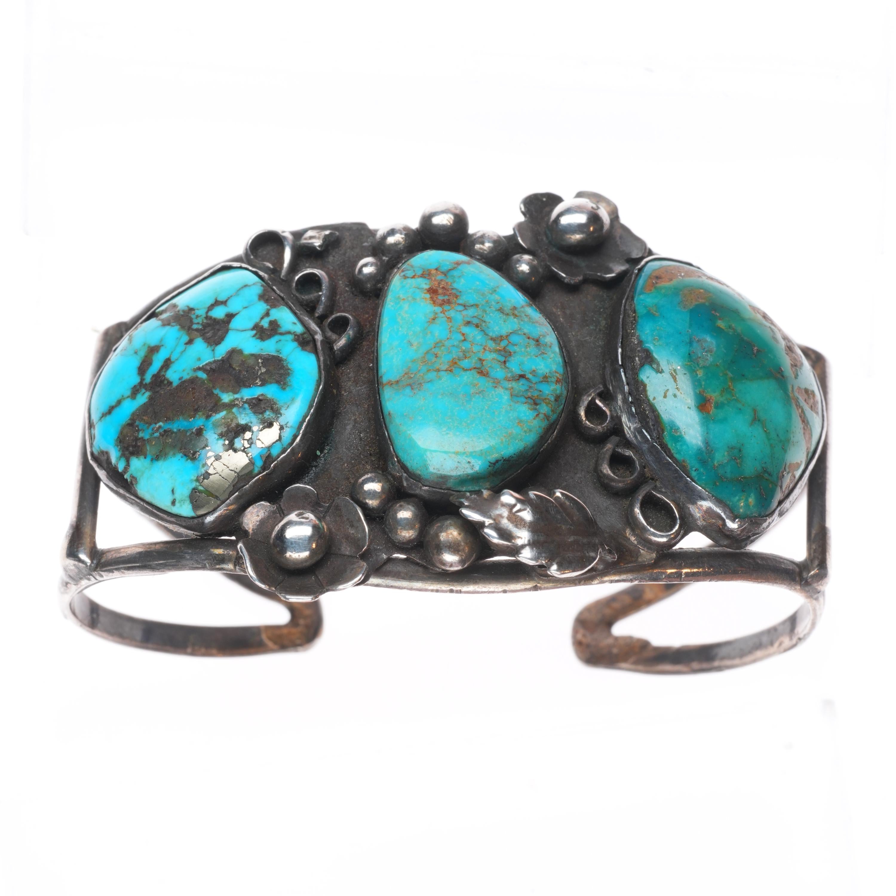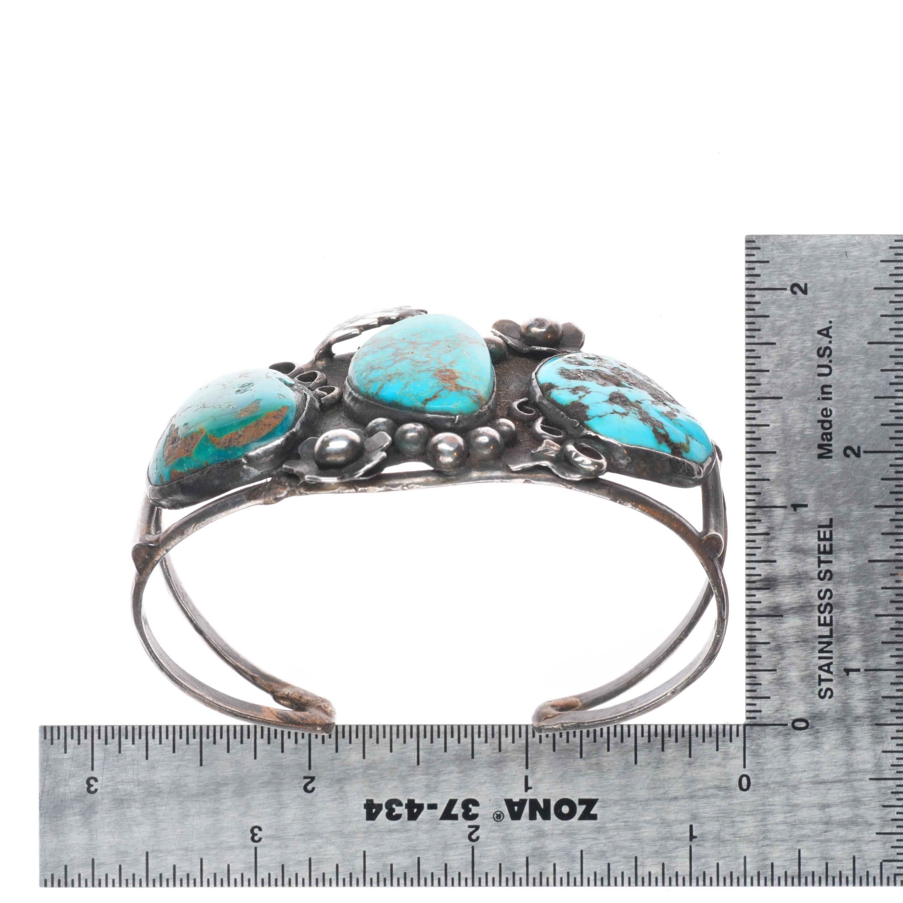 6.5" Vintage Navajo sterling silver 3 stone multi-mine turquoise cuff bracelet. Tested and guaranteed solid sterling silver with weight and measurements in pictures. Circa third quarter of the 20th century. Fits up to a 6.5" wrist.