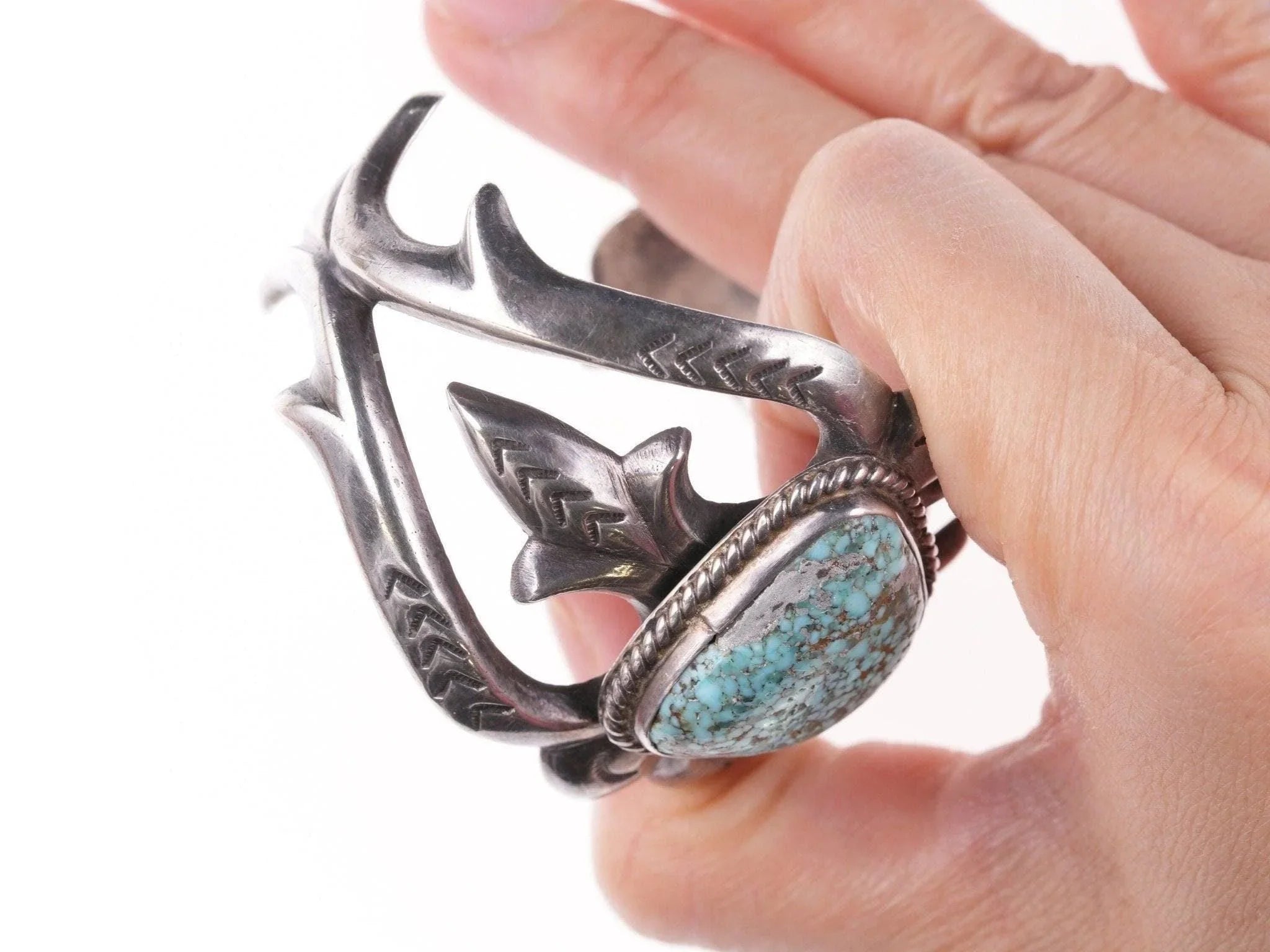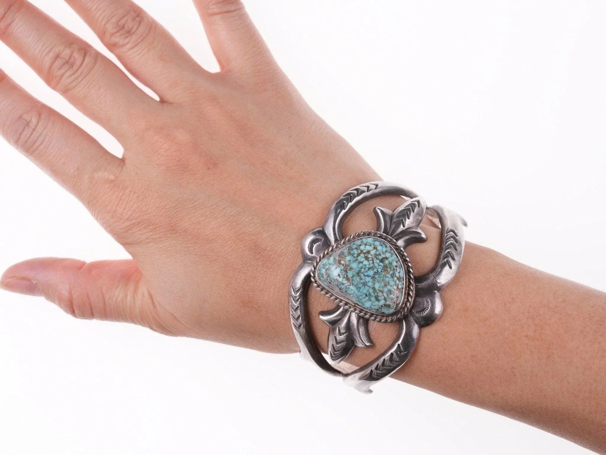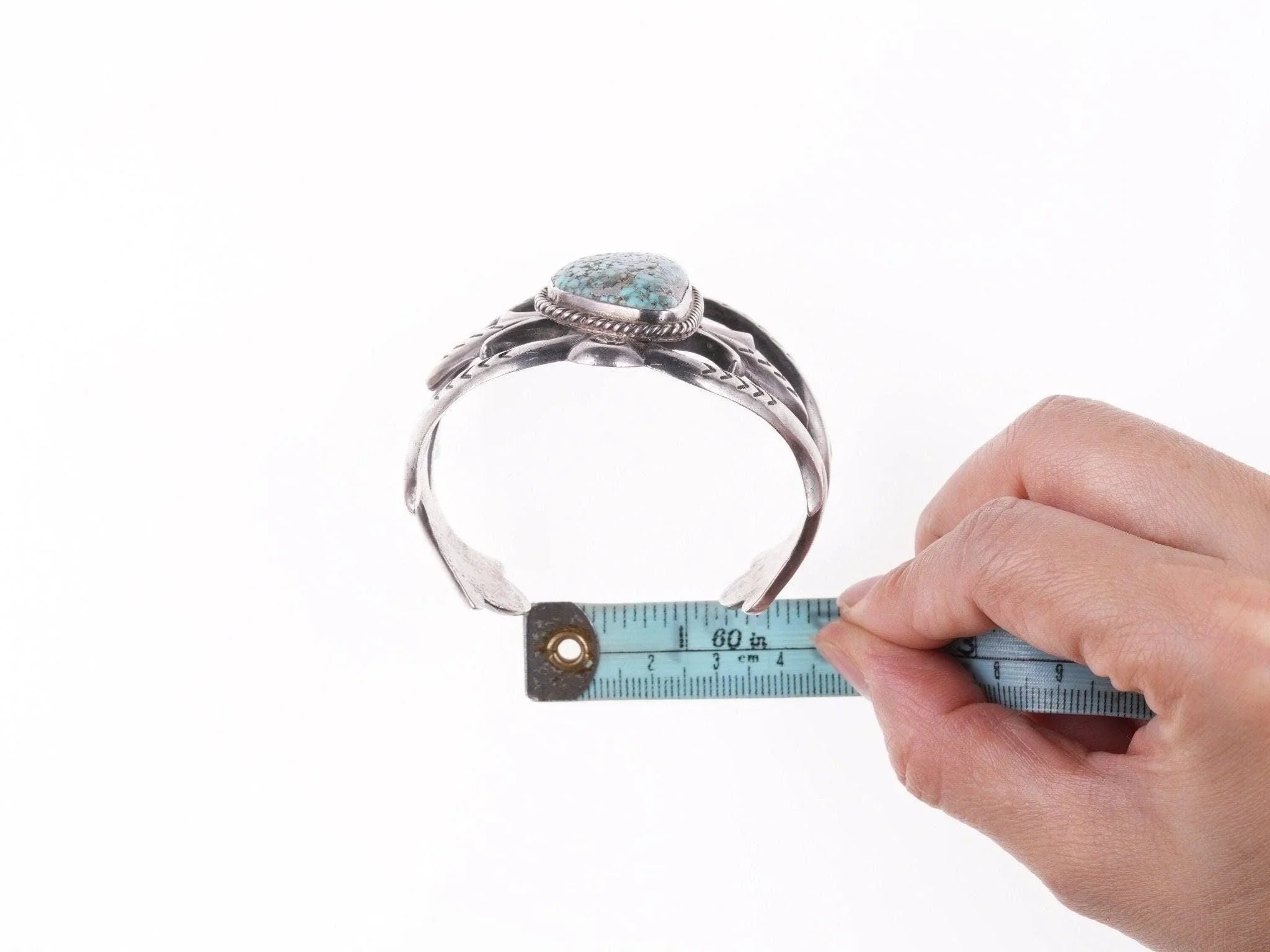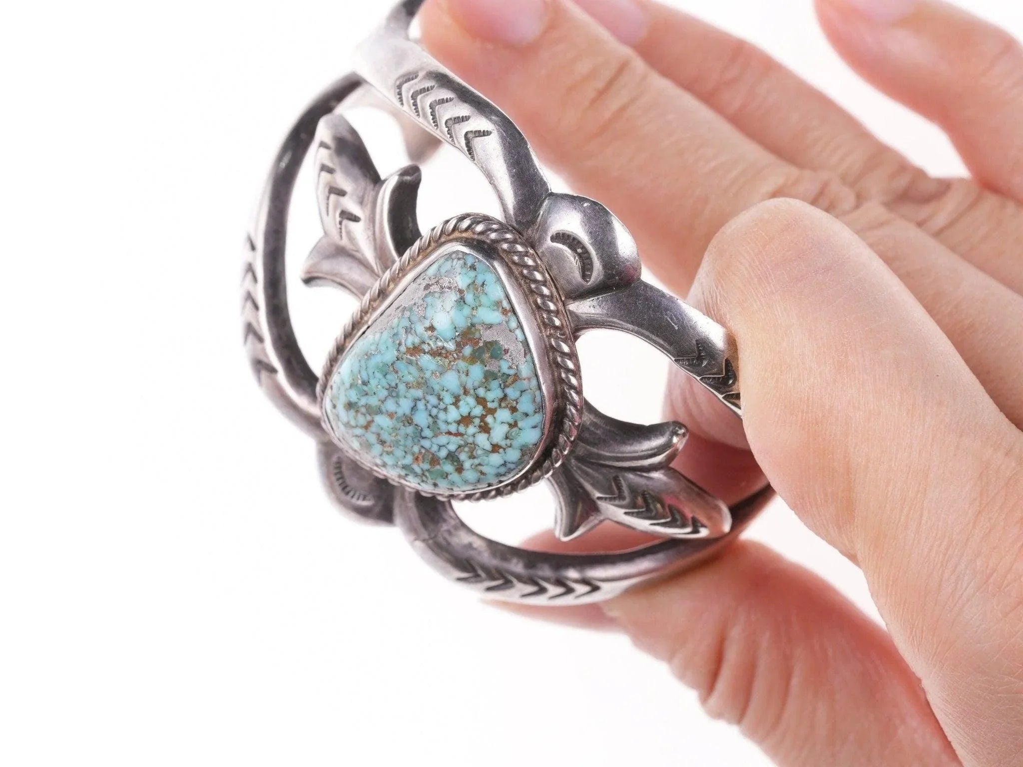 6.5" Vintage Navajo Tufa cast silver bracelet with turquoise. 3 spots of grey<br>paint on stone. I'm not sure if they are spilt paint or if it was intentional, I<br>didn't attempt to remove, stable fracture in center goes 1/3 down I believe it's<br>always been like that. This bracelet will not bend, it' doesn't go through.<br><br>All precious metals are tested and guaranteed, any Native American jewelry<br>referred to as Silver or Sterling is guaranteed to be a minimum of 90% (coin)<br>silver and possibly higher content. Anything marked is guaranteed to be what<br>it's marked, most bracelets are photographed on a 6" wrist (non hairy), rings<br>photographed on the appropriate sized finger when possible. With bracelets if<br>the measurement is not given in the description then inside circumference is<br>shown where the metal meets the number on the the cloth tape measure.