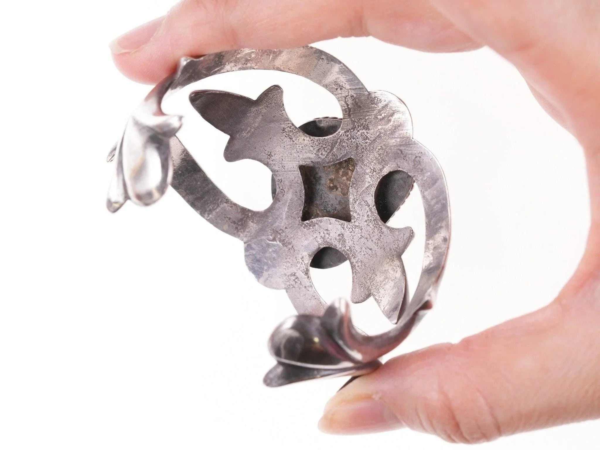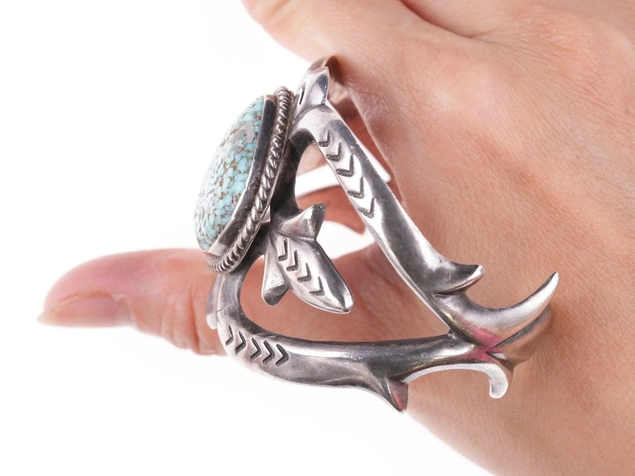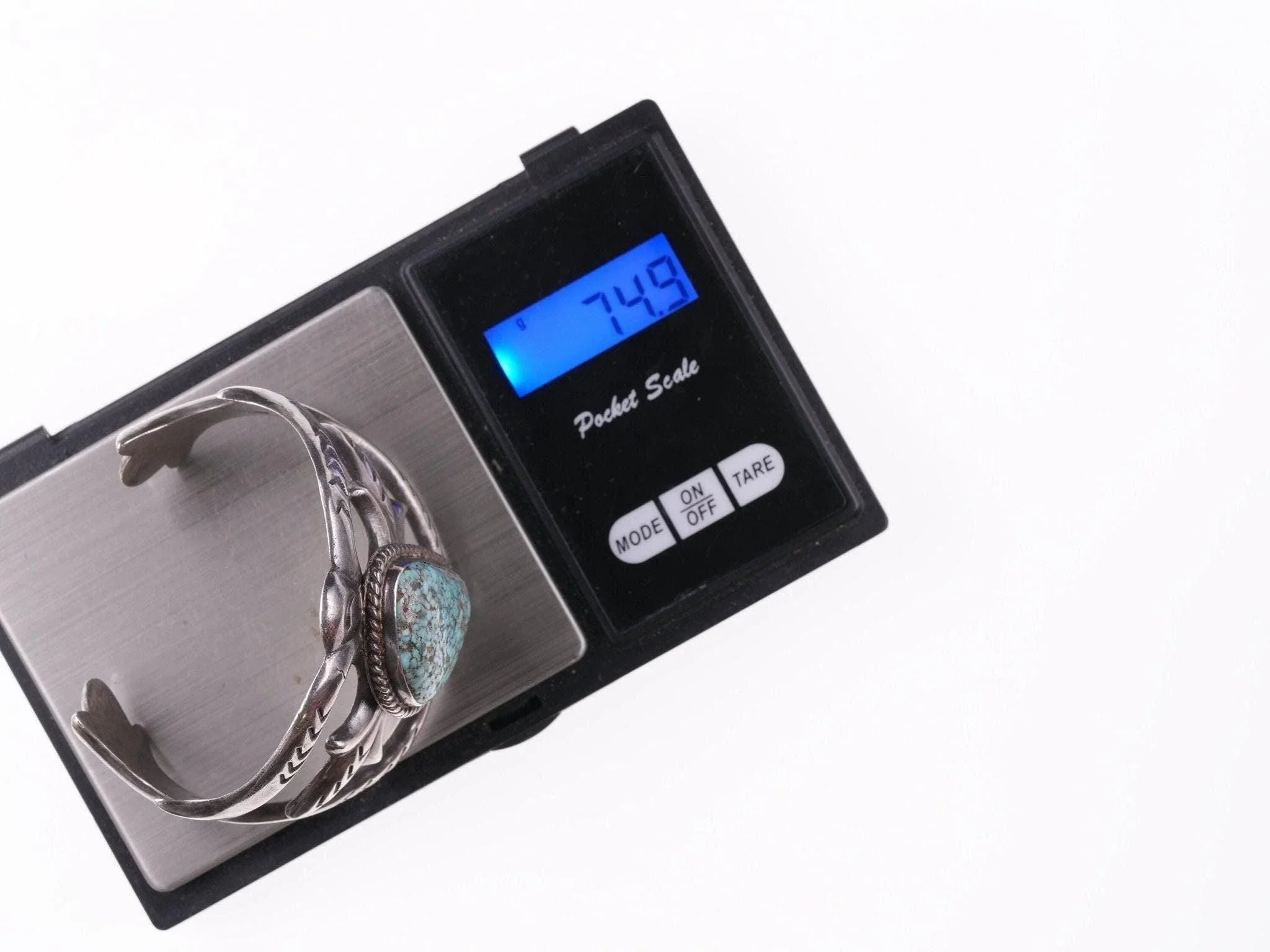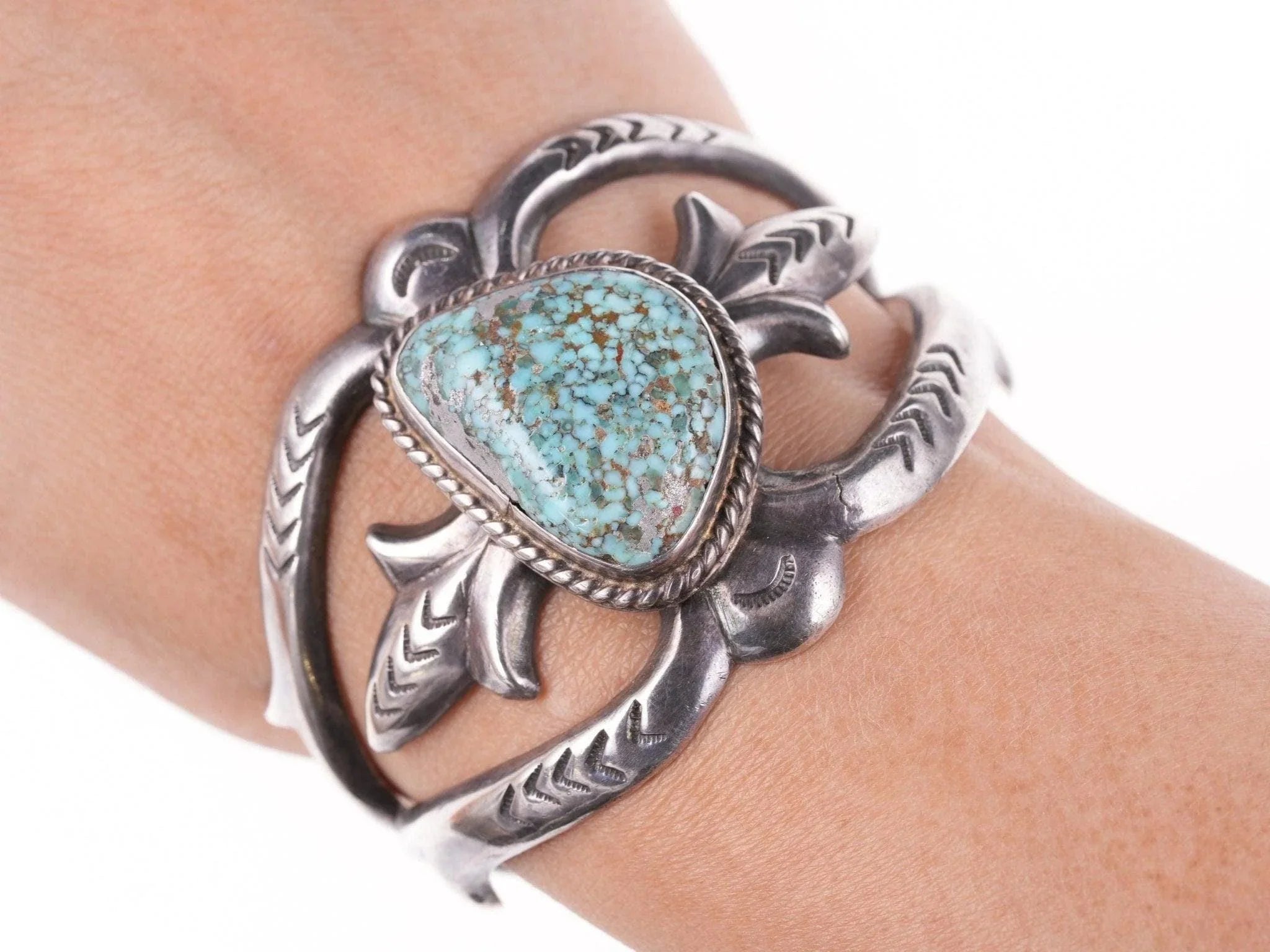 6.5" Vintage Navajo Tufa cast silver bracelet with turquoise. 3 spots of grey<br>paint on stone. I'm not sure if they are spilt paint or if it was intentional, I<br>didn't attempt to remove, stable fracture in center goes 1/3 down I believe it's<br>always been like that. This bracelet will not bend, it' doesn't go through.<br><br>All precious metals are tested and guaranteed, any Native American jewelry<br>referred to as Silver or Sterling is guaranteed to be a minimum of 90% (coin)<br>silver and possibly higher content. Anything marked is guaranteed to be what<br>it's marked, most bracelets are photographed on a 6" wrist (non hairy), rings<br>photographed on the appropriate sized finger when possible. With bracelets if<br>the measurement is not given in the description then inside circumference is<br>shown where the metal meets the number on the the cloth tape measure.
