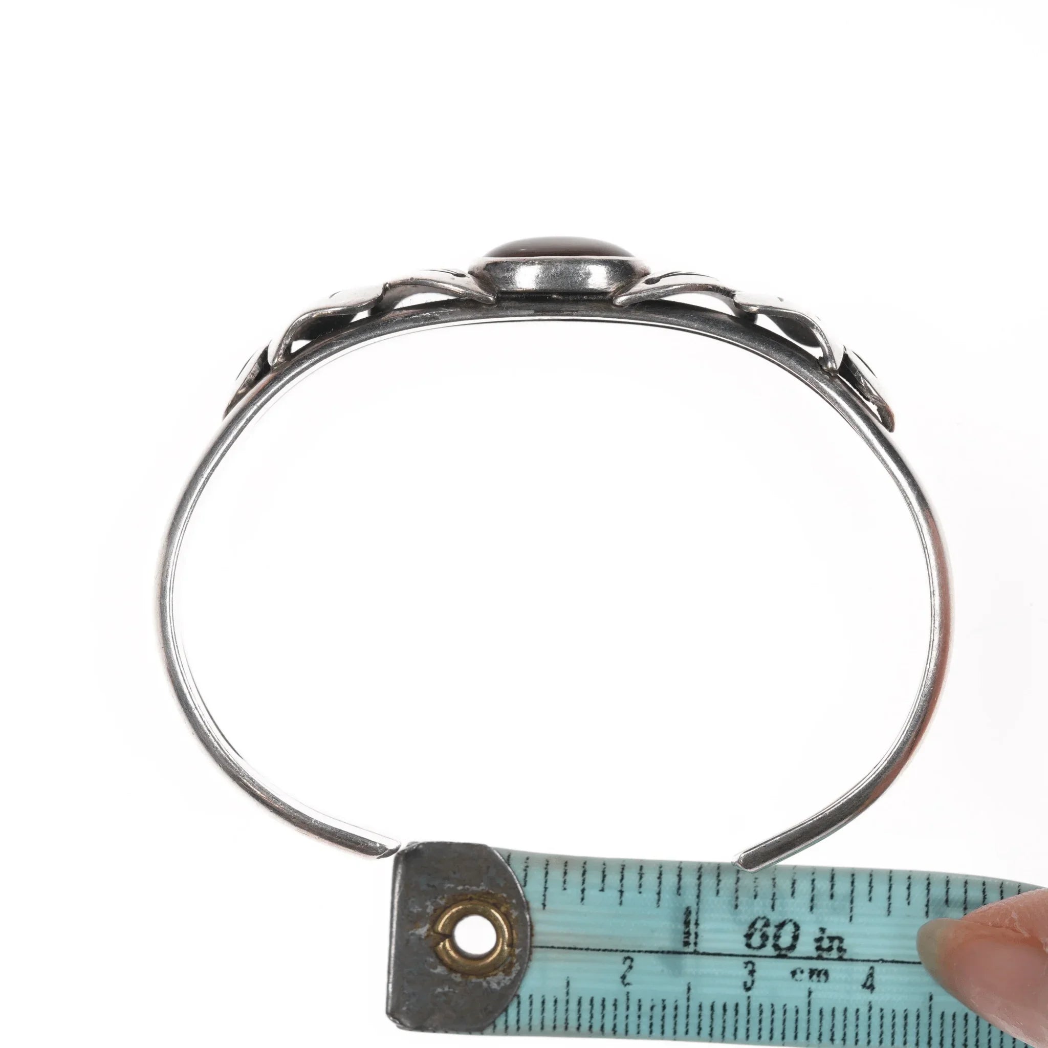 6.5" Vintage Southwestern modernist sterling and carnelian cuff bracelet. I'm not sure, it came from a collection of Native American jewelry but I don't recognize the hallmark. I believe it to be from the third quarter of the 20th century.