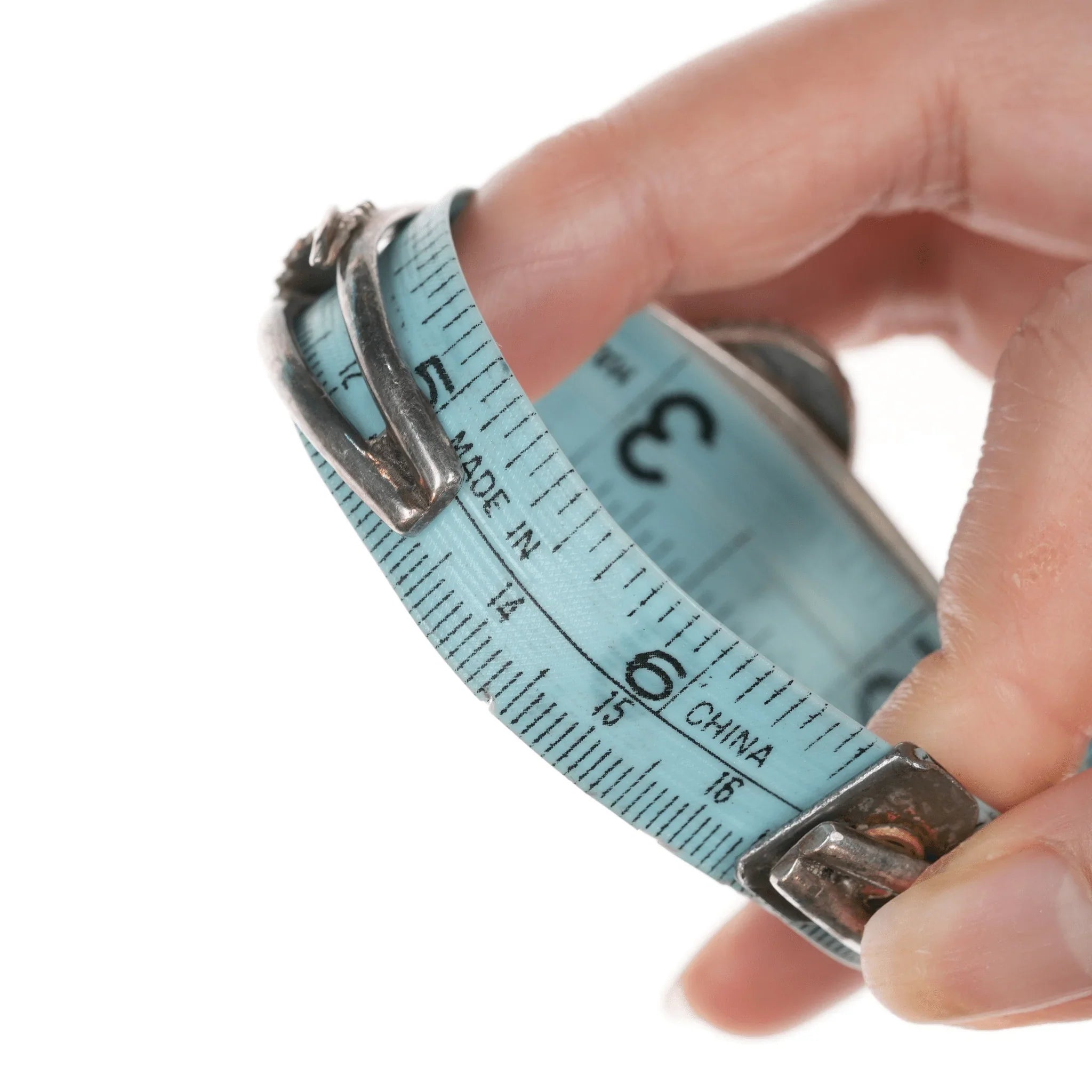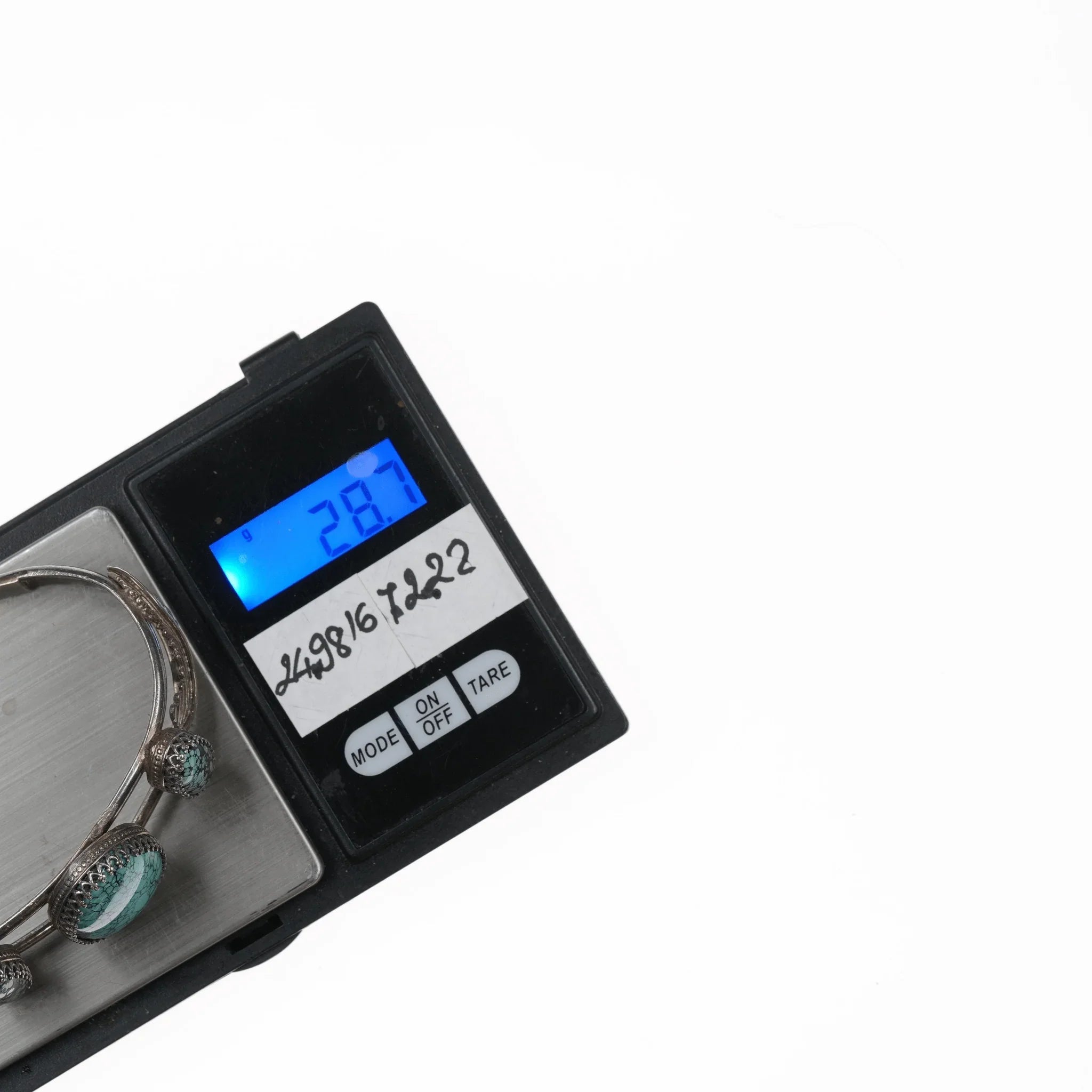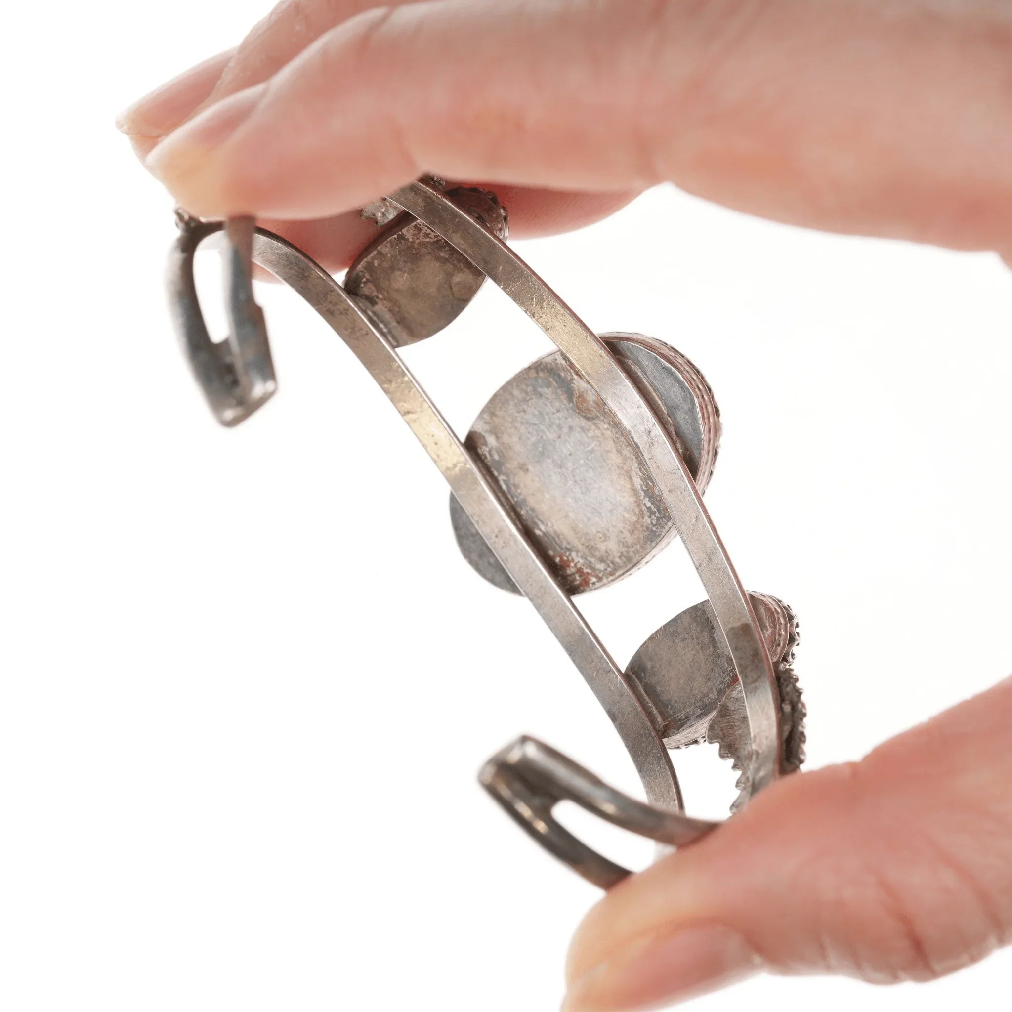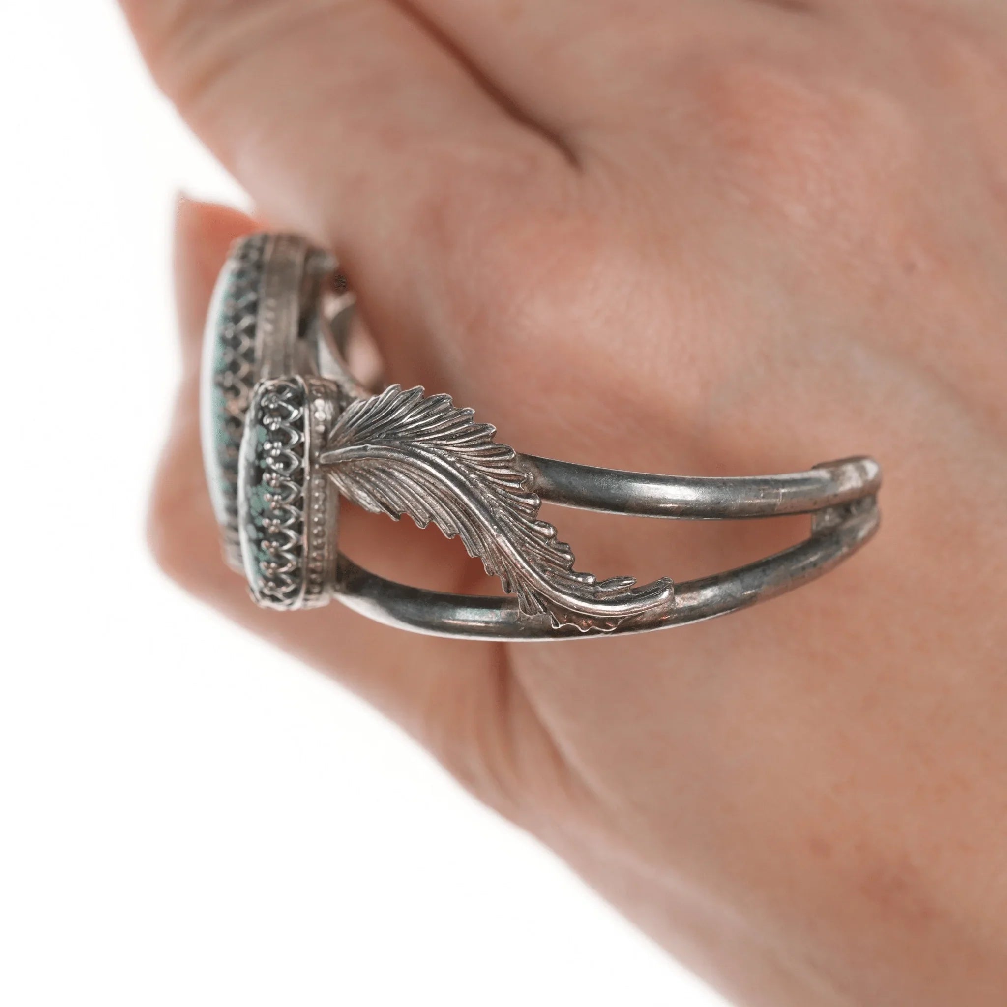 6.5" Vintage Southwestern sterling and turquoise cuff bracelet with fancy<br>bezels. Unmarked, I have seen Native American pieces with bezels like this.<br>Marked or unmarked as shown in pics, weight and other measurements in pics.<br>Sorry but my jewelry is stored in a secure location and cannot be accessed for<br>more pictures, videos, or measurements until sold. If you look at<br>pictures/description your question should be answered. Thank you so much for<br>your time and consideration!<br><br>All precious metals are tested and guaranteed, any Native American jewelry<br>referred to as Silver or Sterling is guaranteed to be a minimum of 90% (coin)<br>silver and possibly higher content. Anything marked is guaranteed to be what<br>it's marked, most bracelets are photographed on a 6" wrist (non hairy), rings<br>photographed on the appropriate sized finger when possible. With bracelets if<br>the measurement is not given in the description then inside circumference is<br>shown where the metal meets the number on the the cloth tape measure.