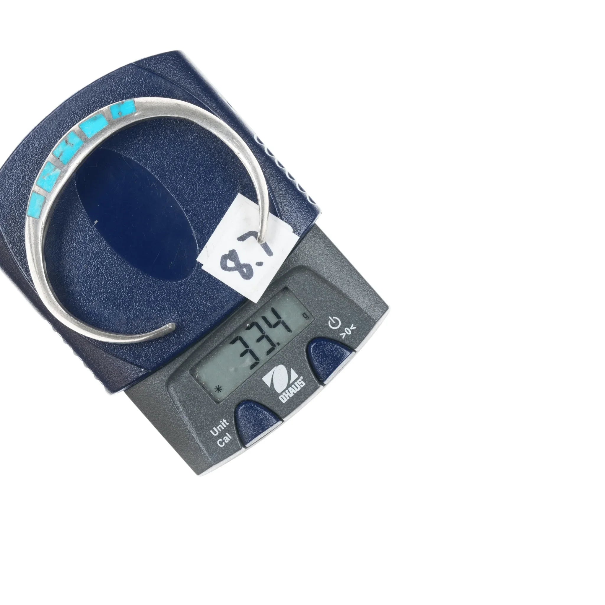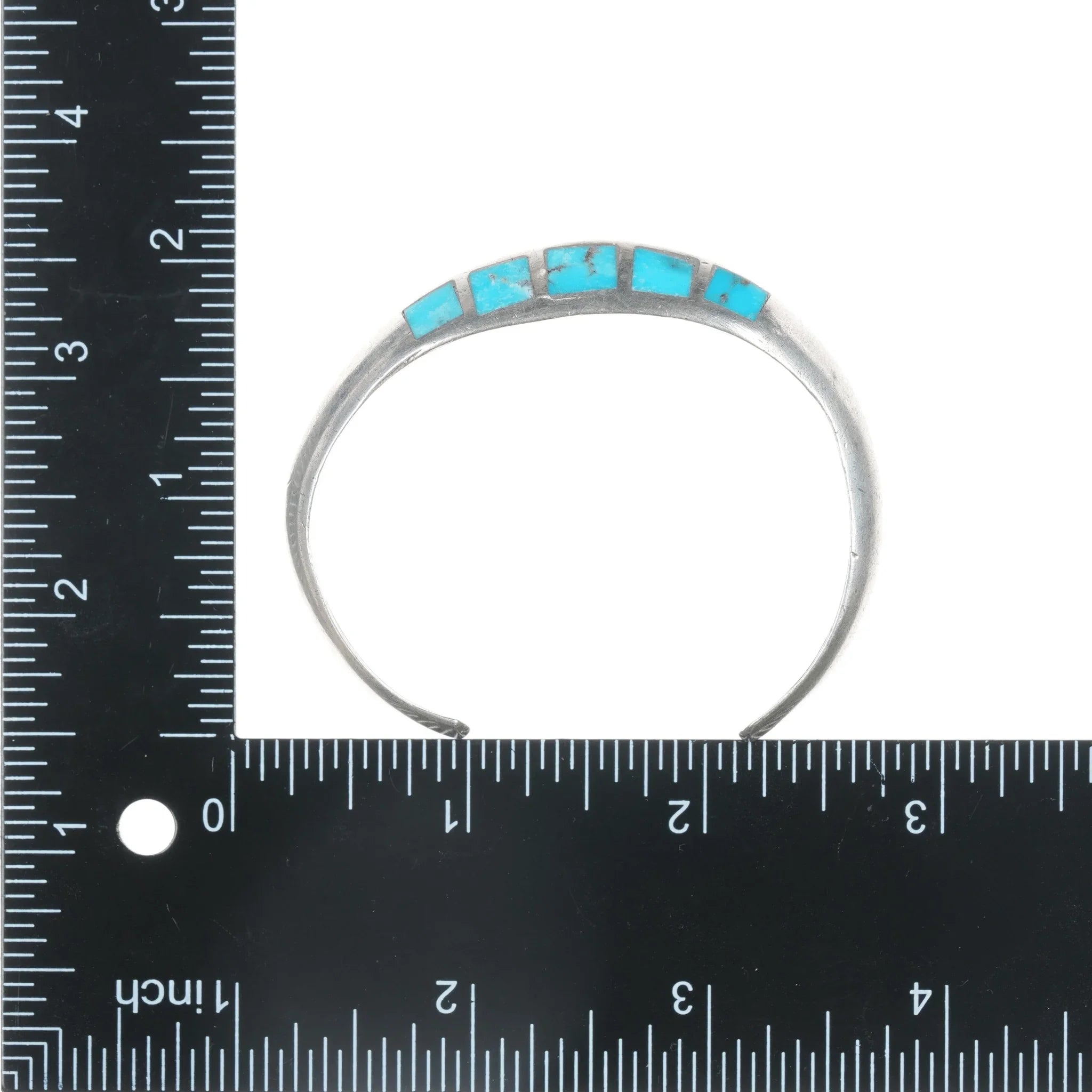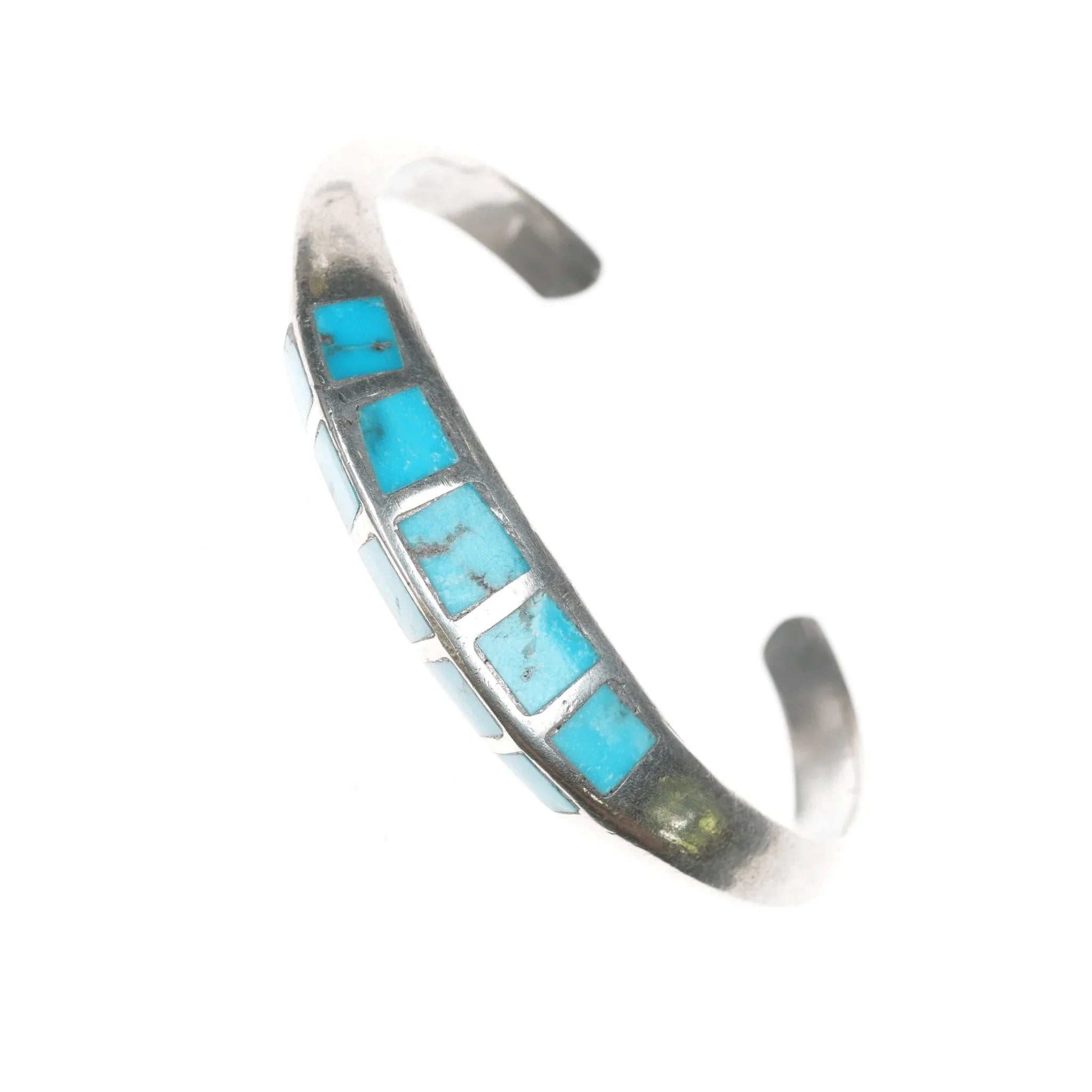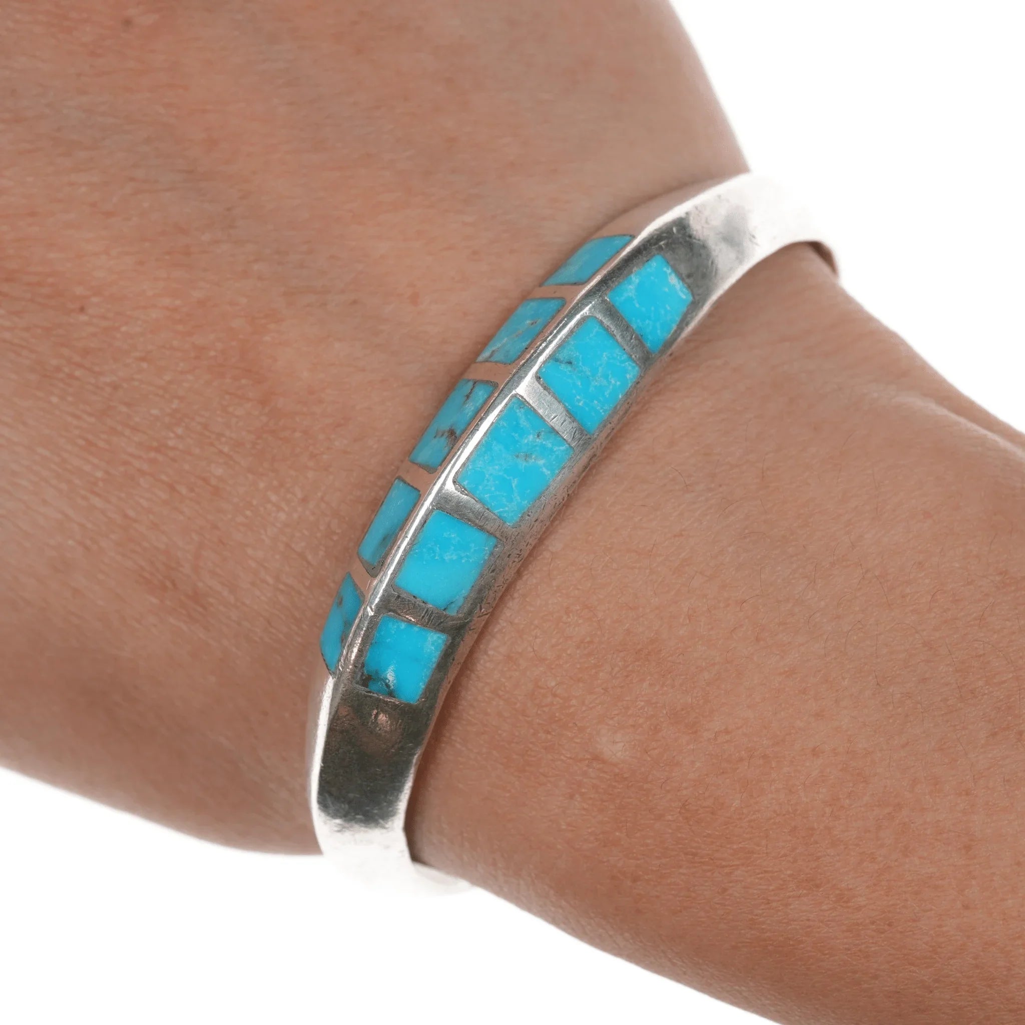 6.5" Vintage Zuni carinated silver flush inlay turquoise cuff bracelet