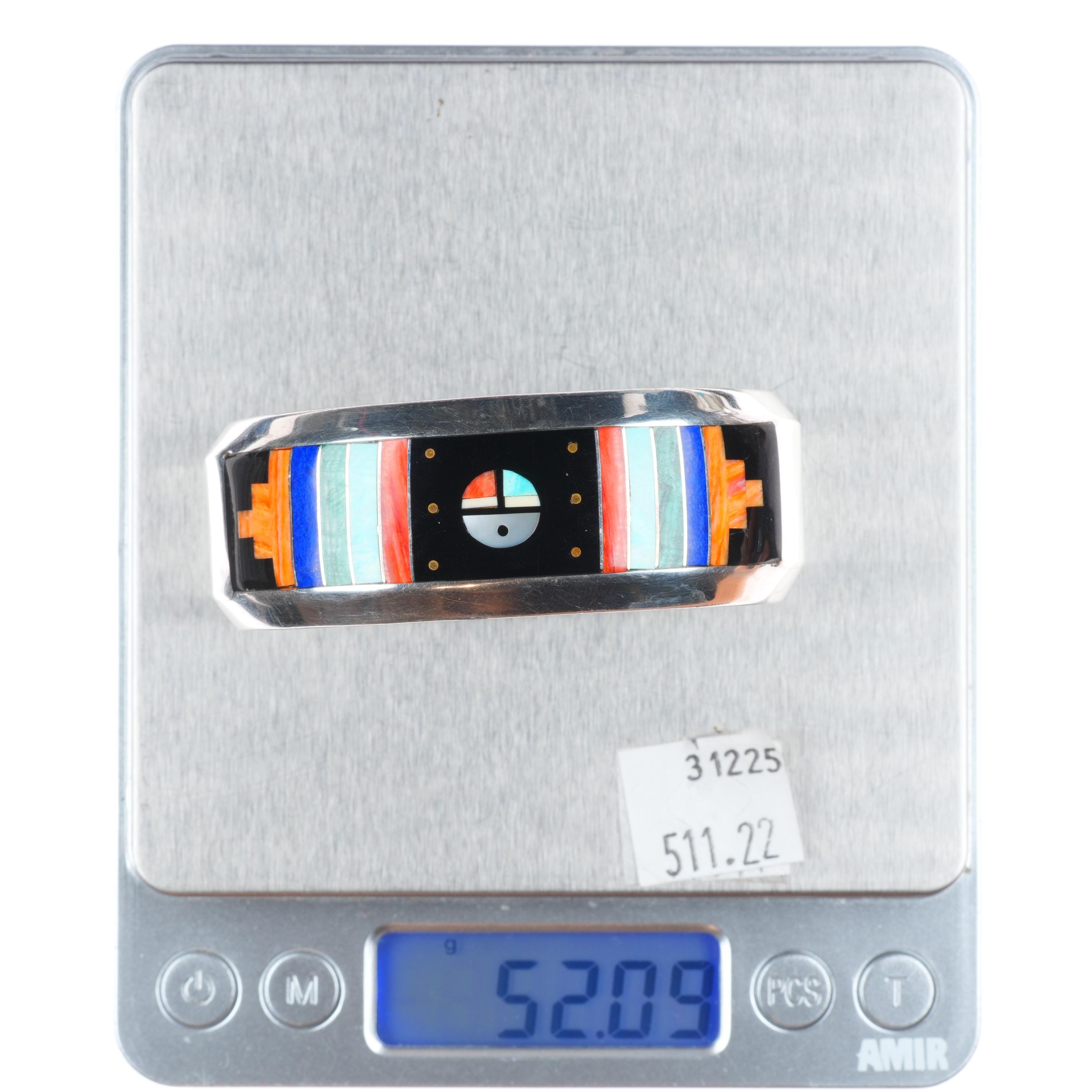 6.5" Willie Shaw Navajo sterling silver multi-stone inlay sunface cuff bracelet. Tested and guaranteed solid sterling silver with weight and measurements in pictures. Circa last quarter of the 20th century with some expected age appropriate wear.