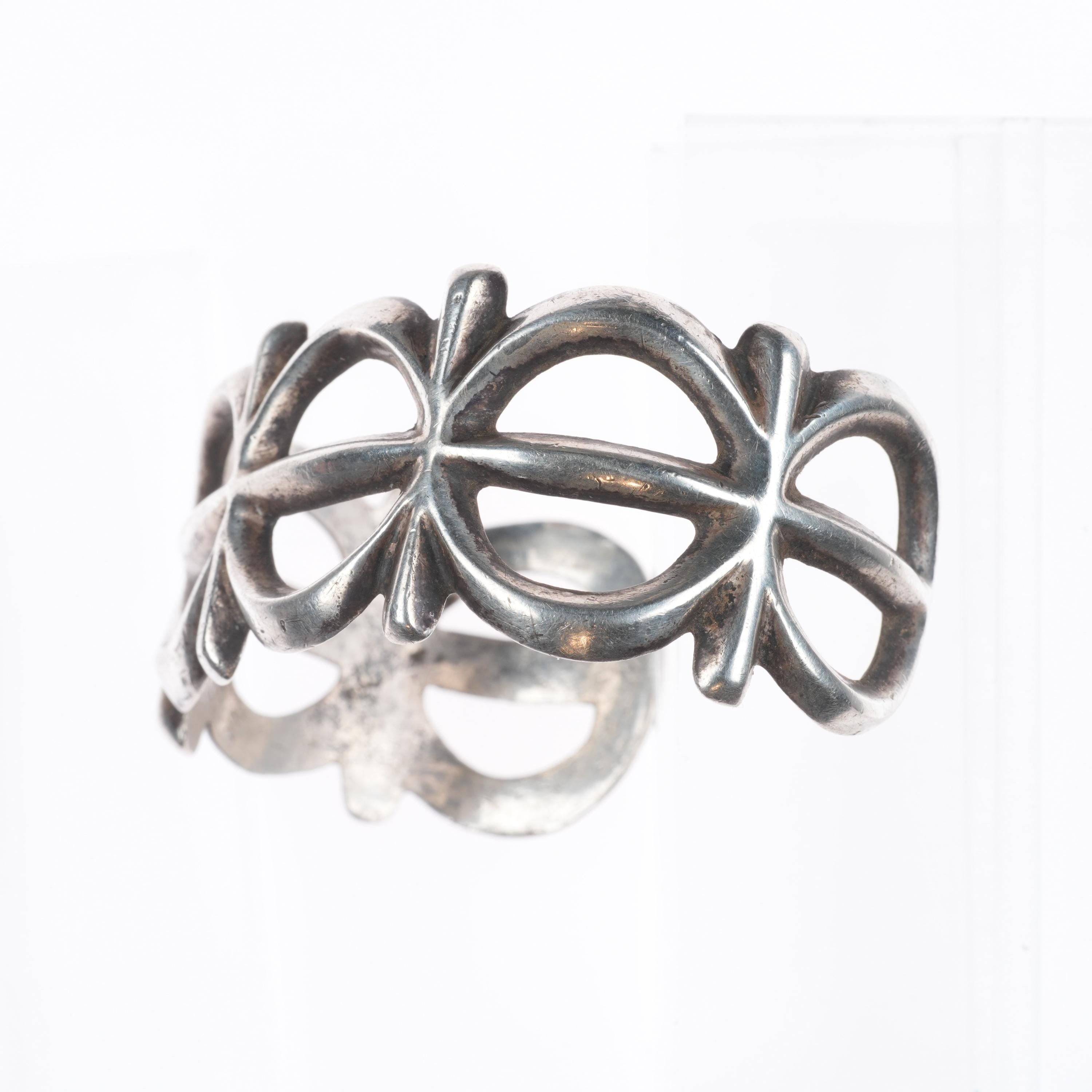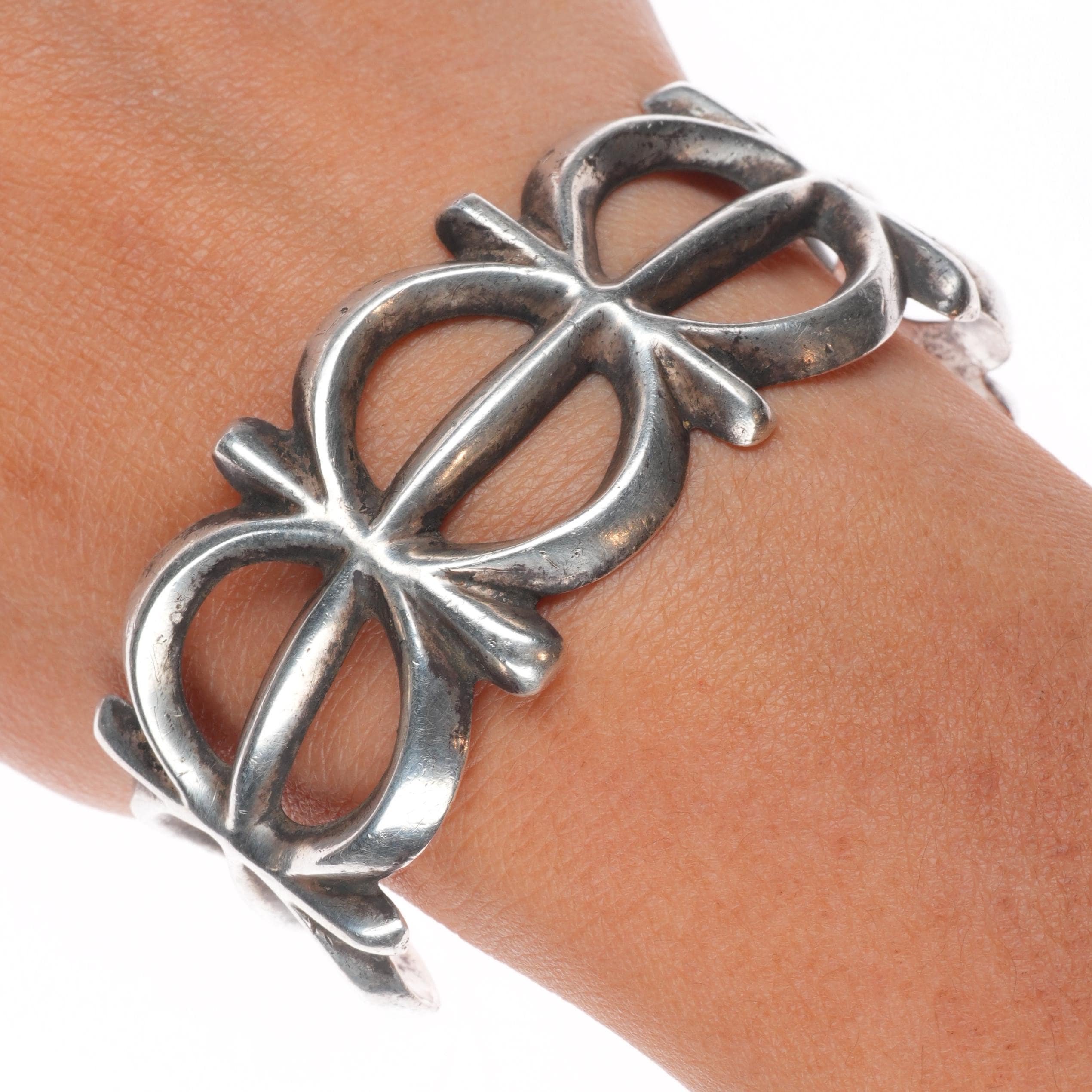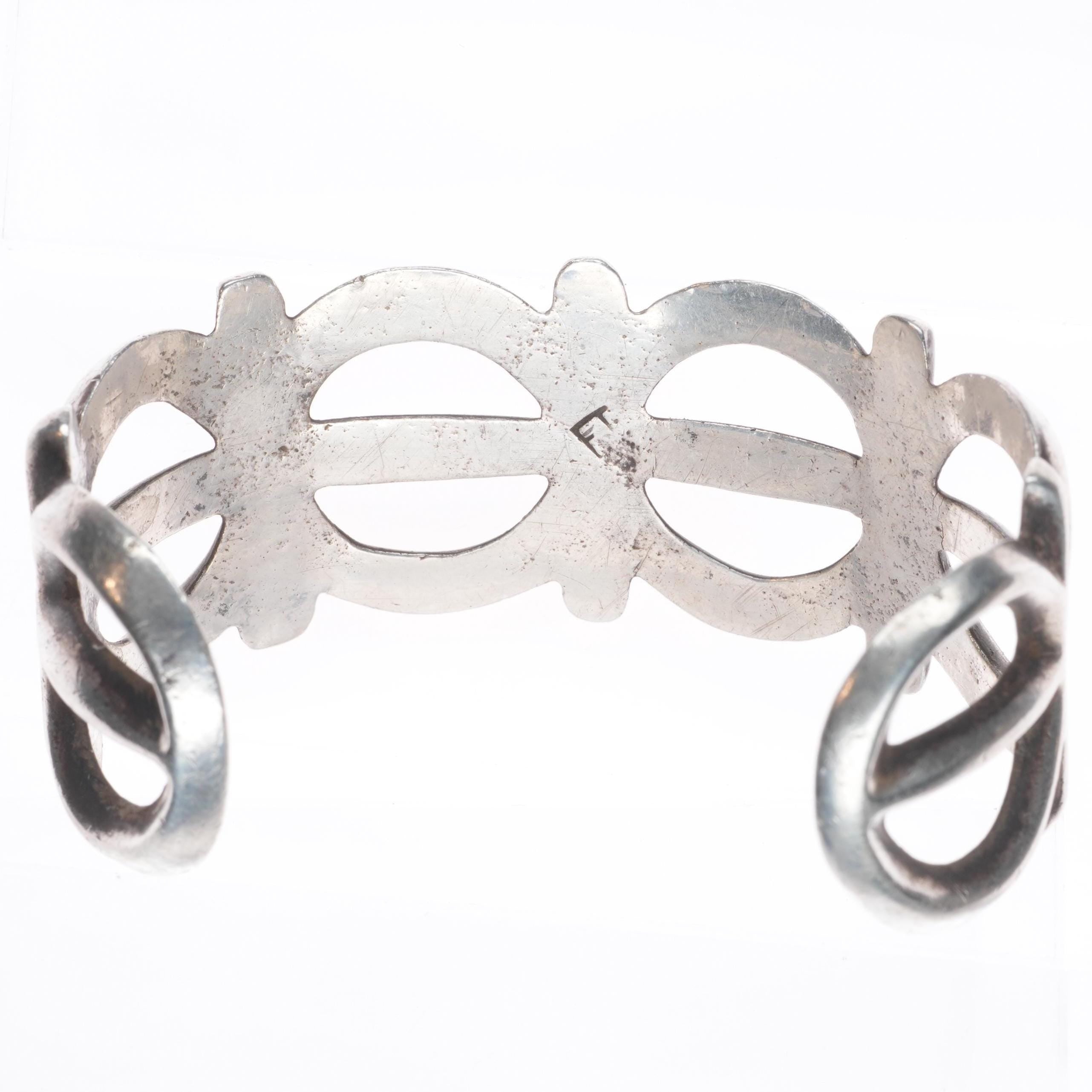 6.6" Vintage Navajo or Zuni cast ingot/sterling silver cuff bracelet. Tested and guaranteed solid sterling silver with weight and measurements in pictures. Circa second quarter of the 20th century with age appropriate wear.. Illegible partial hallmark, I don‘t feel like this is FJ for Felix Joe. I think this is an old bracelet.