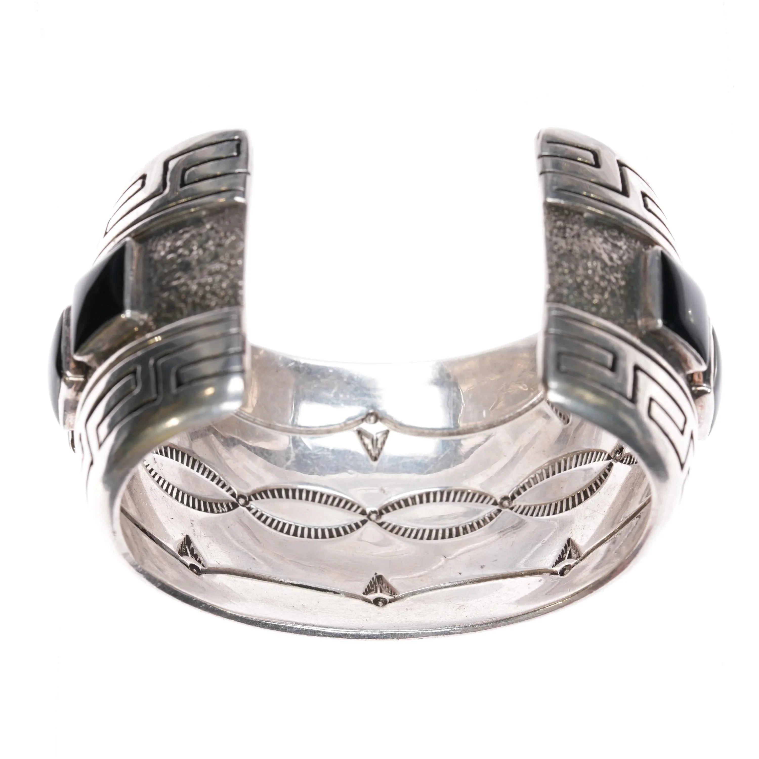 6.875 Andrew McCabe Navajo heavy silver onyx row cuff bracelet stamped interior