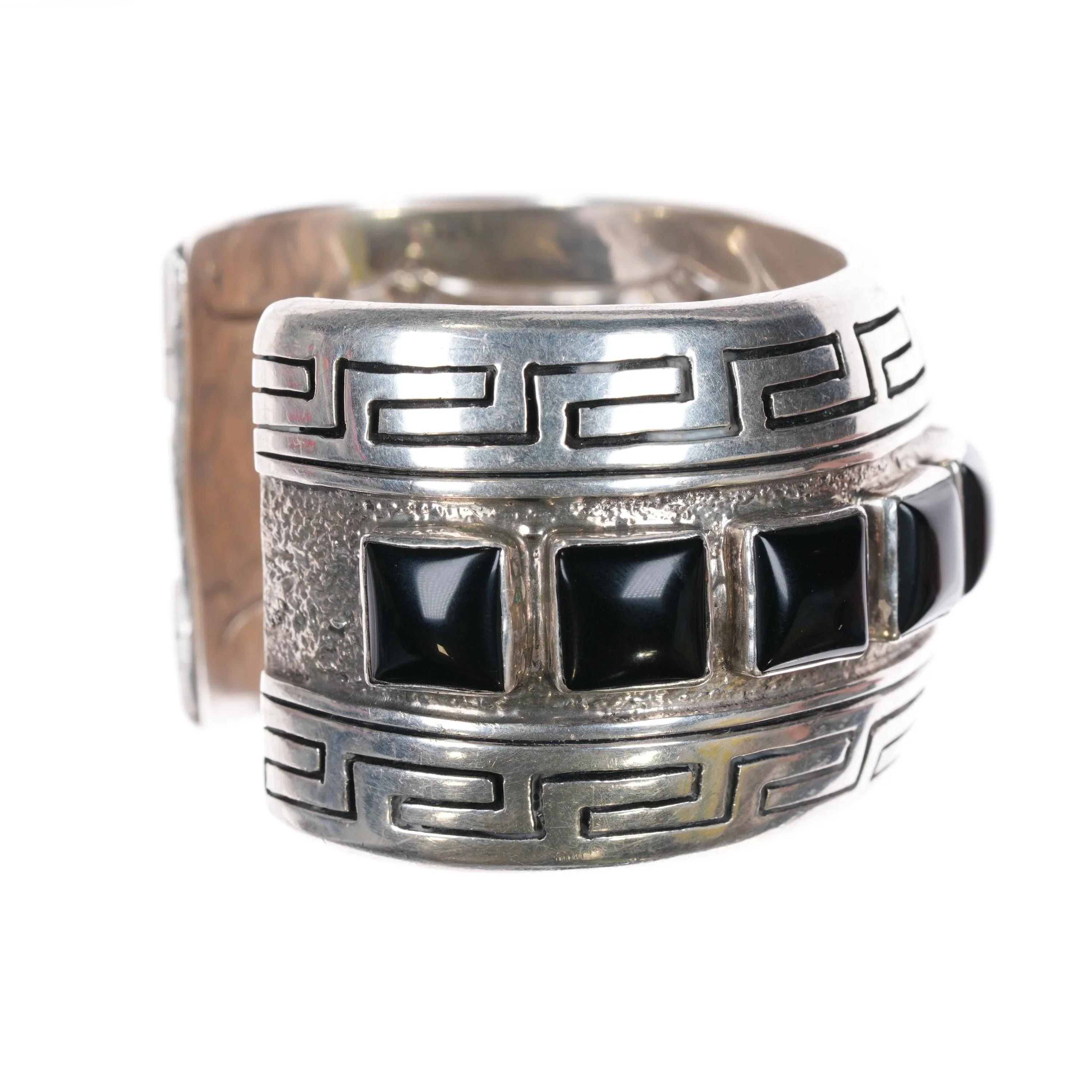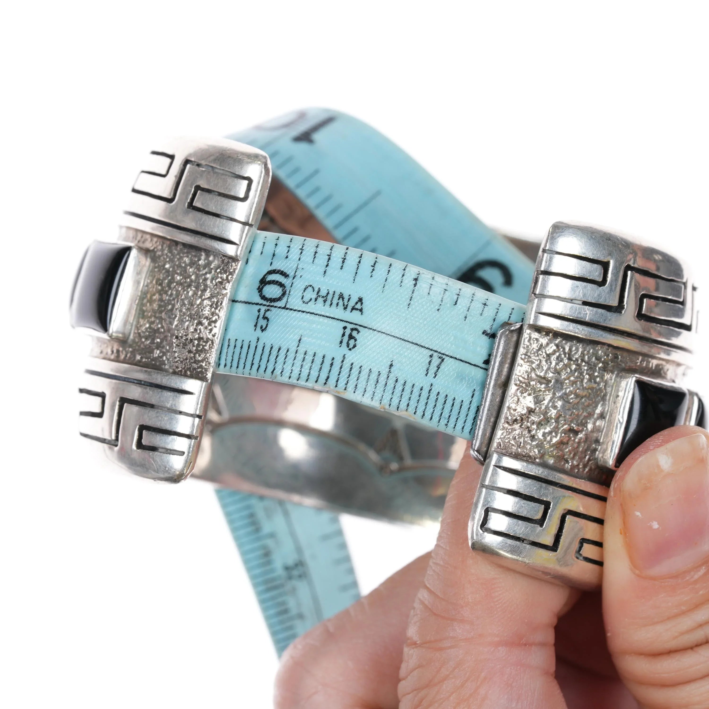 6 7/8" Andrew McCabe Navajo heavy silver onyx row cuff bracelet stamped interior. Solid sterling silver. Will fit up to a 6 7/8" wrist, gap size and other measurements in pictures. No damage.