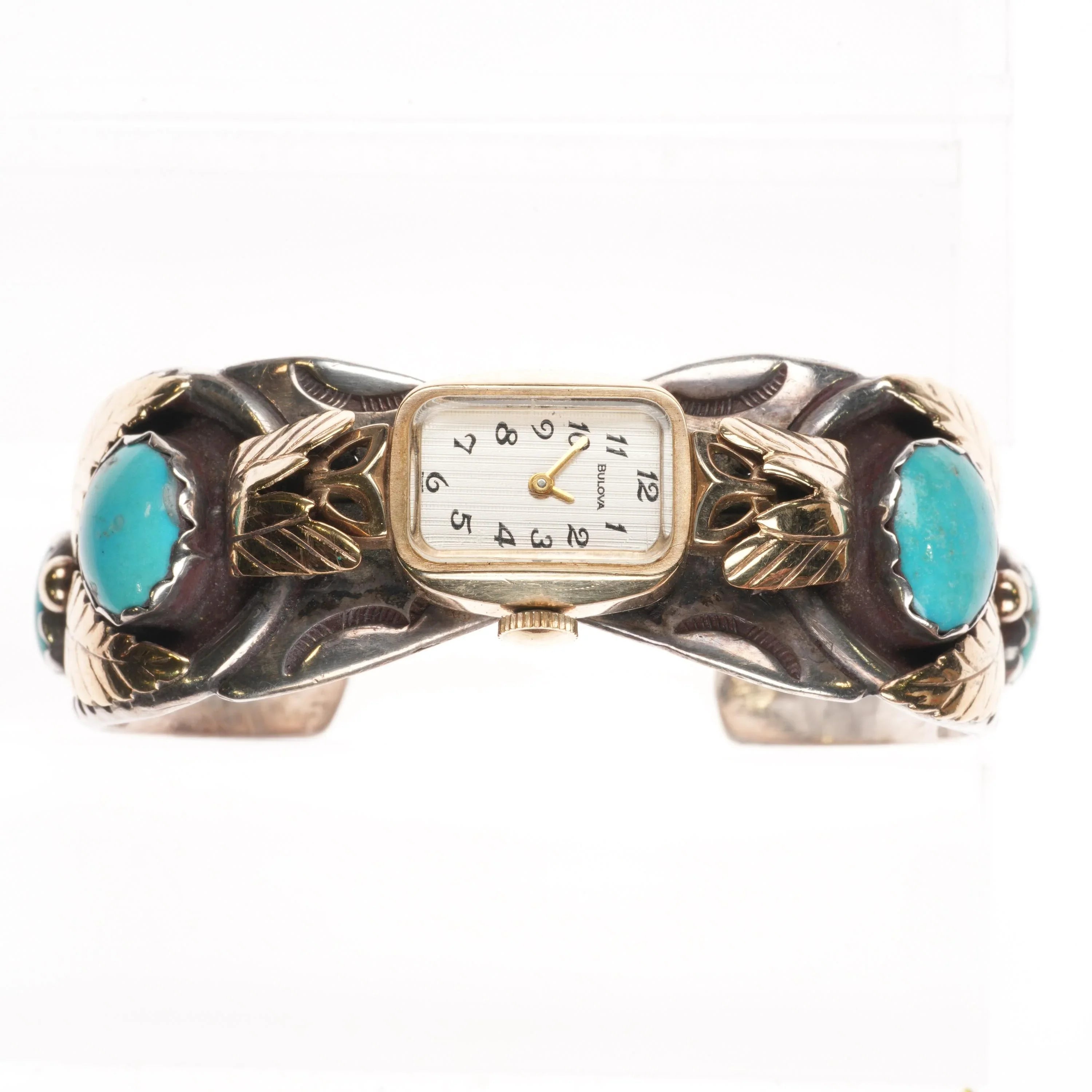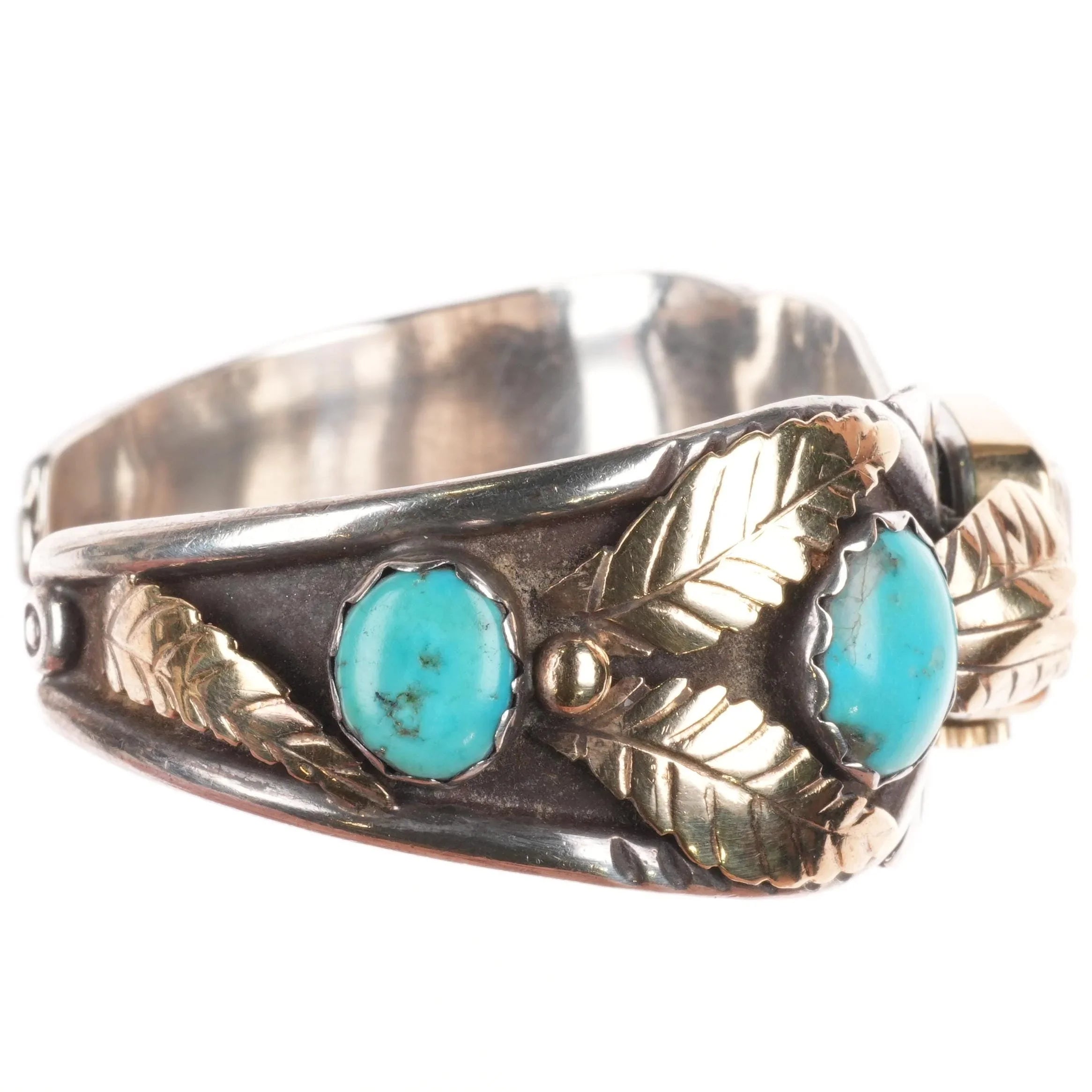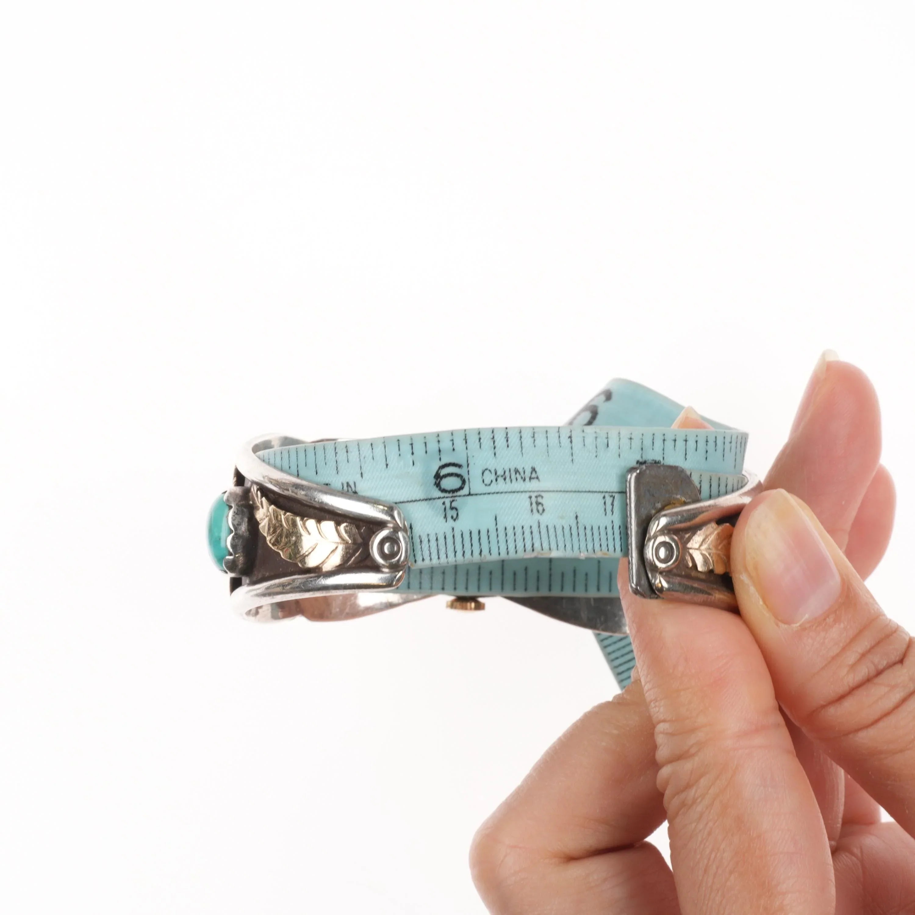 6.75" Juan Pedro Garcia Kewa sterling silver/gold turquoise watch cuff bracelet. Selling the watch bracelet shown, tested and guaranteed solid sterling silver with gold leaves. Weight and measurements in pictures. Currently with non-working watch, I believe it‘s overwound. Watches this size are common though, so shouldn‘t be difficult to find a substitute.