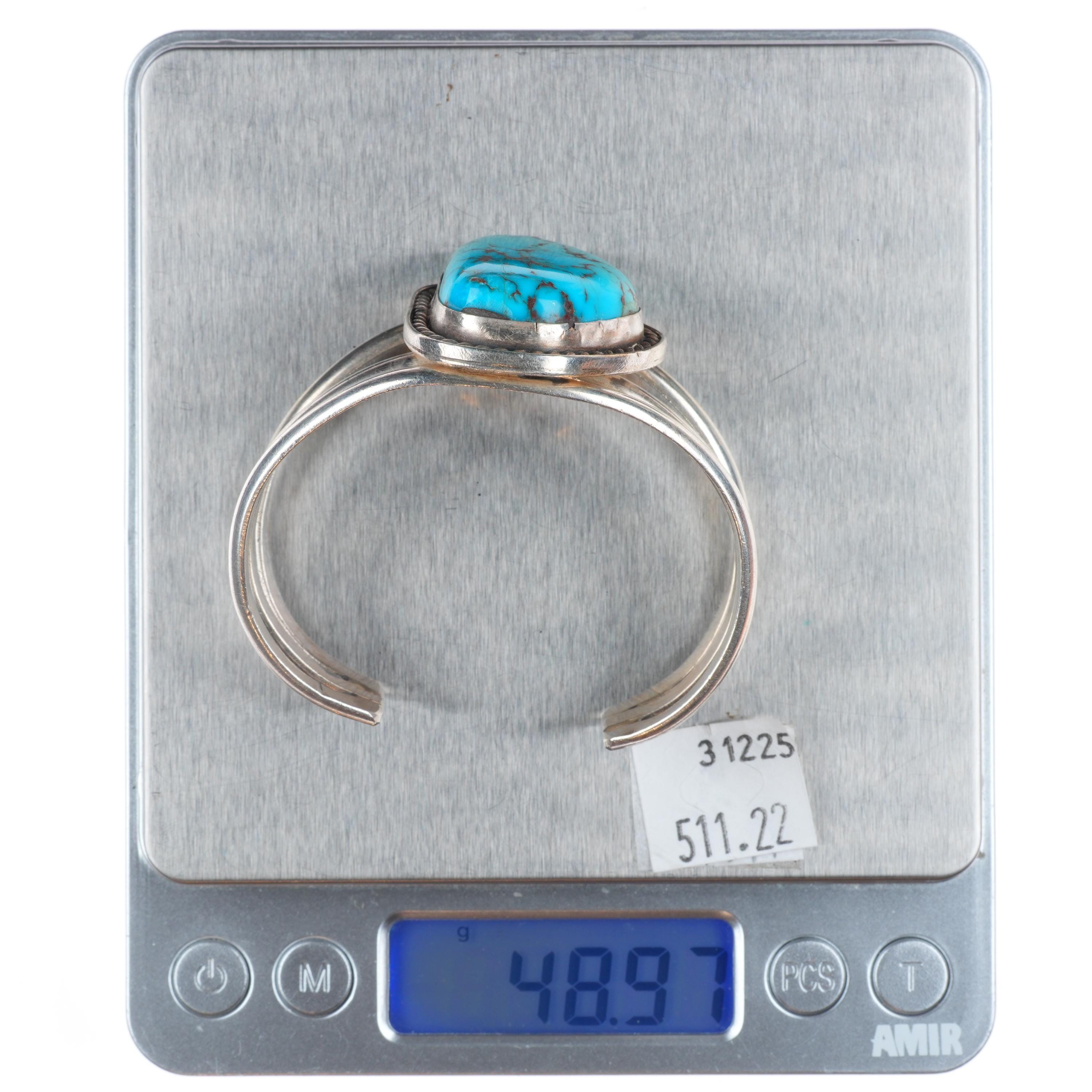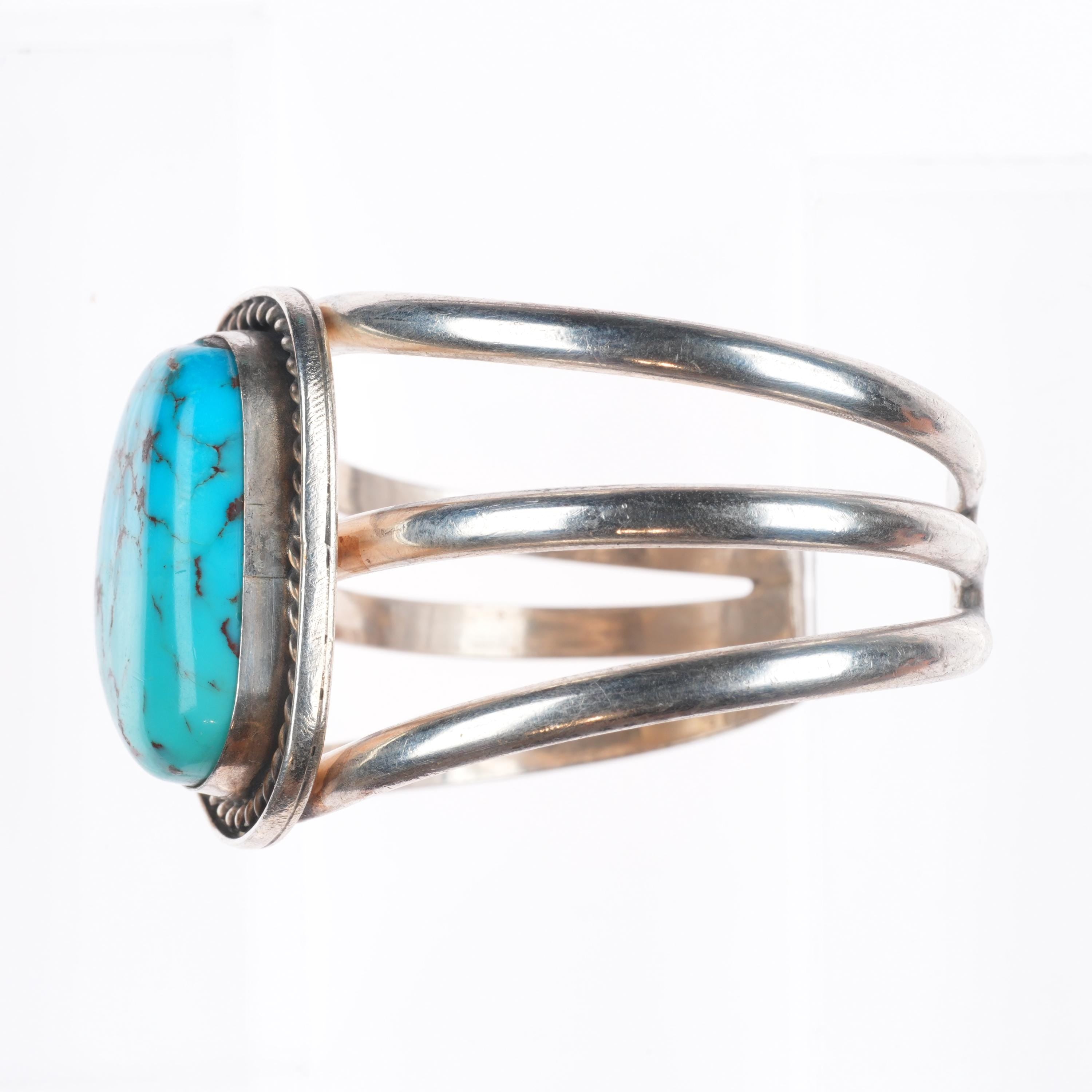 6" Vintage Navajo sterling silver Kingman turquoise 3 shank cuff bracelet. Tested and guaranteed solid sterling silver with weight and measurements in pictures. Circa fourth quarter of the 20th century with some expected age appropriate wear.