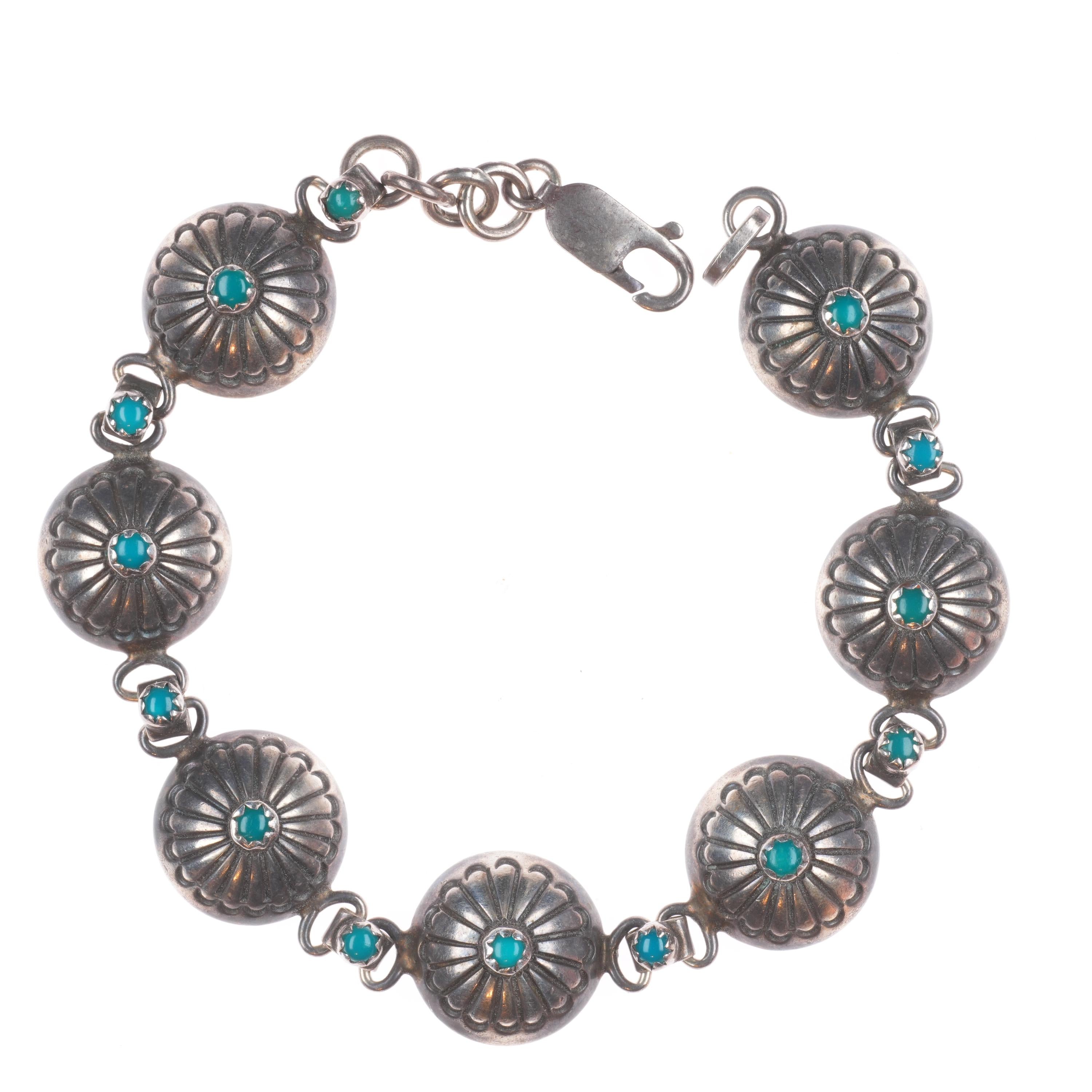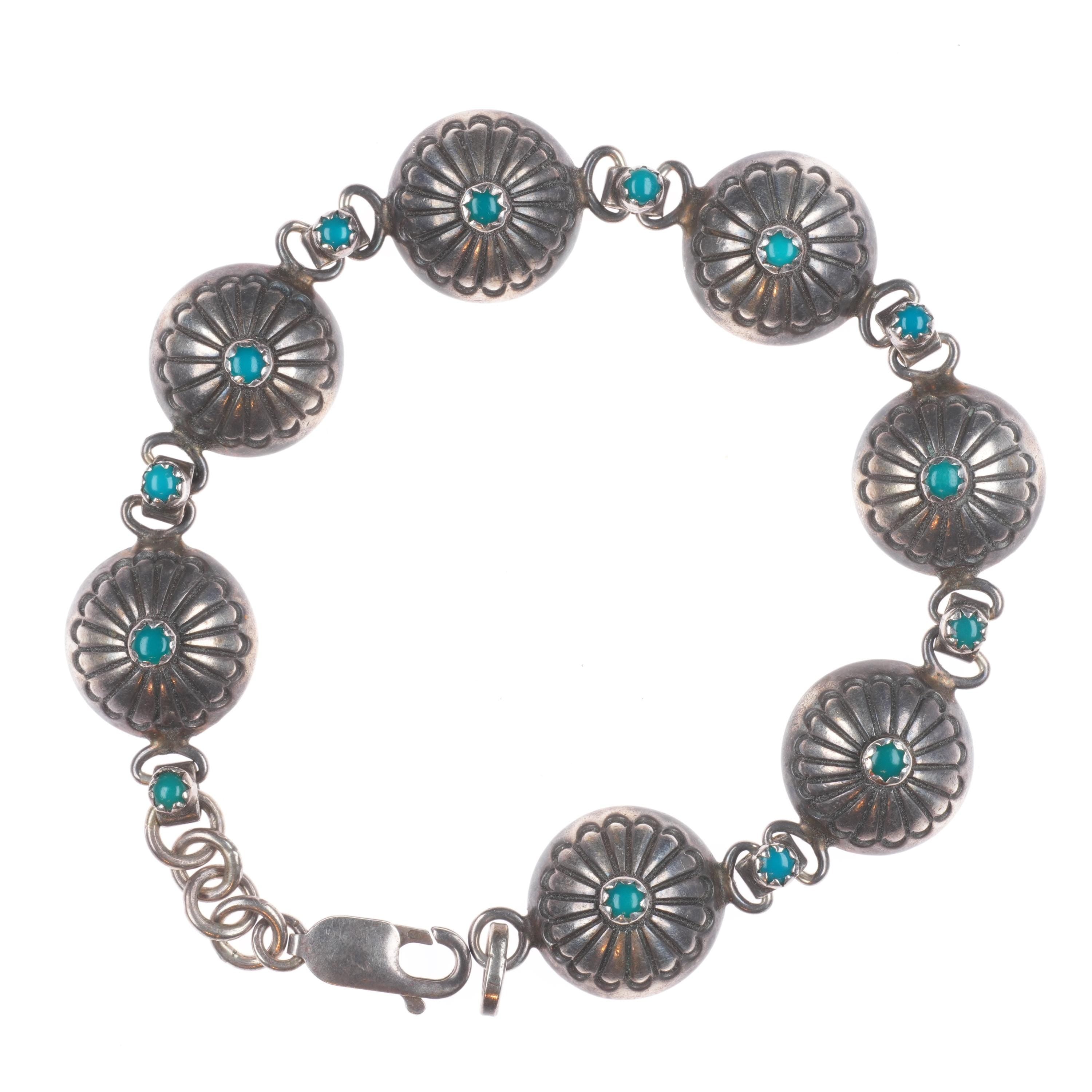 7.25" Vintage Navajo sterling silver snake eye turquoise link bracelet. Weight and measurements in pictures, solid sterling silver no issues.. Circa third quarter of the 20th century. No apparent markings. Very well made bracelet with later replacement clasp.