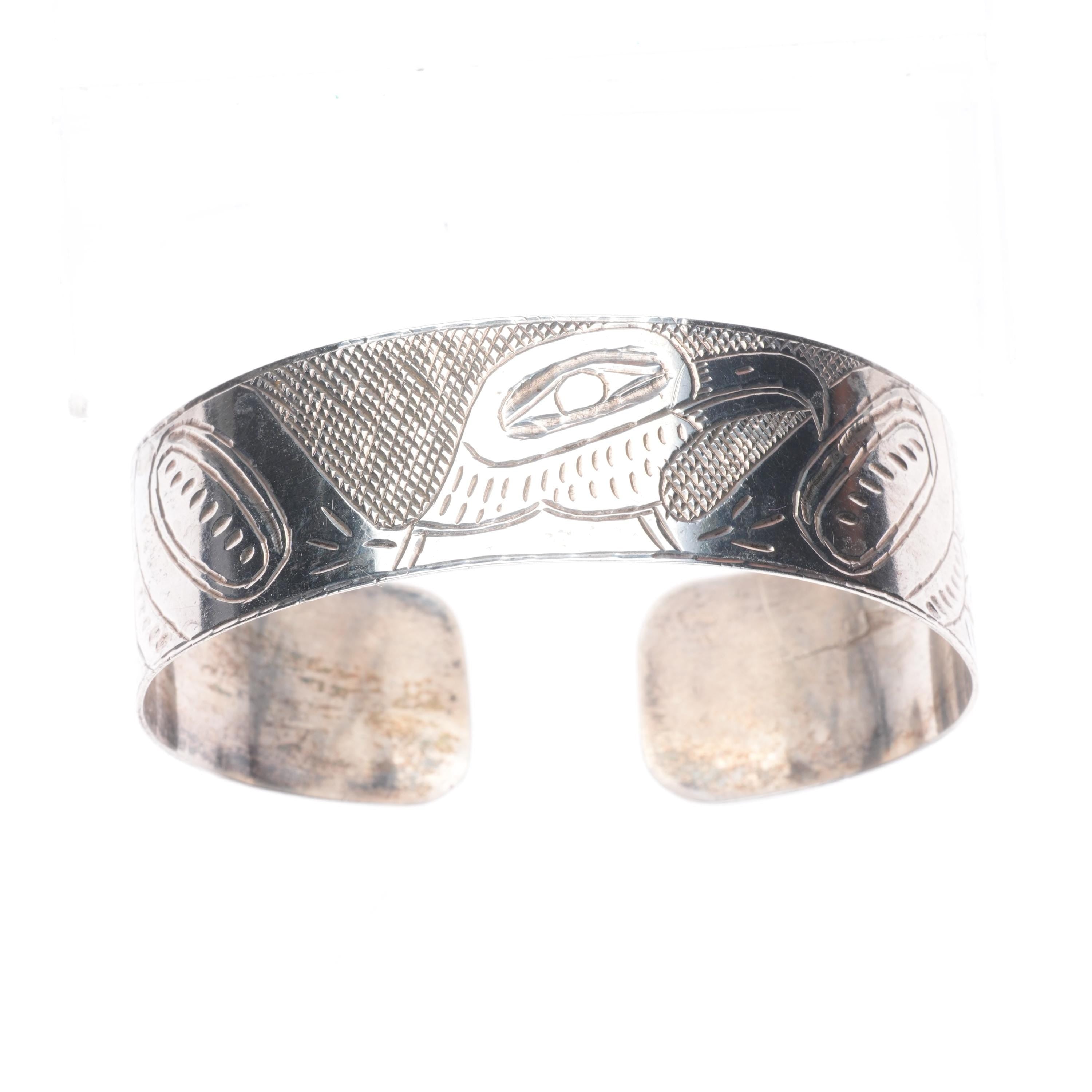 7.5" Antique Haida Ingot silver eagle hand carved cuff bracelet. Tested and guaranteed solid sterling silver with weight and measurements in pictures. Overall expected wear circa first quarter of the 20th century. From a high end collection of historic mostly Navajo and Zuni jewelry.