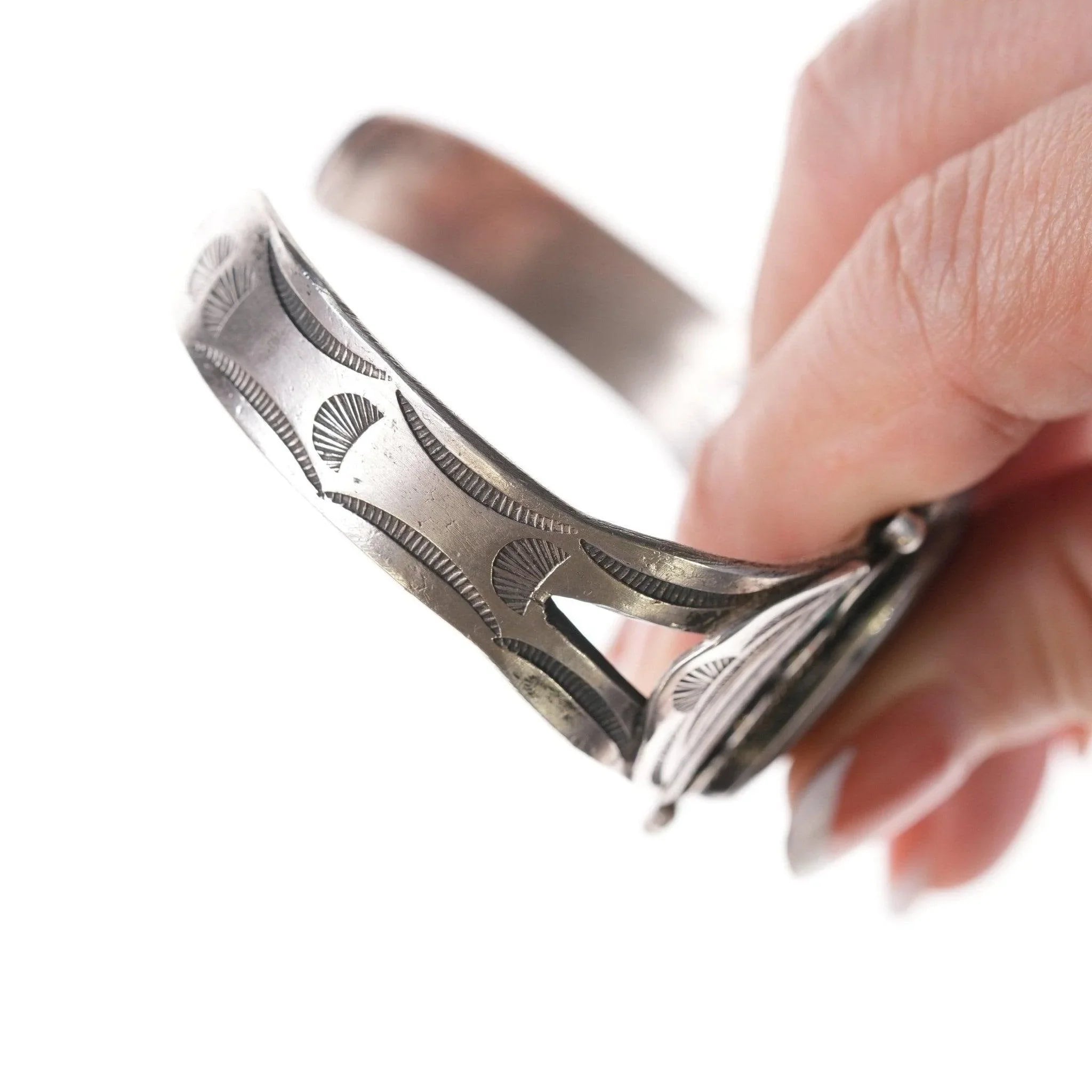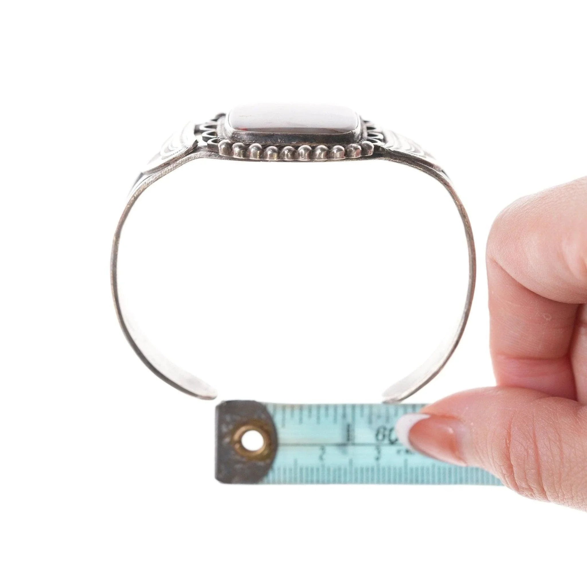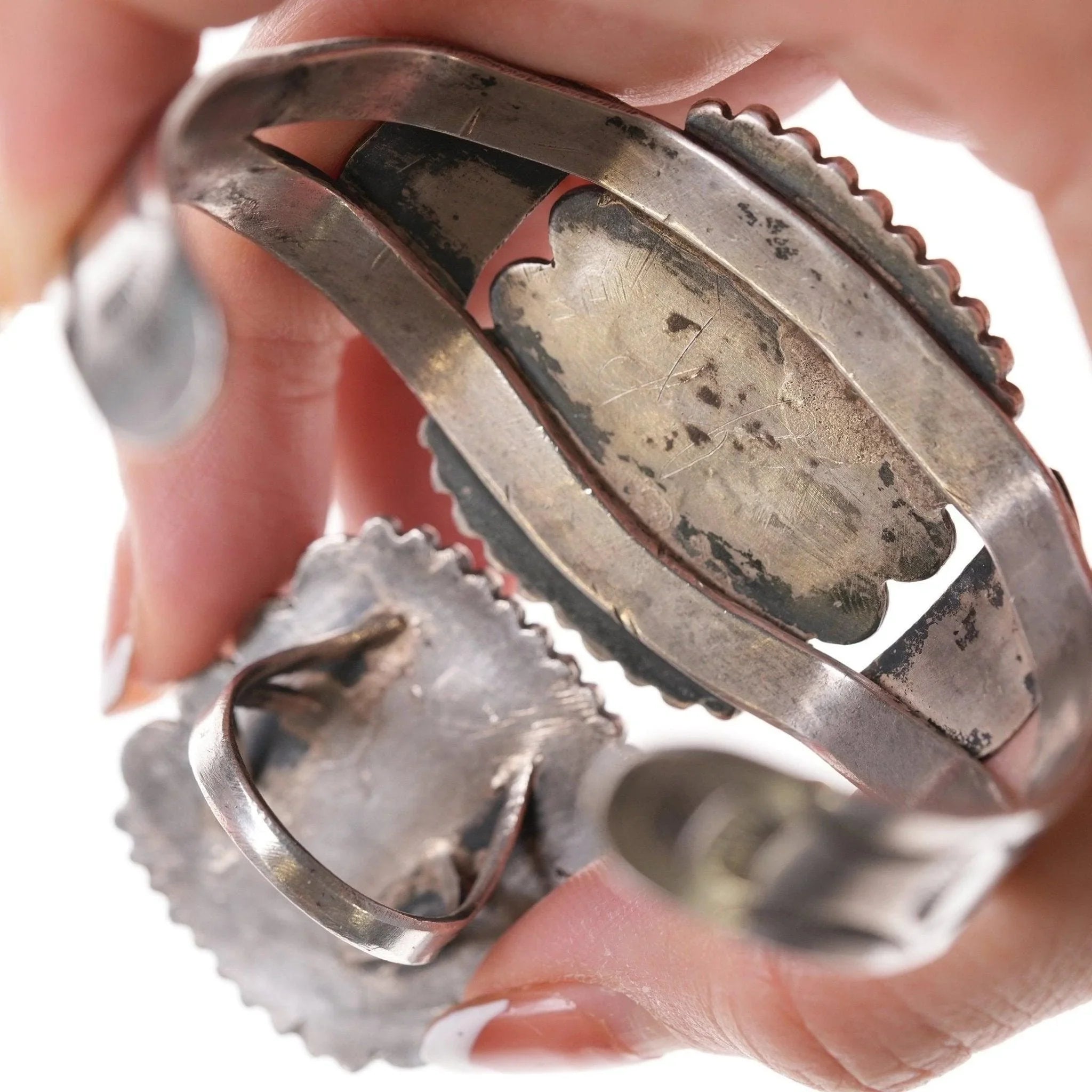 Bracciale in argento e agata Navajo da 7" degli anni '40 con anello corrispondente di misura 6,75, bracciale largo 37 mm, anello 33 mm sul lato più lungo.