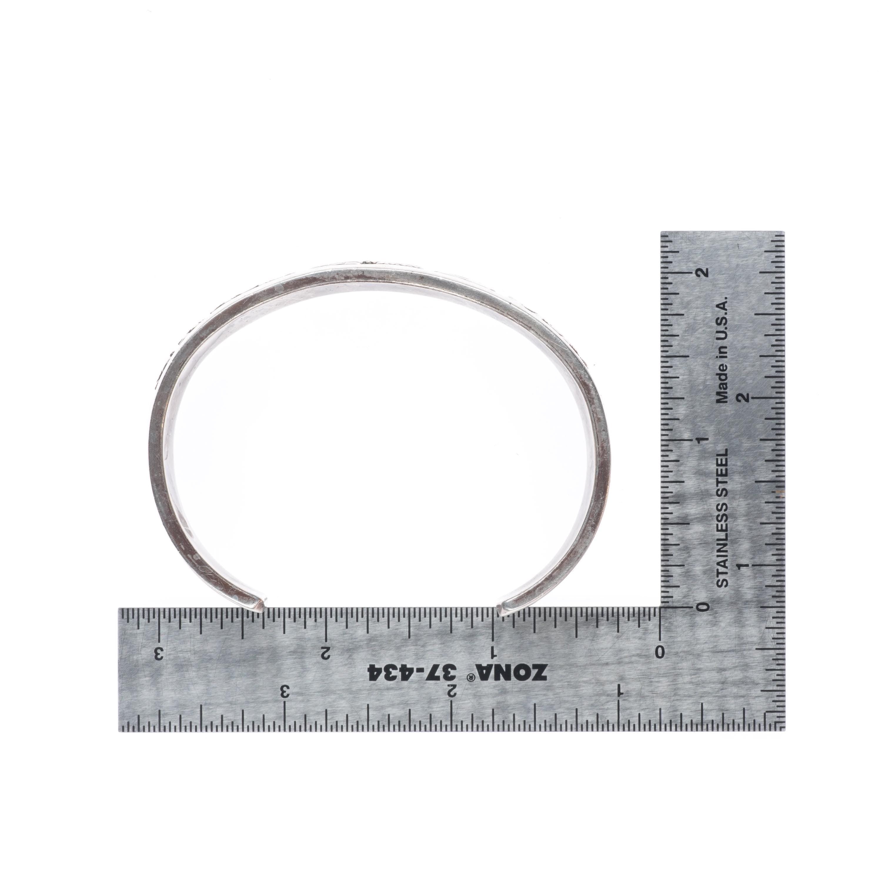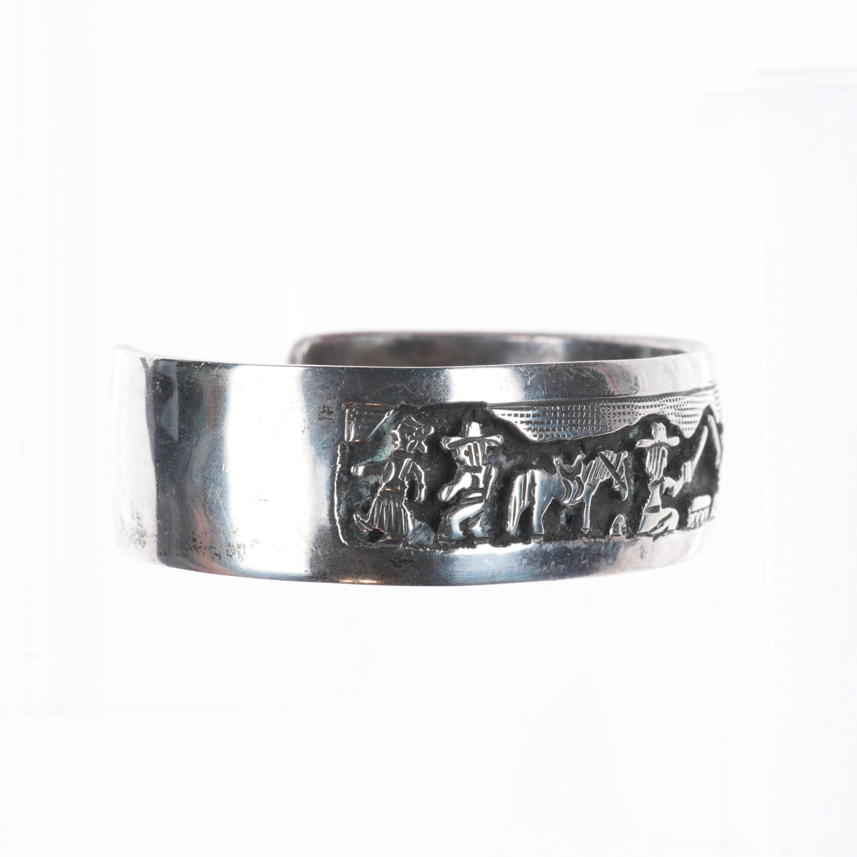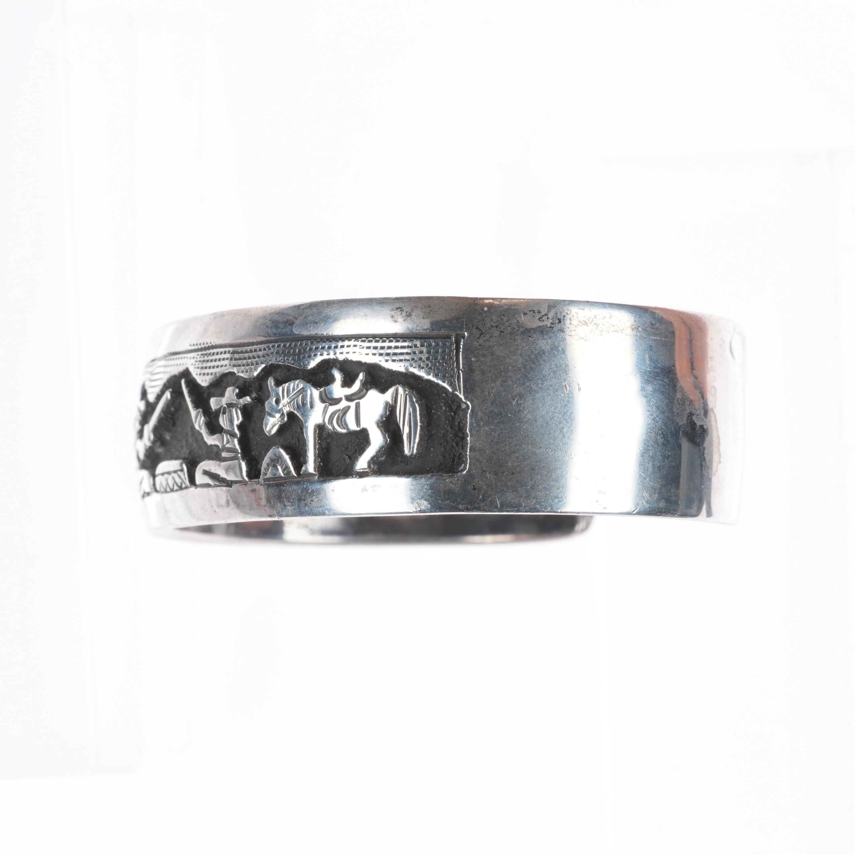 7" Tom & Sylvia Kee Navajo sterling silver storyteller cuff bracelet. Tested and guaranteed solid sterling silver with weight and measurements in pictures. Circa last quarter of the 20th century with age appropriate wear..