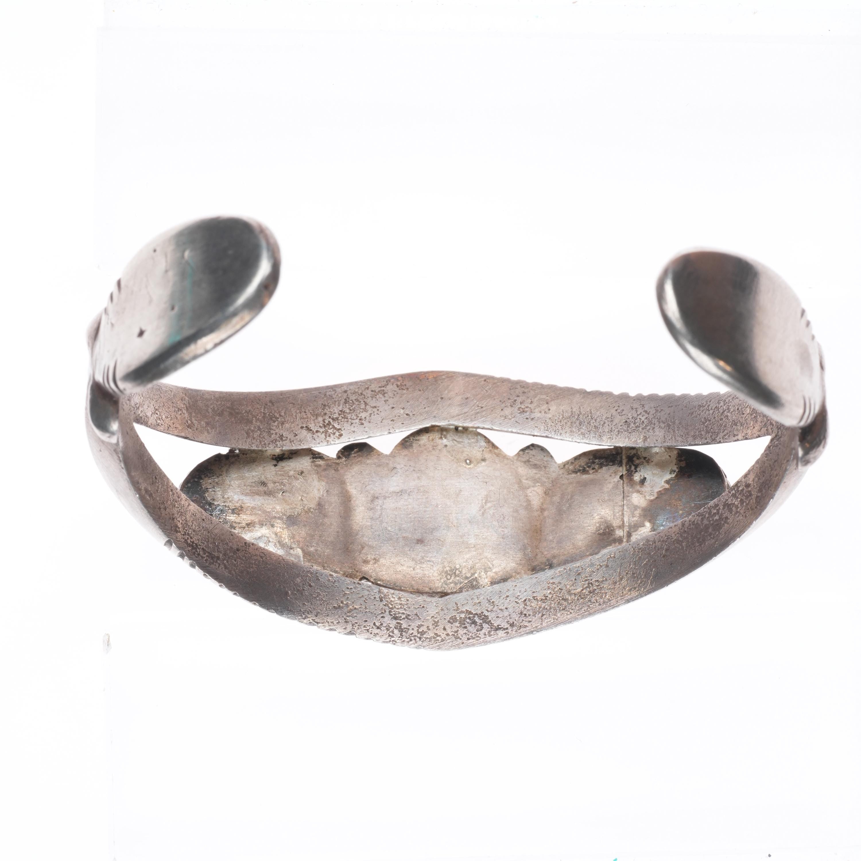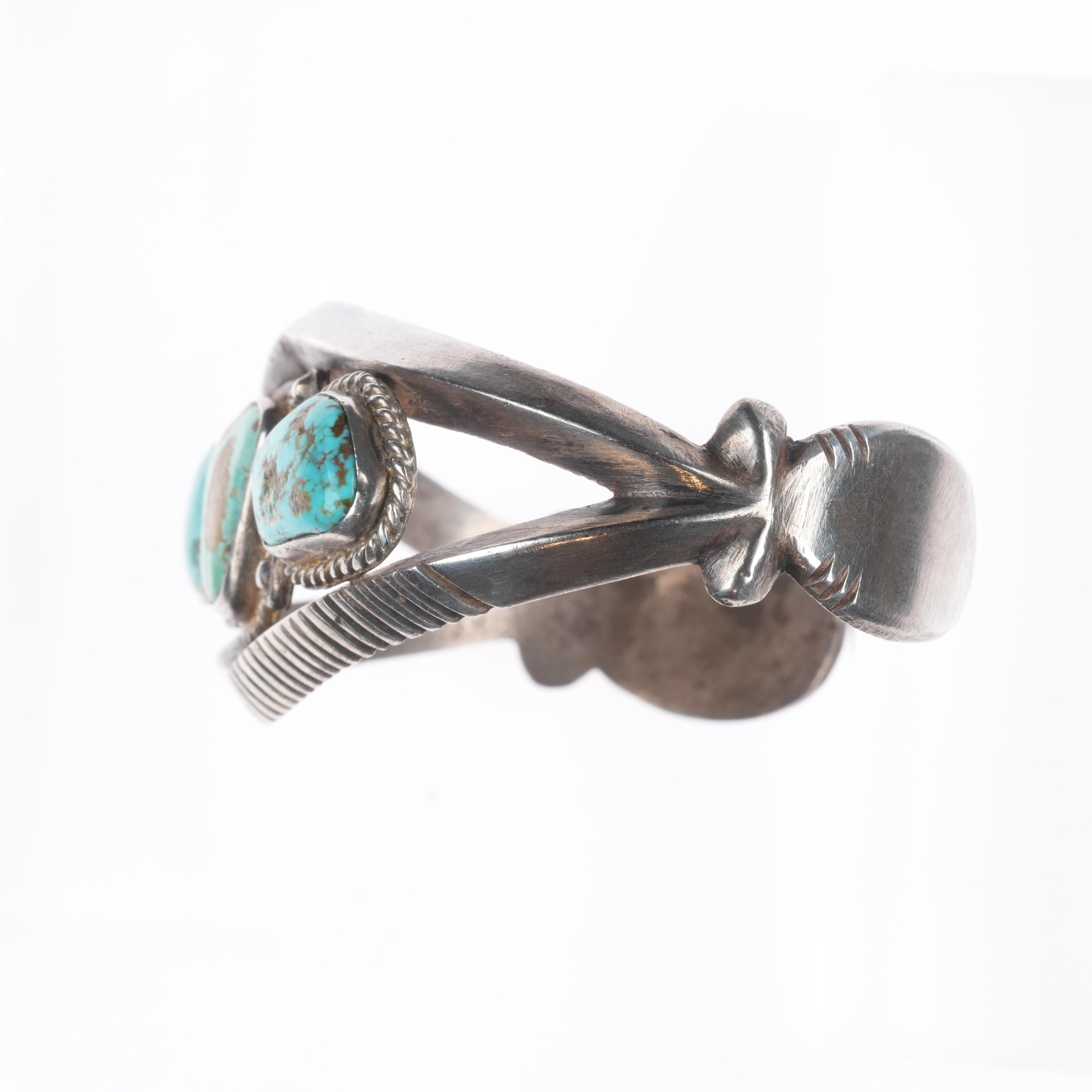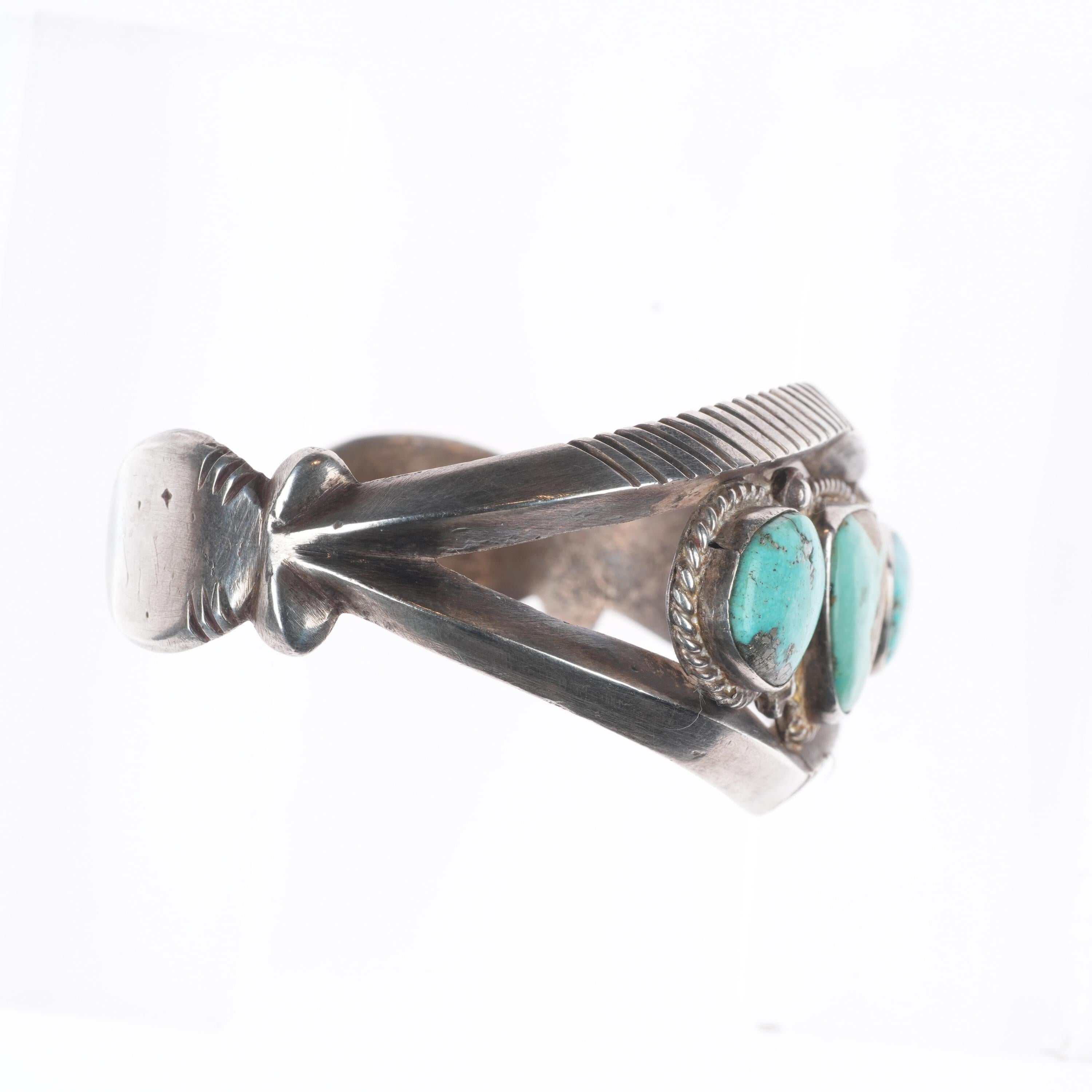 7" Vintage Navajo or Zuni sterling silver chiseled cast turquoise cuff bracelet. Tested and guaranteed solid sterling silver with weight and measurements in pictures. Circa mid 20th century with age appropriate wear..
