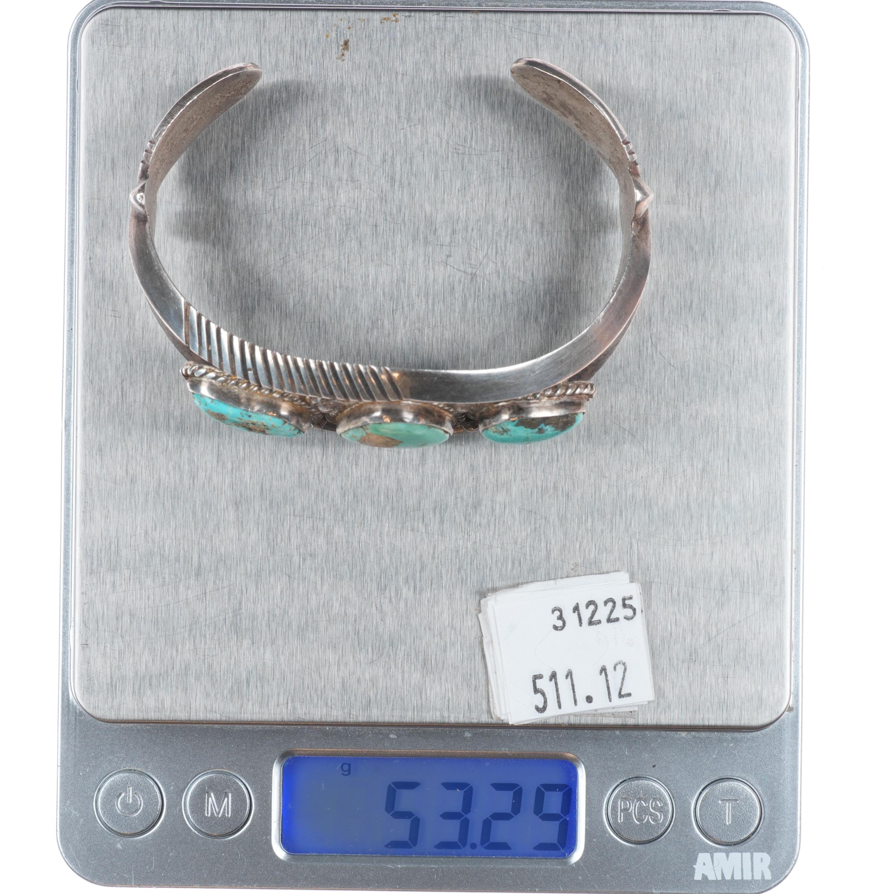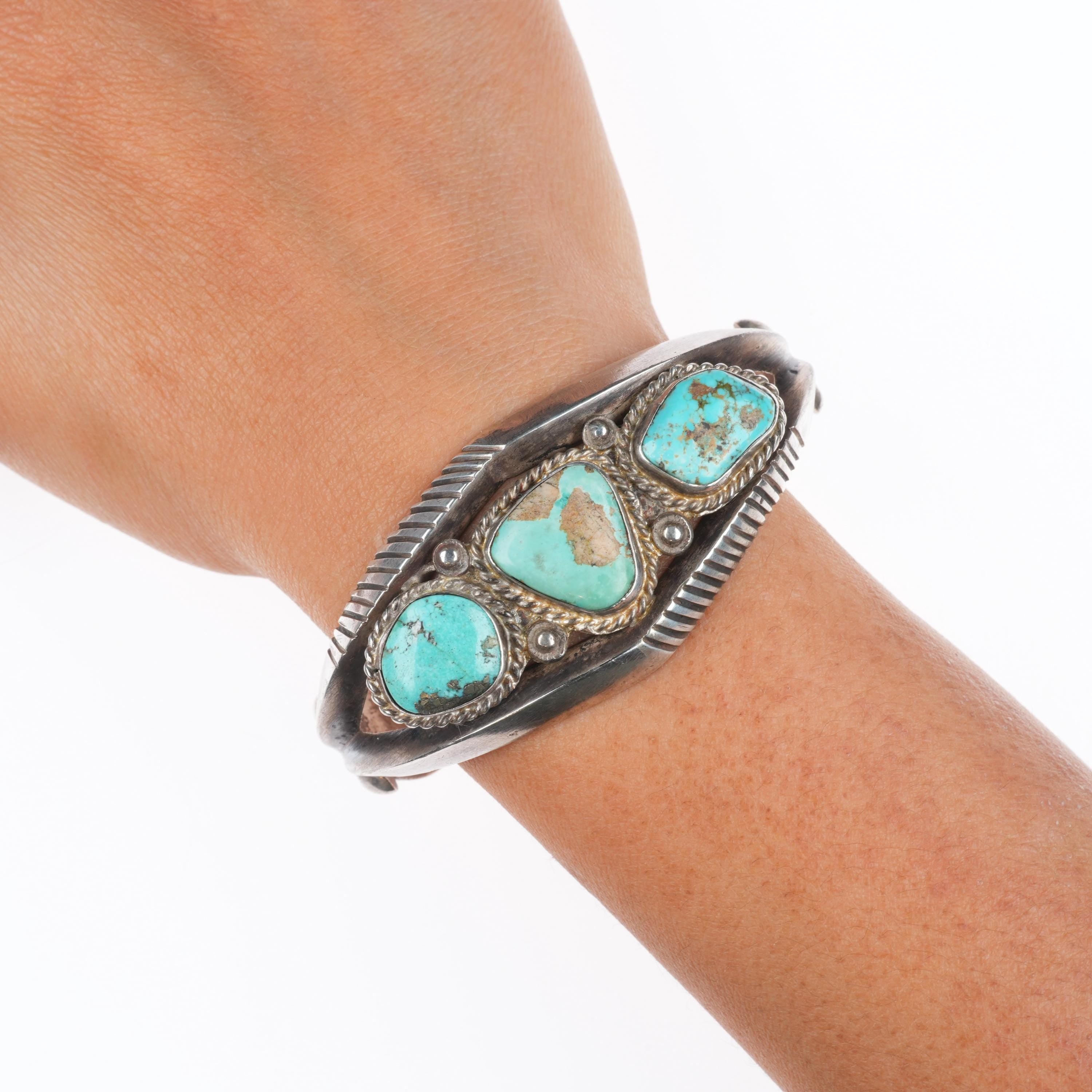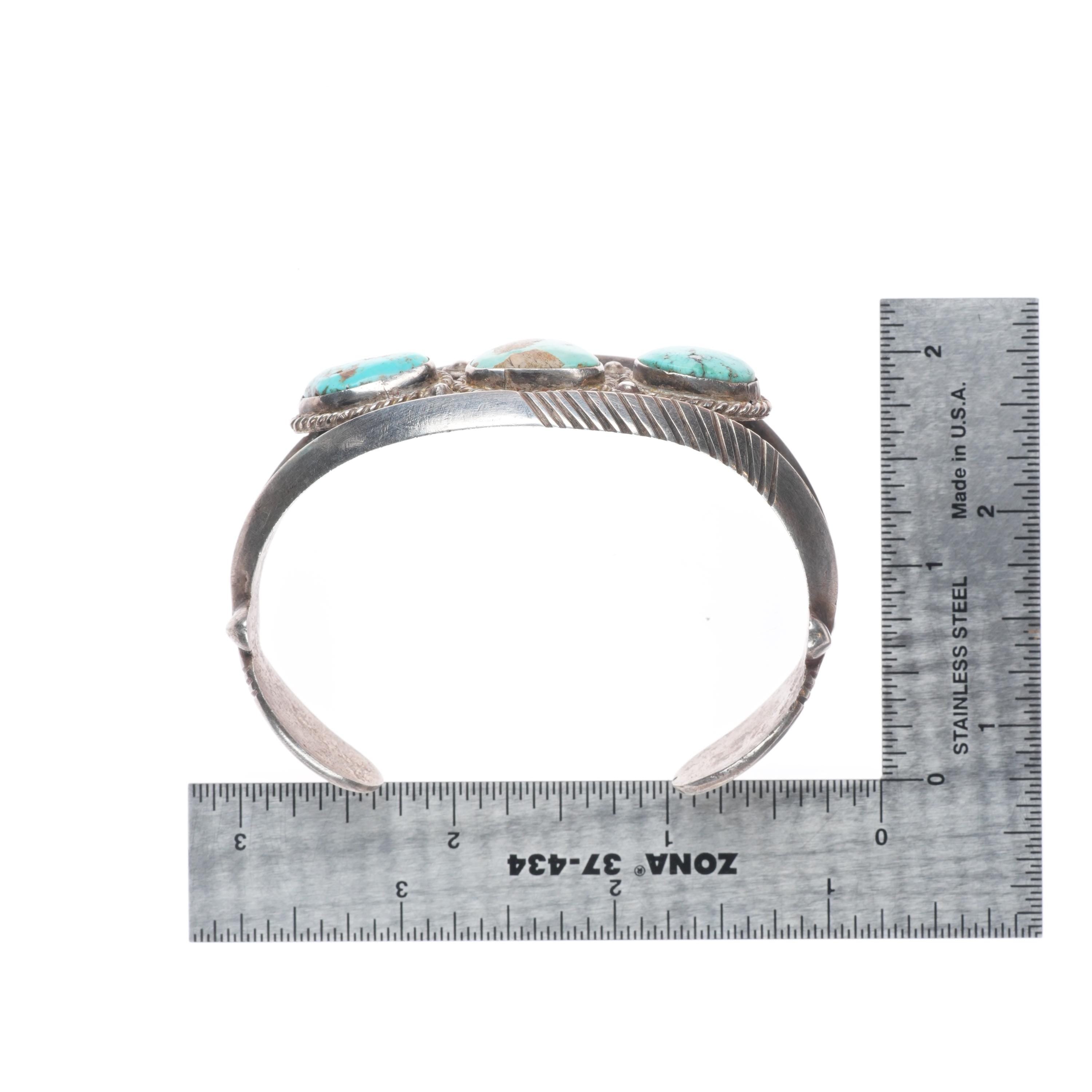 7" Vintage Navajo or Zuni sterling silver chiseled cast turquoise cuff bracelet. Tested and guaranteed solid sterling silver with weight and measurements in pictures. Circa mid 20th century with age appropriate wear..